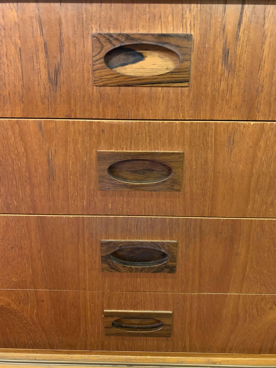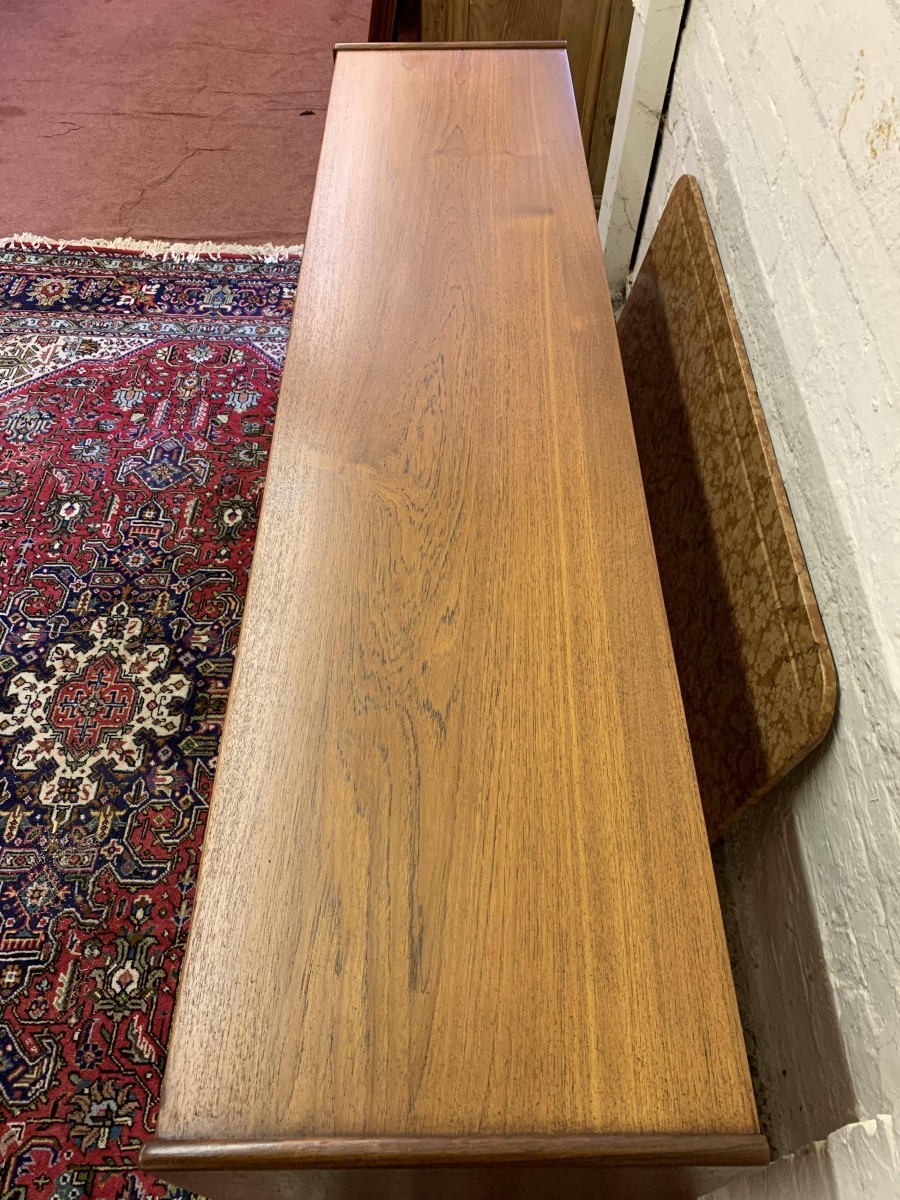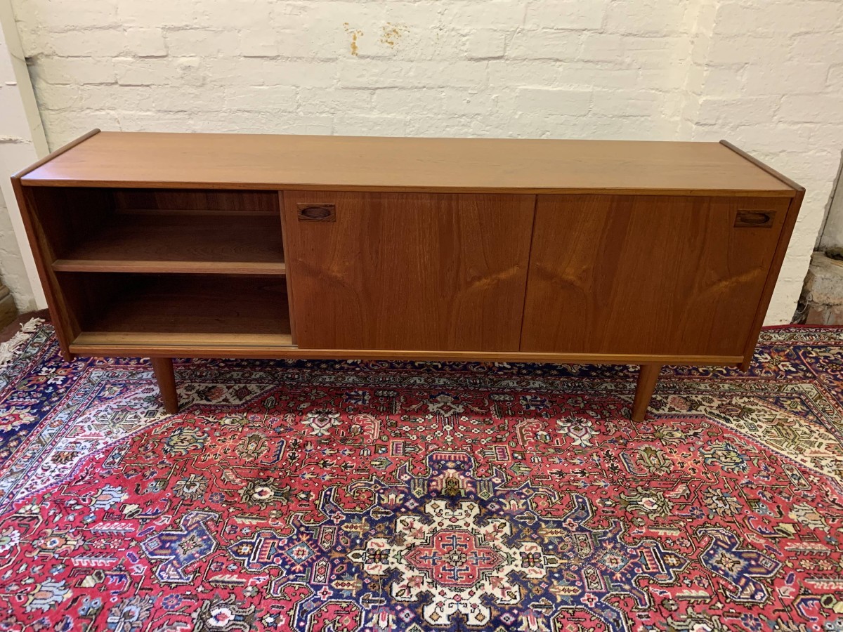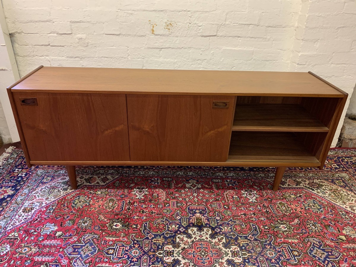 This beautifully designed teak sideboard was manufactured in Denmark by Morgen Kohl MK. The sideboard is in excellent condition, the grain of the teak is exceptional. The four easy sliding central drawers each have a stylish teak finger handle. To the sides are a pair of sliding cupboard doors, each door slides open to reveal a removable shelf. This retro sideboard stands on four turned legs.