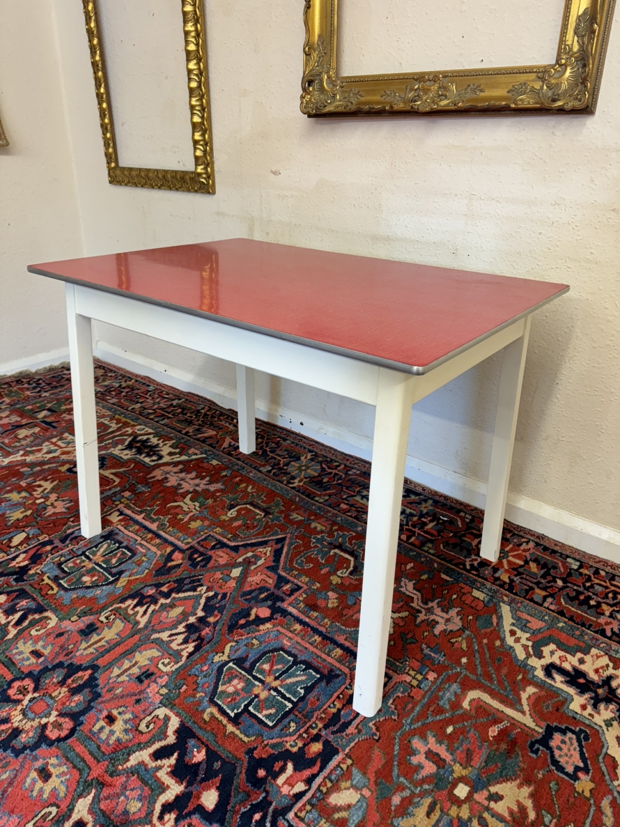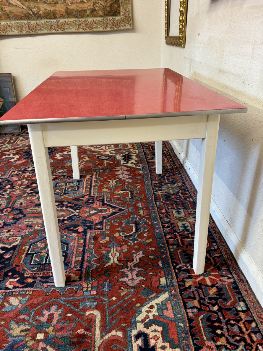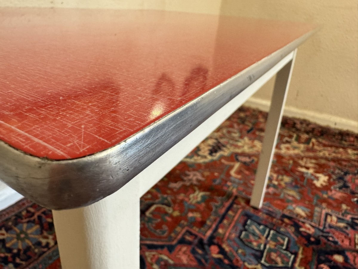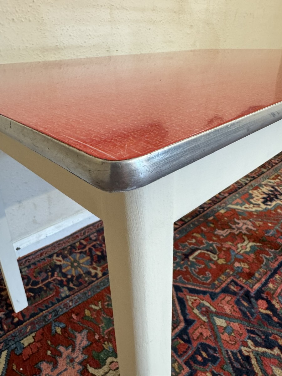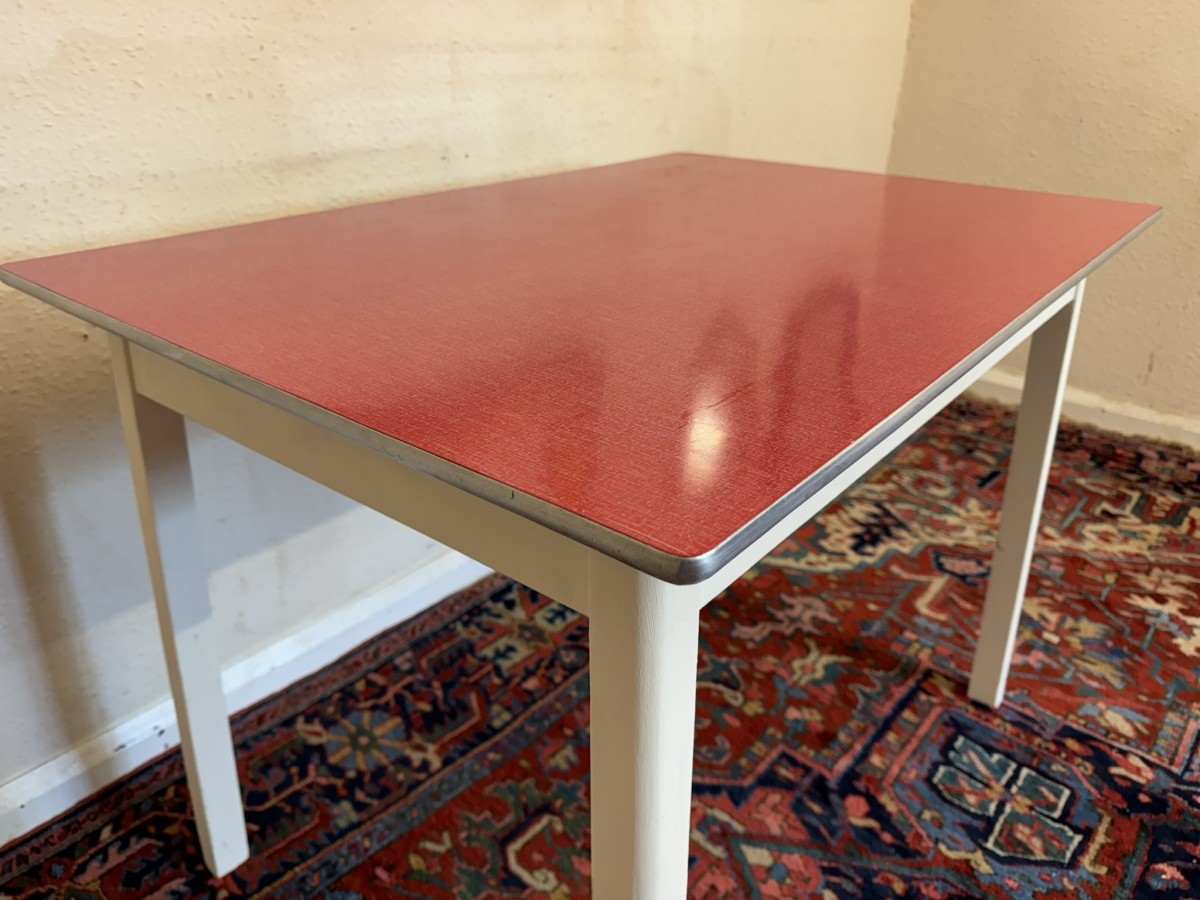 The table has a red formica top with a chrome edge. The table stands on four tall legs.