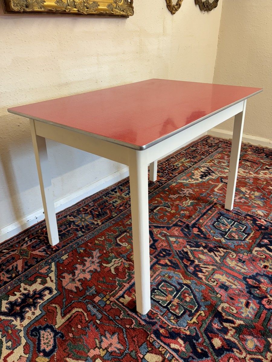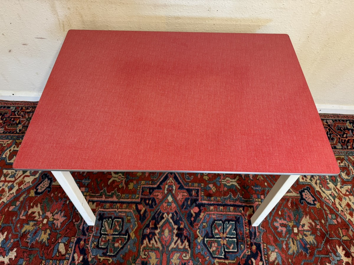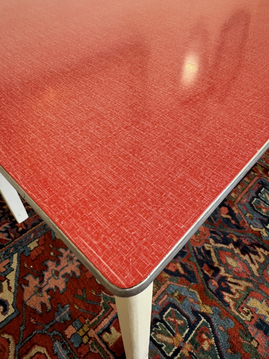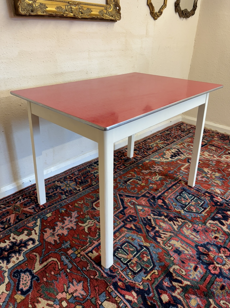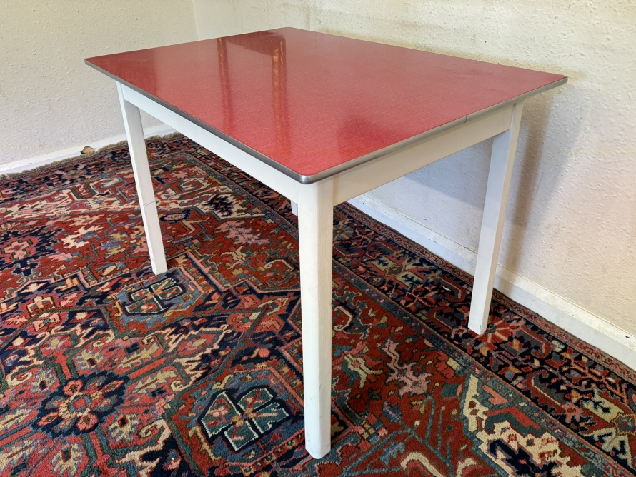 The table has a red formica top with a chrome edge. The table stands on four tall legs.