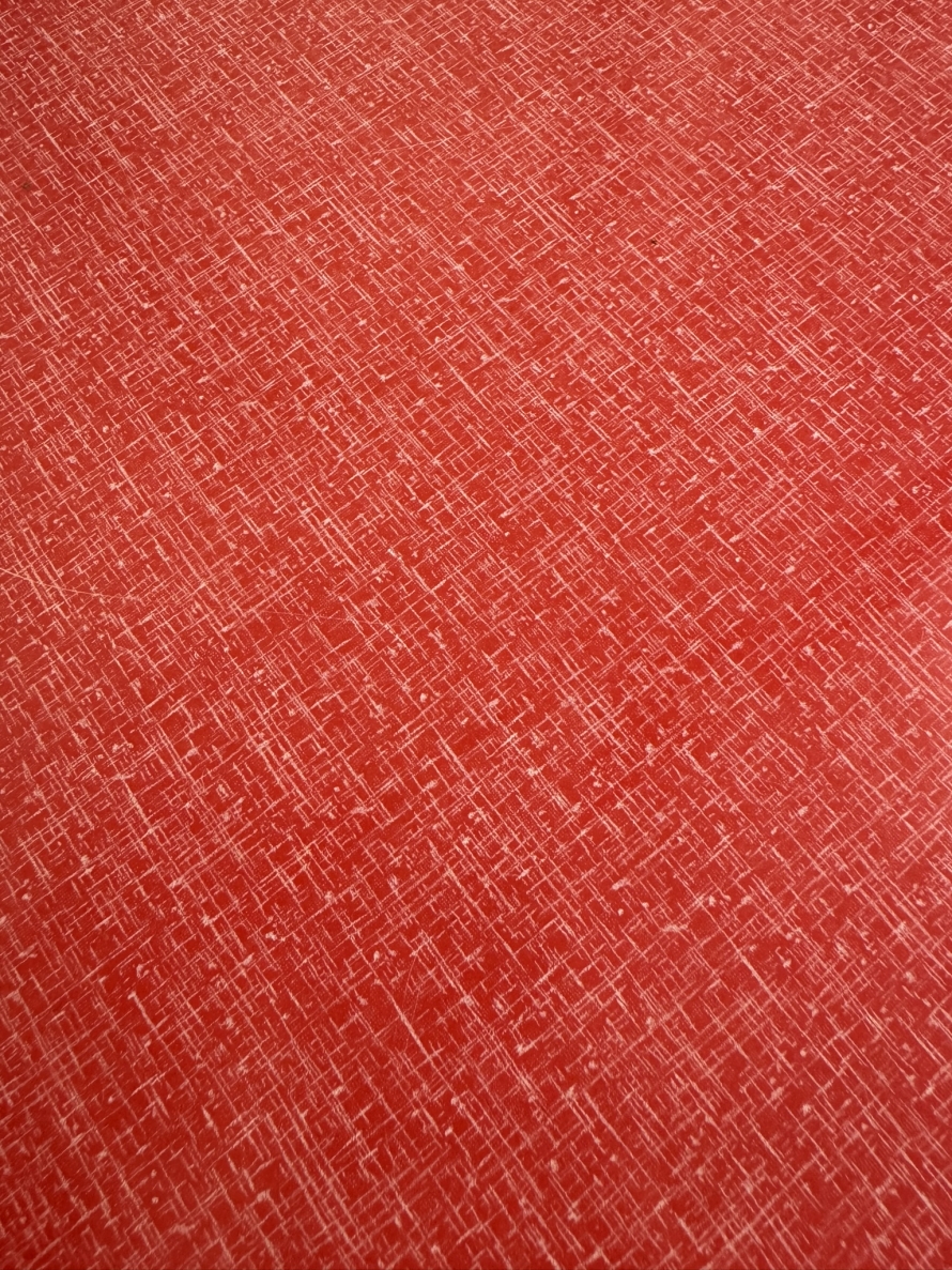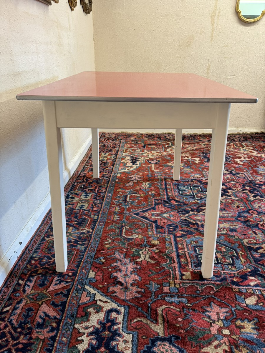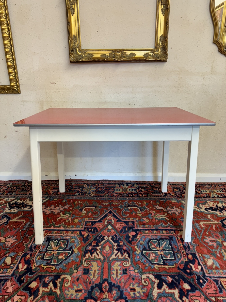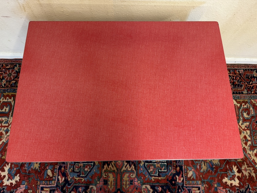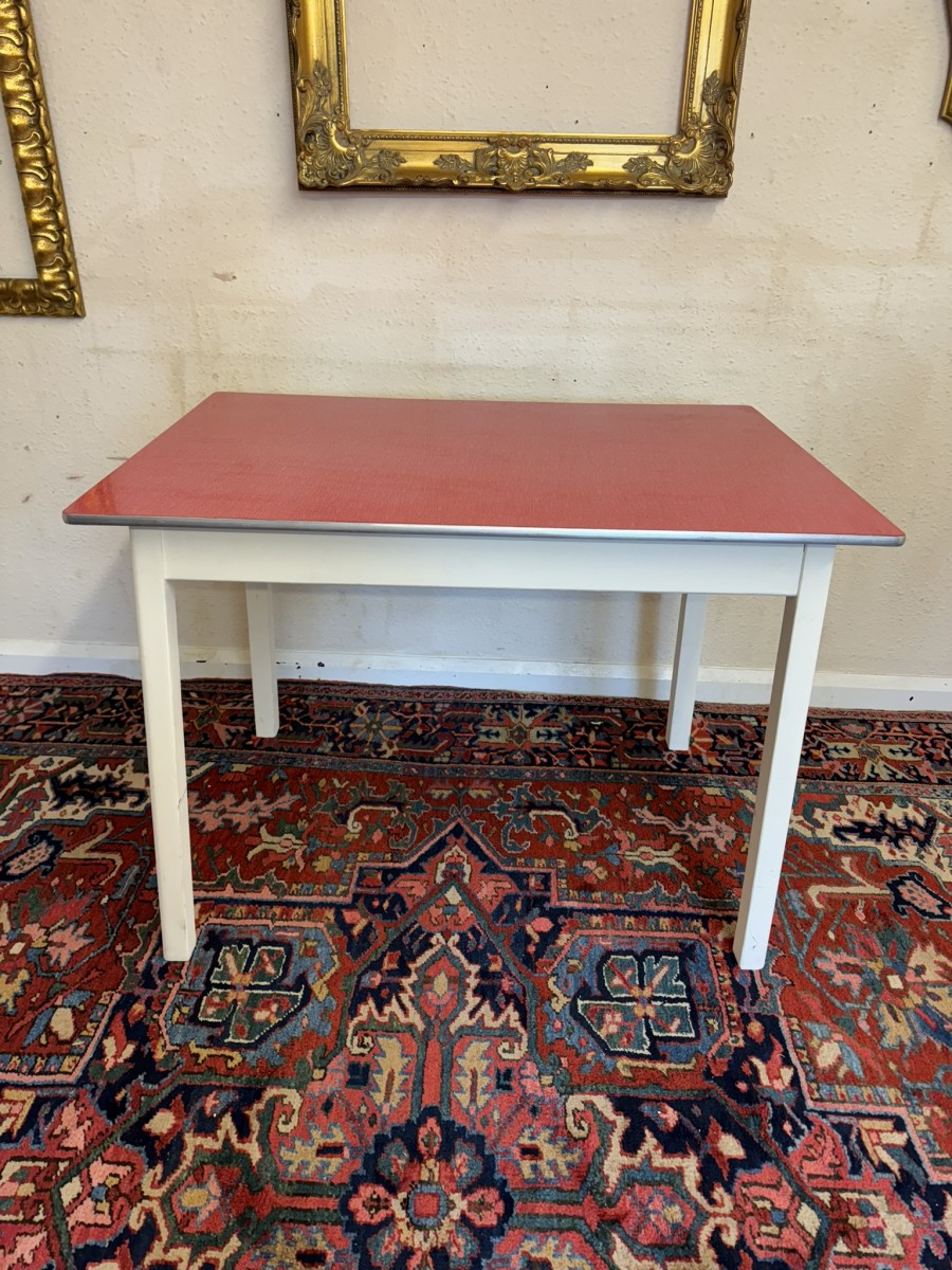 The table has a red formica top with a chrome edge. The table stands on four tall legs.