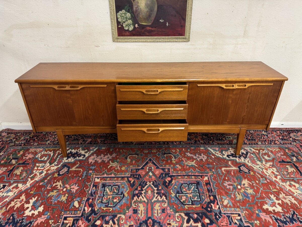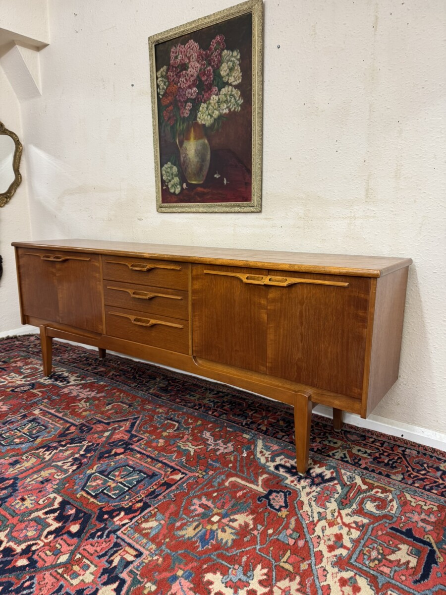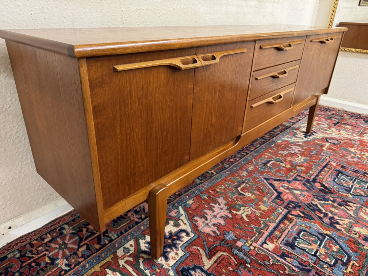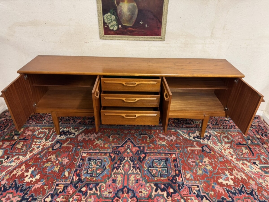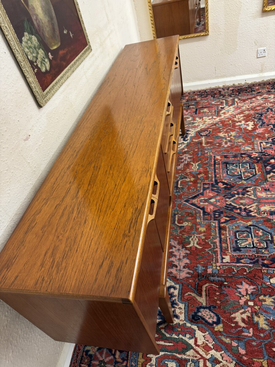 This fabulous sideboard dates circa 1960’s and is a fabulous example of mid century retro teak furniture. The moulding edged top sits above three central drawers, the top drawer has a cutlery drawer. Each drawer having a stylish designed handle. To the left-hand and right-hand side of the drawers are a pair of cupboard doors, each door having a stylish handle. The cupboard doors open to reveal a wooden shelf. This fabulous sideboard stands on four tapered legs with brass capped feet.