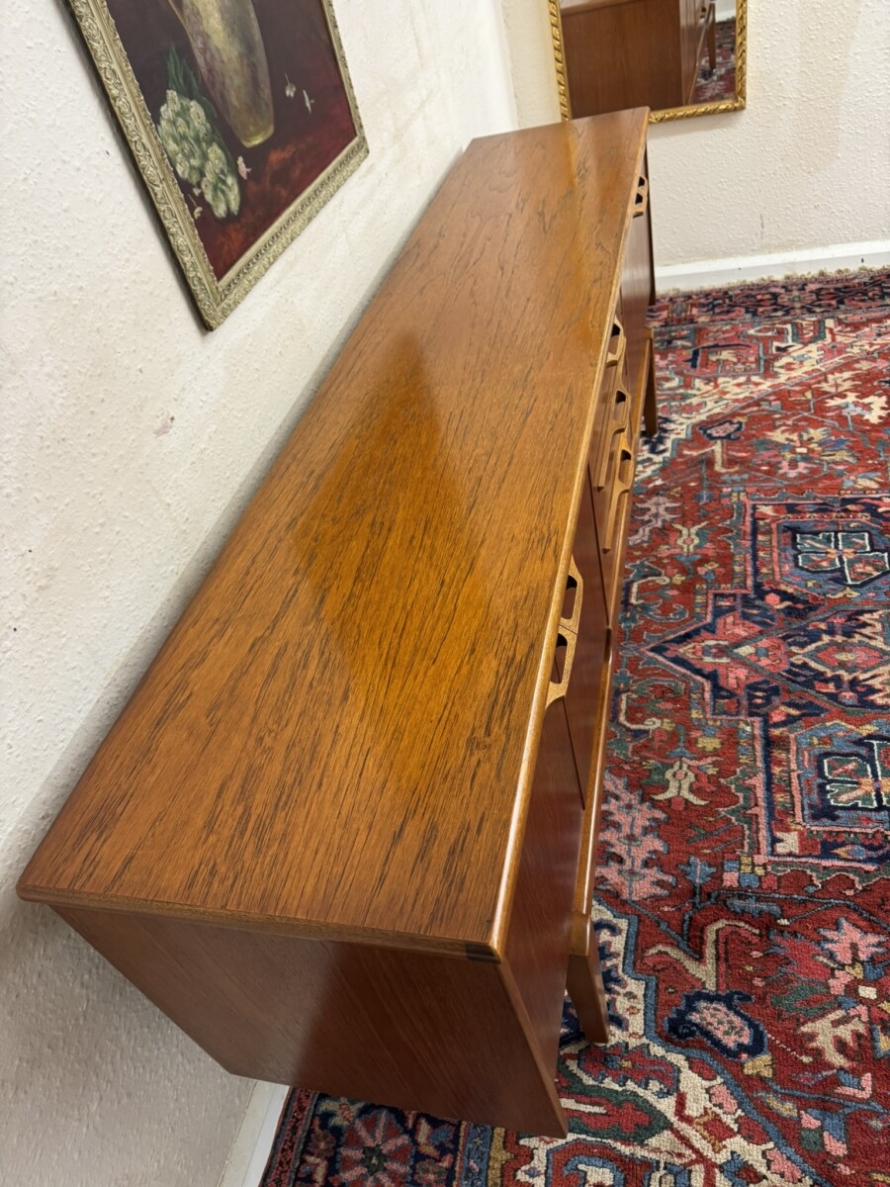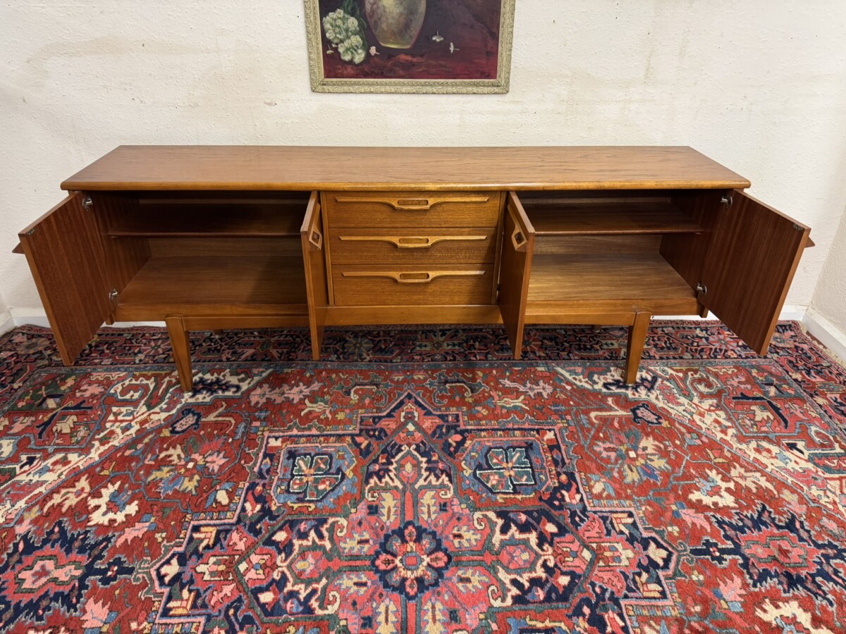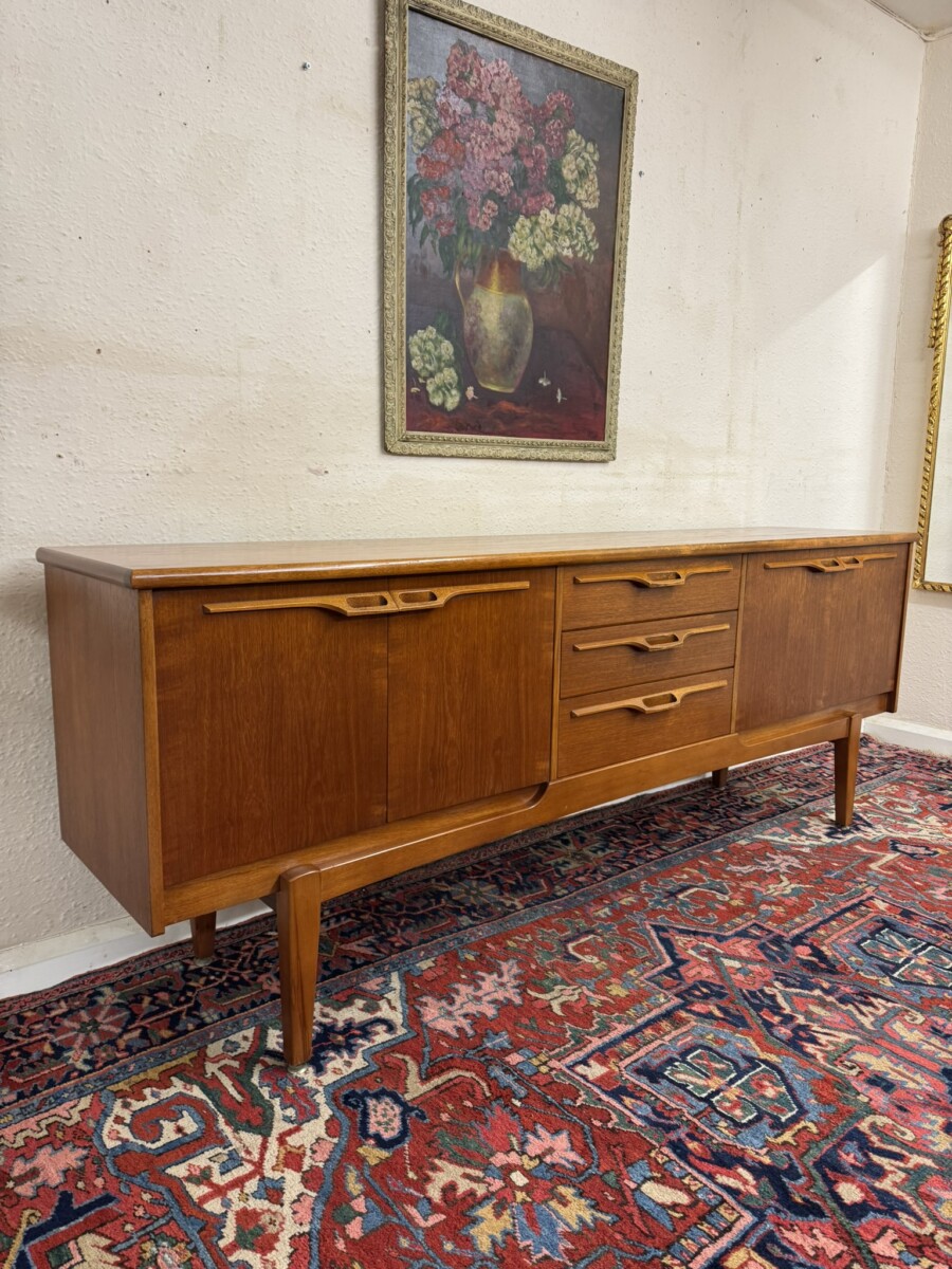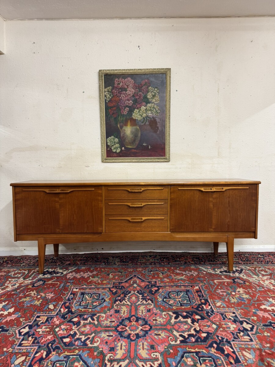 This fabulous sideboard dates circa 1960’s and is a fabulous example of mid century retro teak furniture. The moulding edged top sits above three central drawers, the top drawer has a cutlery drawer. Each drawer having a stylish designed handle. To the left-hand and right-hand side of the drawers are a pair of cupboard doors, each door having a stylish handle. The cupboard doors open to reveal a wooden shelf. This fabulous sideboard stands on four tapered legs with brass capped feet.