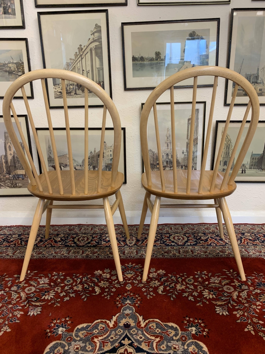 Oozing Mid Century sytle this pair of Ercol chairs are in excellent condtion. Produced by the renowned “Ercol” furntiure makers in the 1950's. These windsor chairs have abeech spindle backrest, elm shaped seat with hammered shaft joints. The chairs stand on four turned legs with turned stretcher supports.