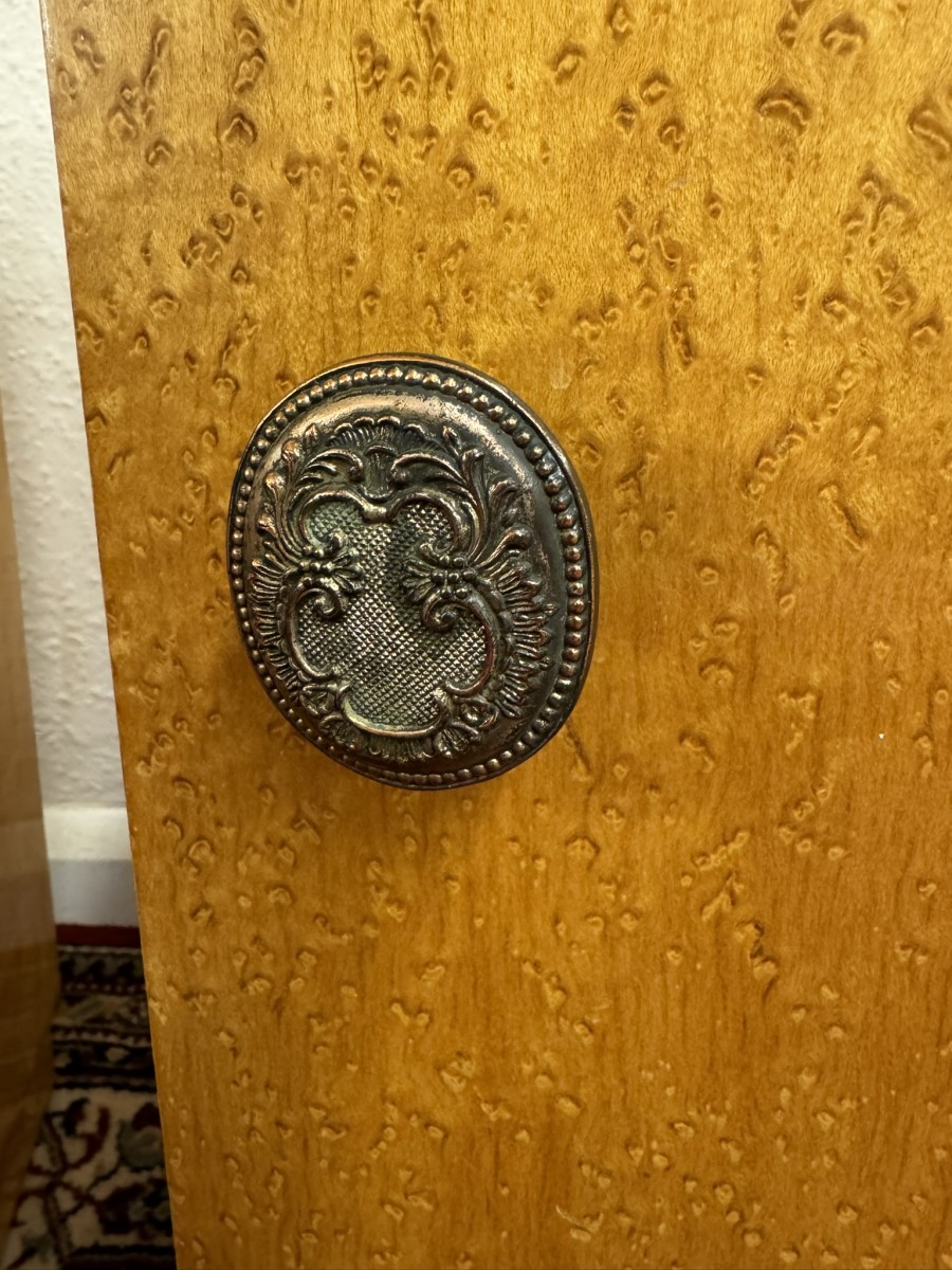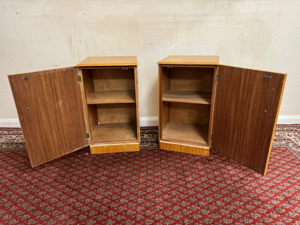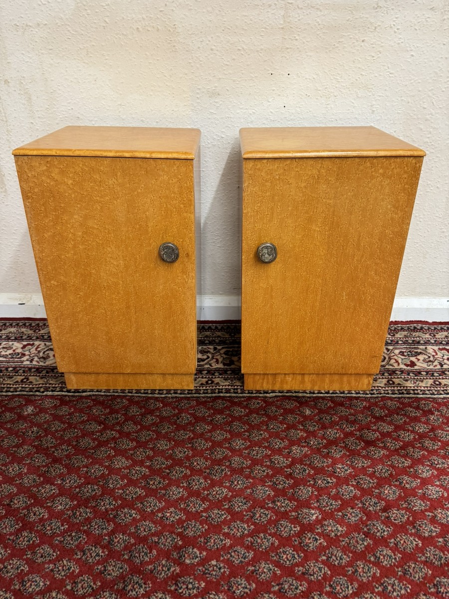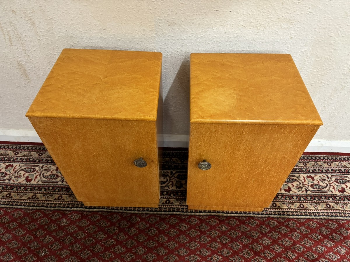 Each cabinet made in striking birds eye maple has a decorative handle which opens to reveal a shelf. Each cabinet sits on a platform base.