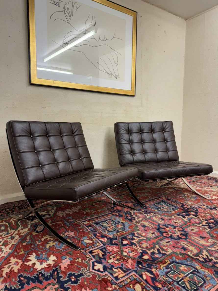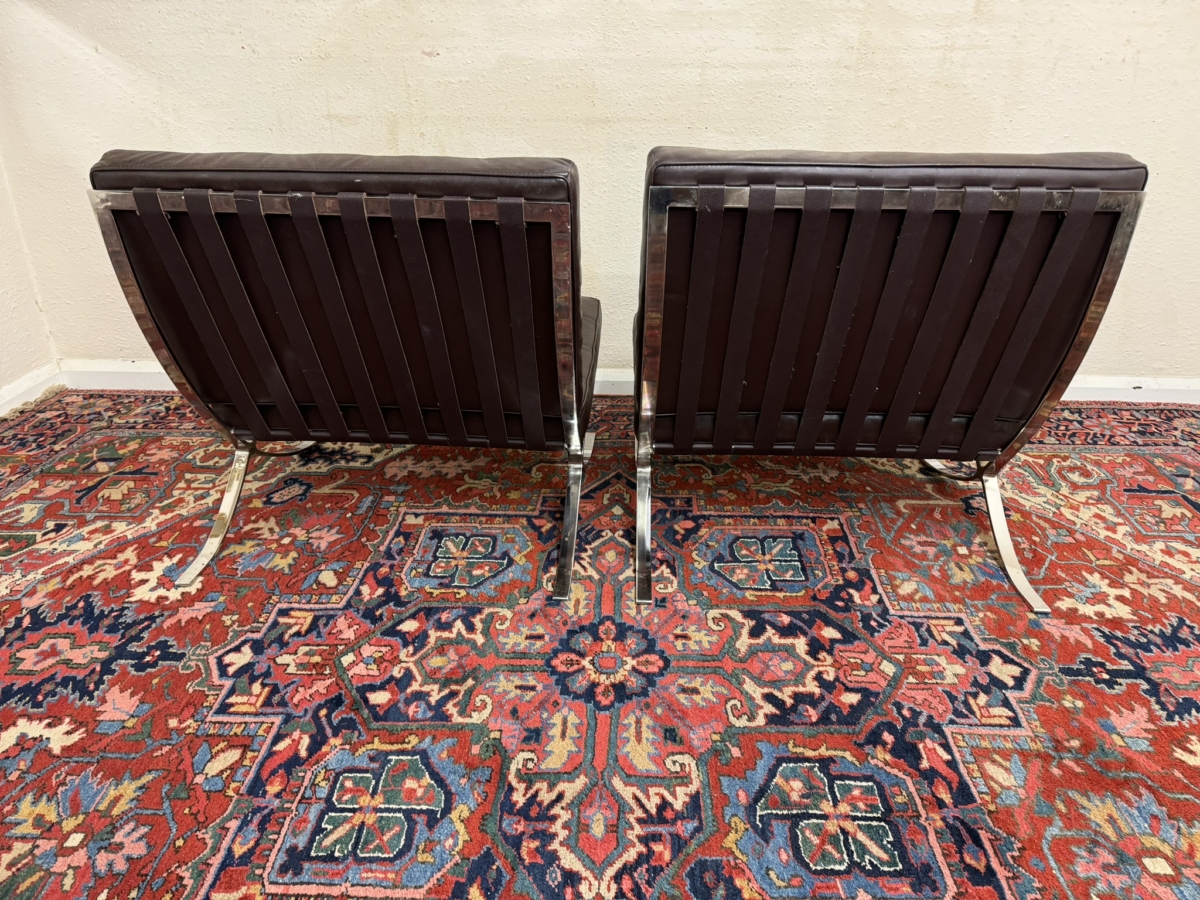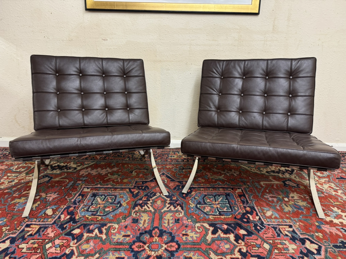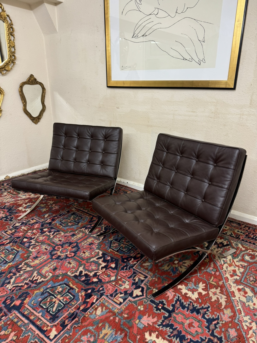 This iconic pair of Barcelona chairs show style and quality. Brown leather buttoned back and seat pad and standing on four curved chrome legs.