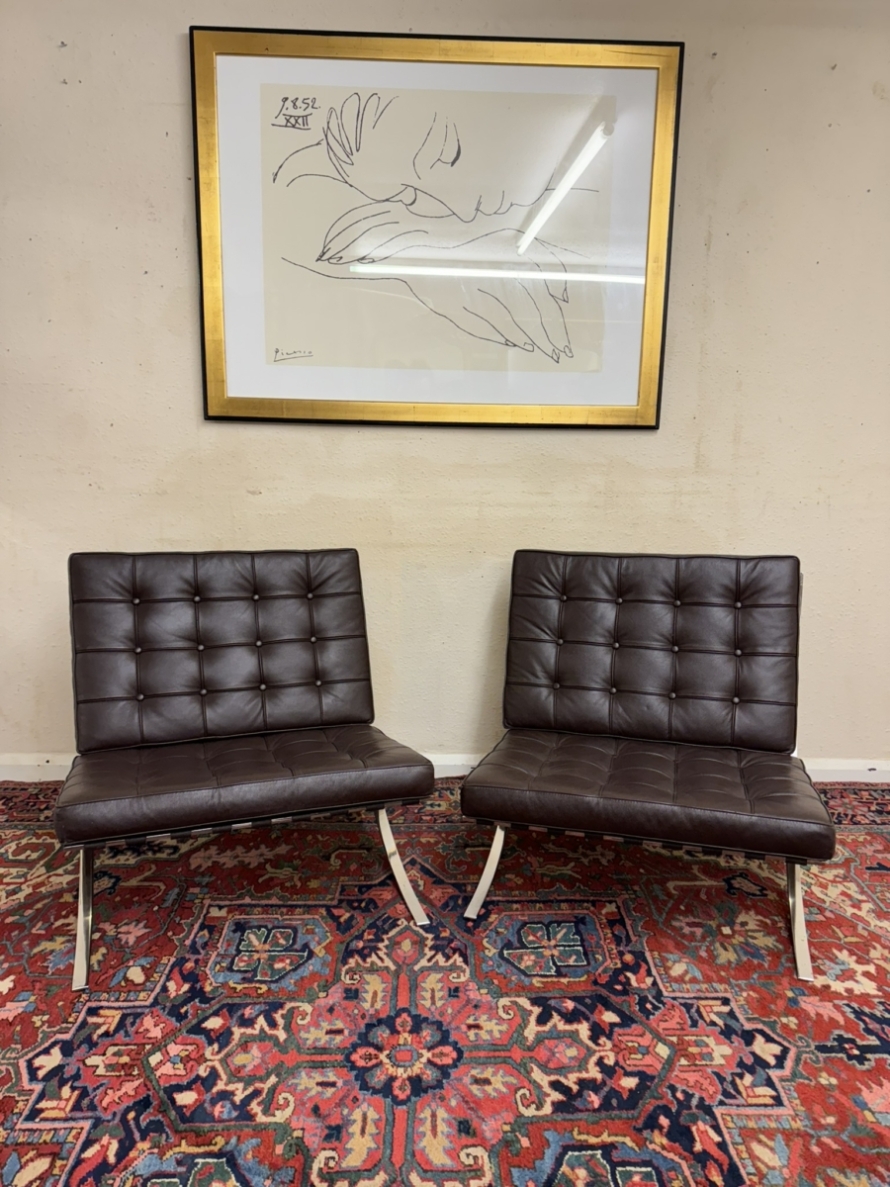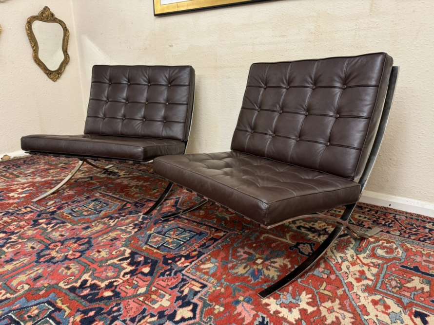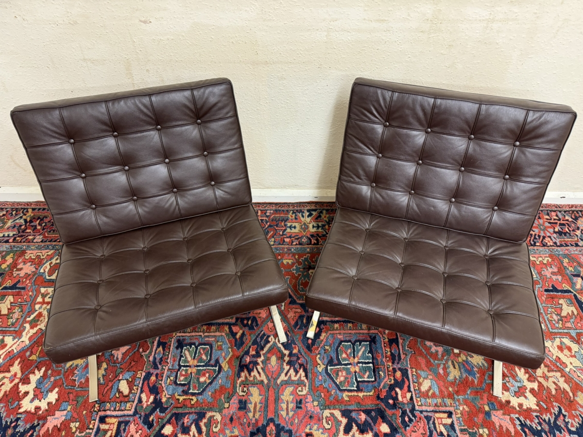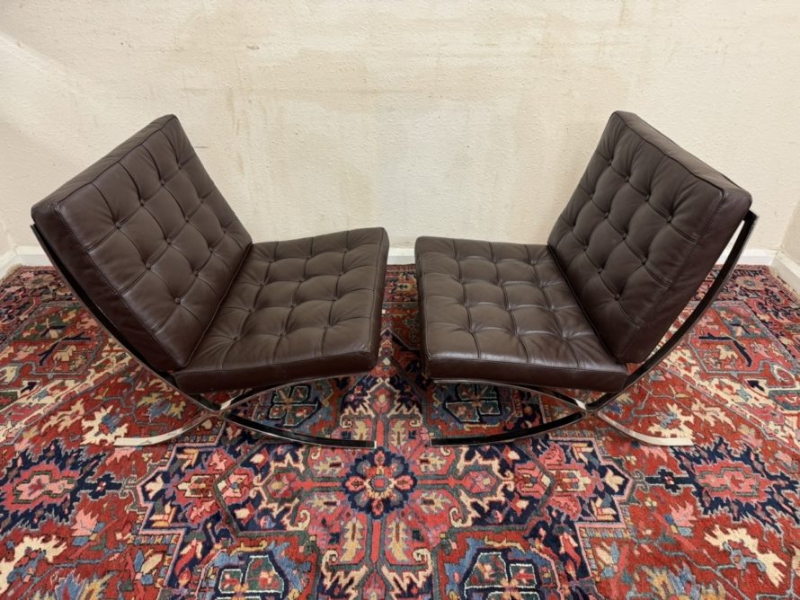 This iconic pair of Barcelona chairs show style and quality. Brown leather buttoned back and seat pad and standing on four curved chrome legs.