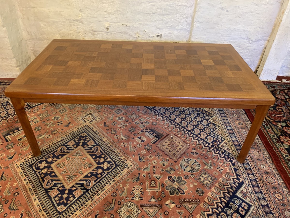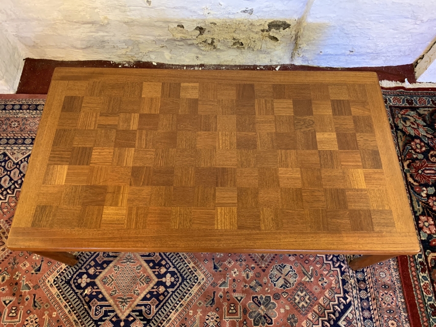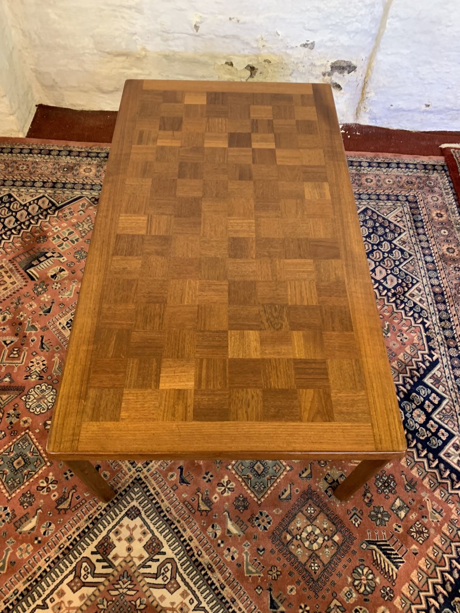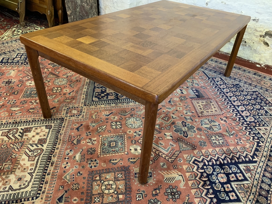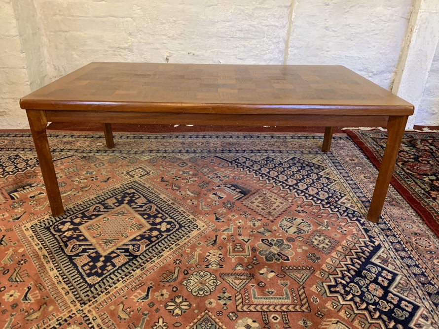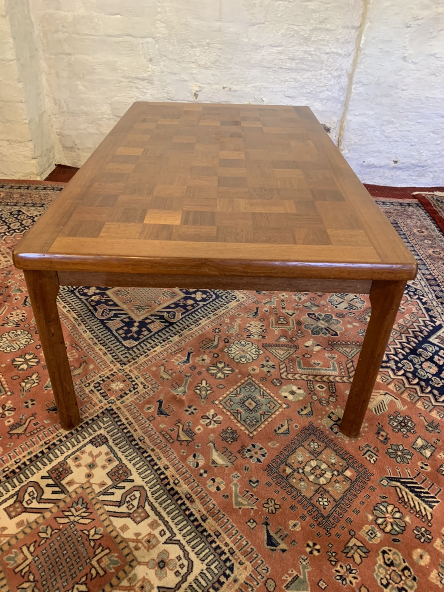 This fabulous retro coffee table is stamped underneath with the Danish makers mark. The coffee table has a parquetry top design and sits on four legs.