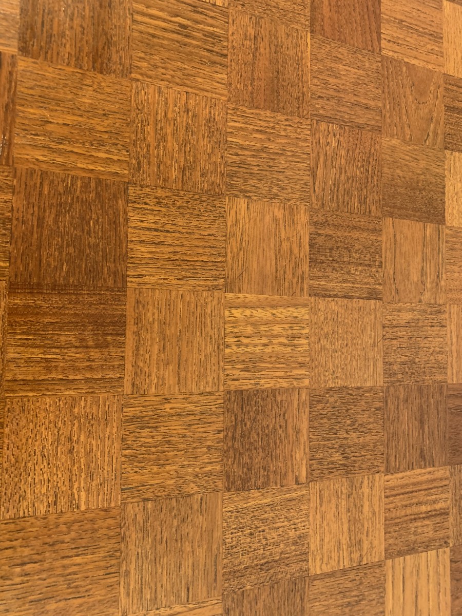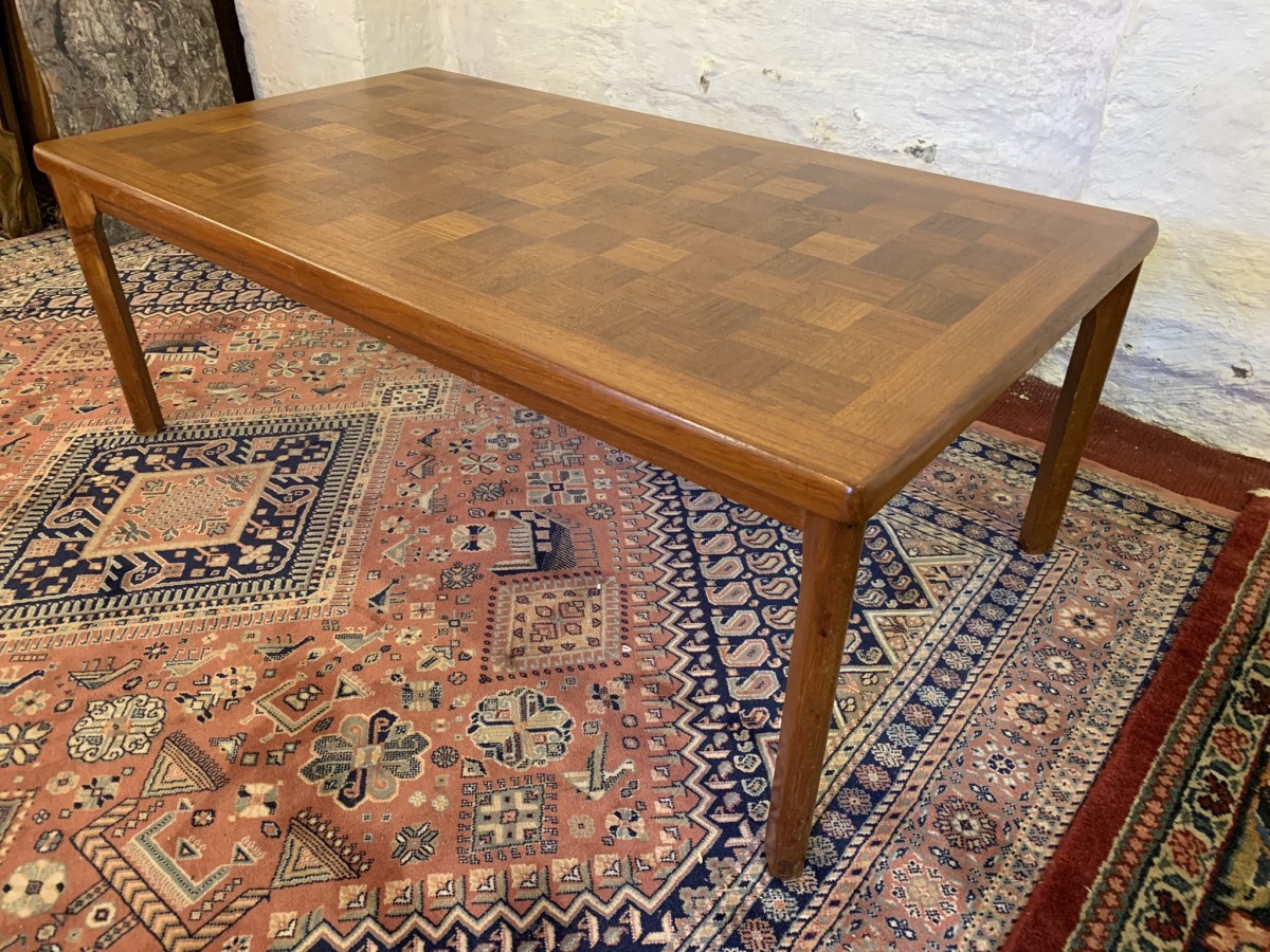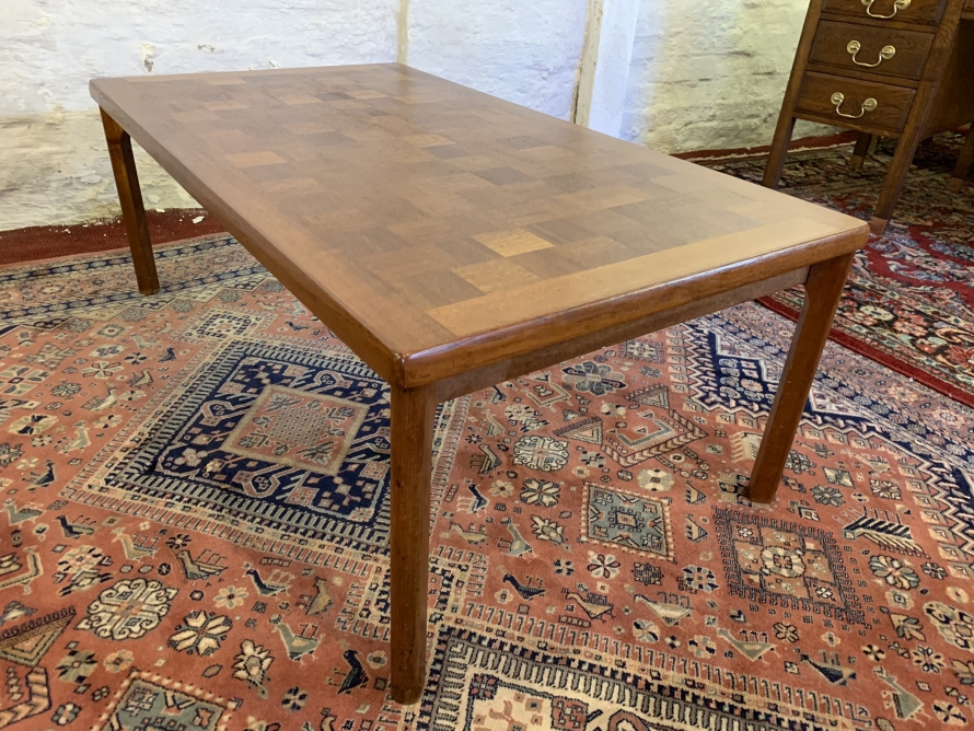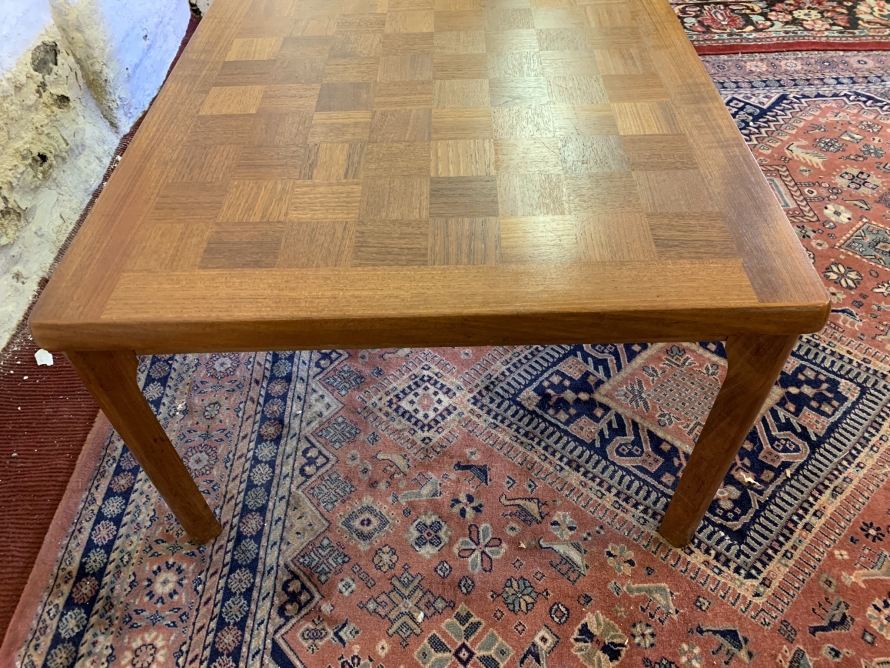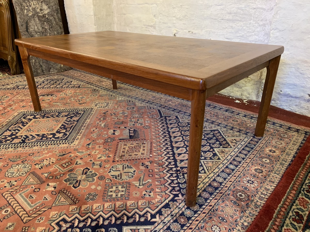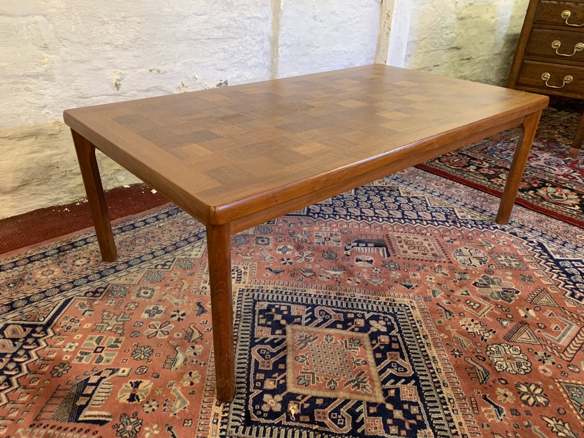 This fabulous retro coffee table is stamped underneath with the Danish makers mark. The coffee table has a parquetry top design and sits on four legs.