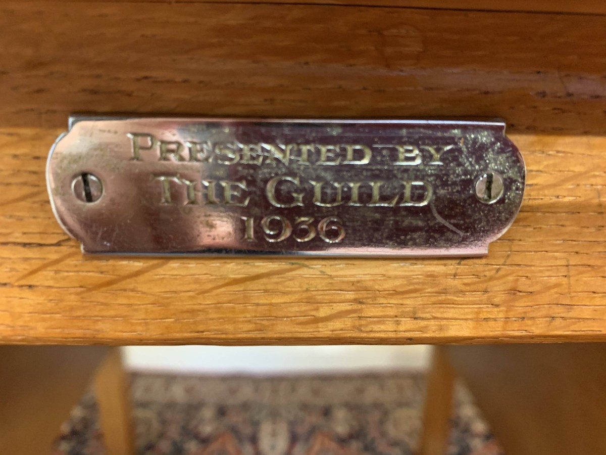 A super school desk which is both stylish and functional. The desk has a plaque which reads “Presented by The Guild 1936”