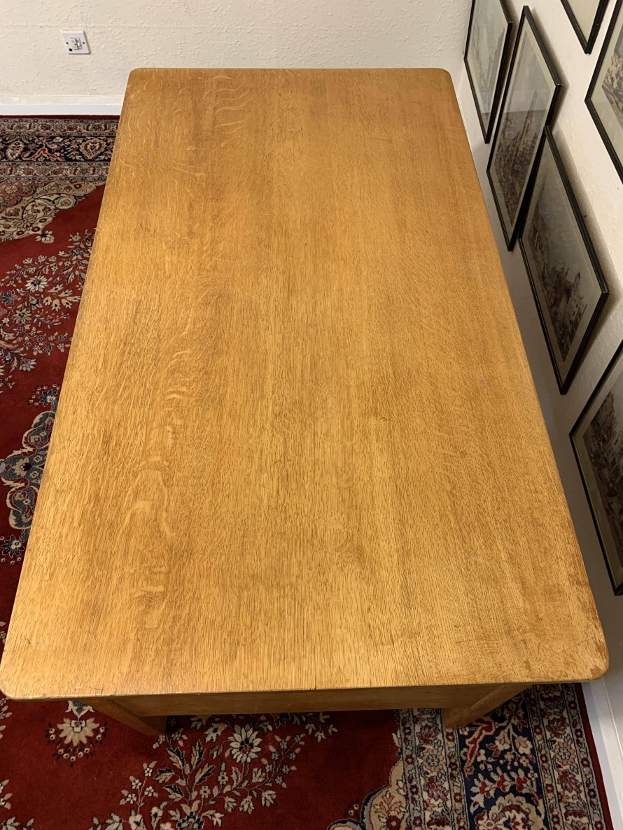 Offering a large working surface, the desk also has four storage drawers. The desk stands on eight legs.