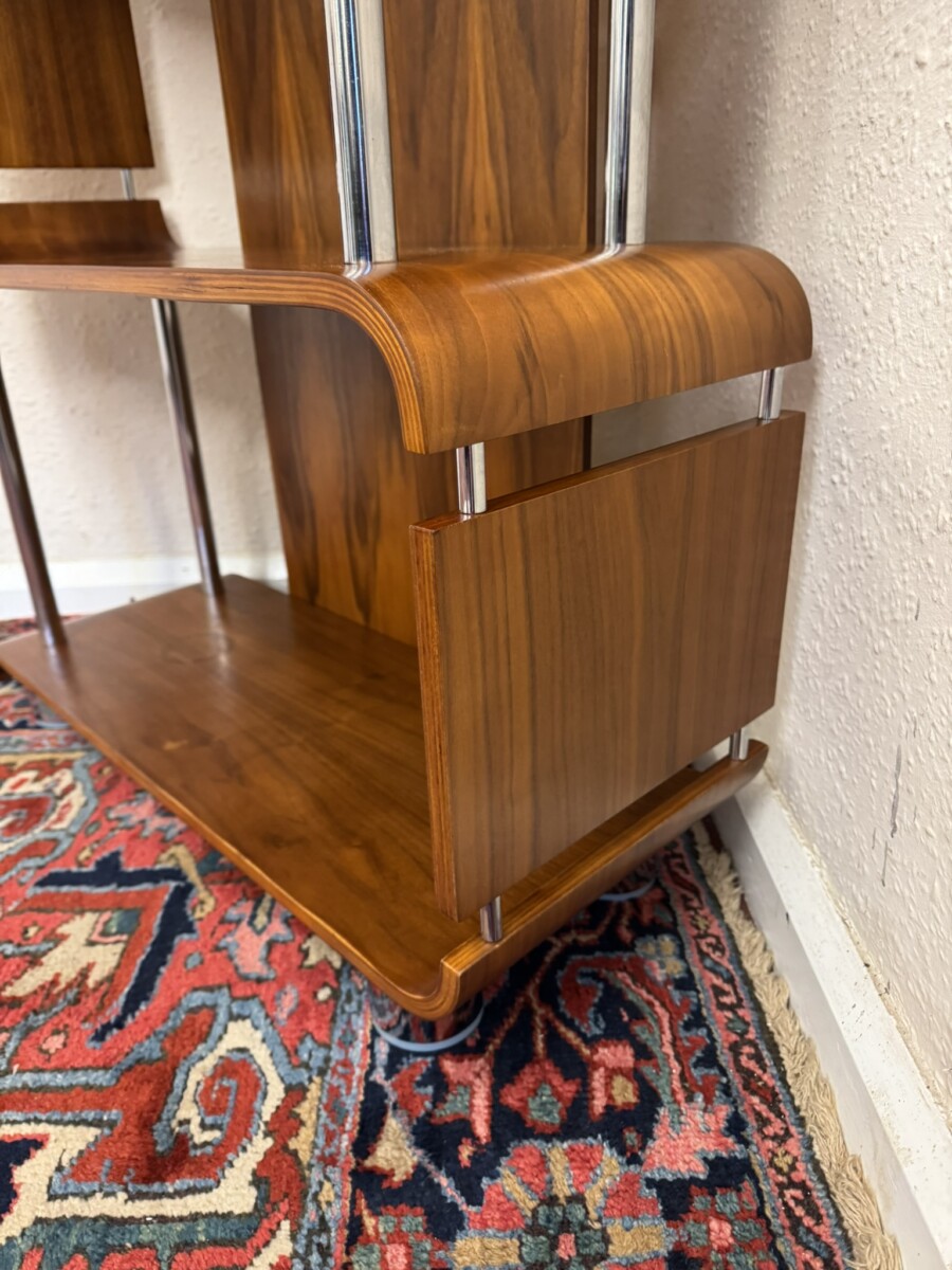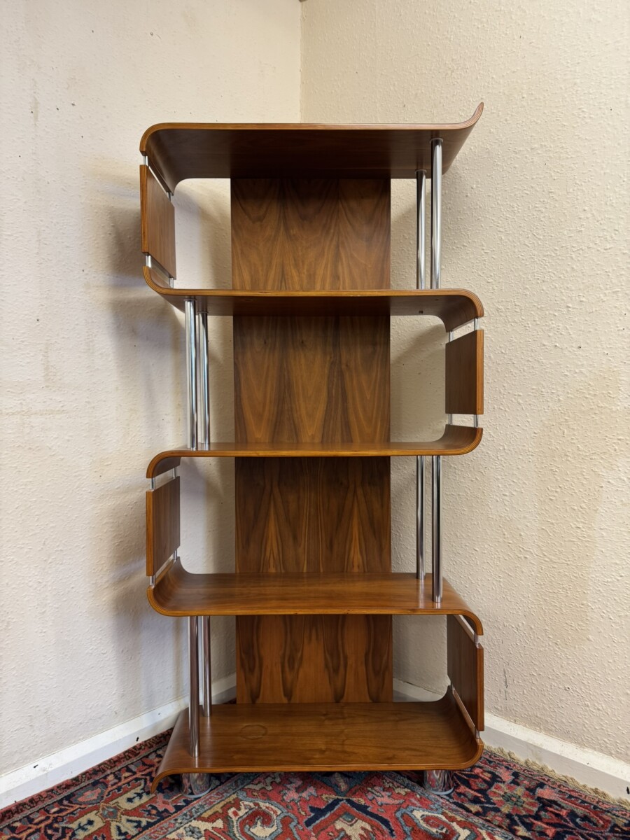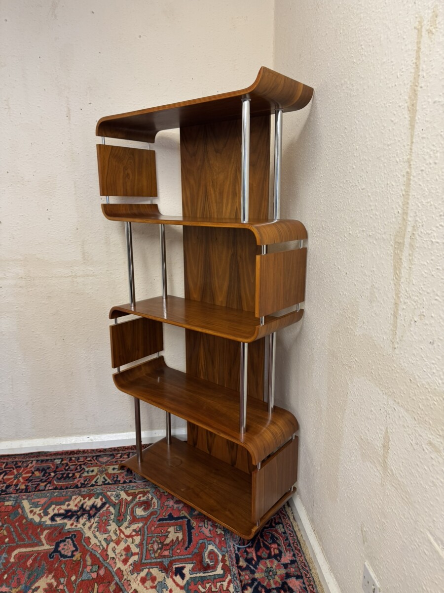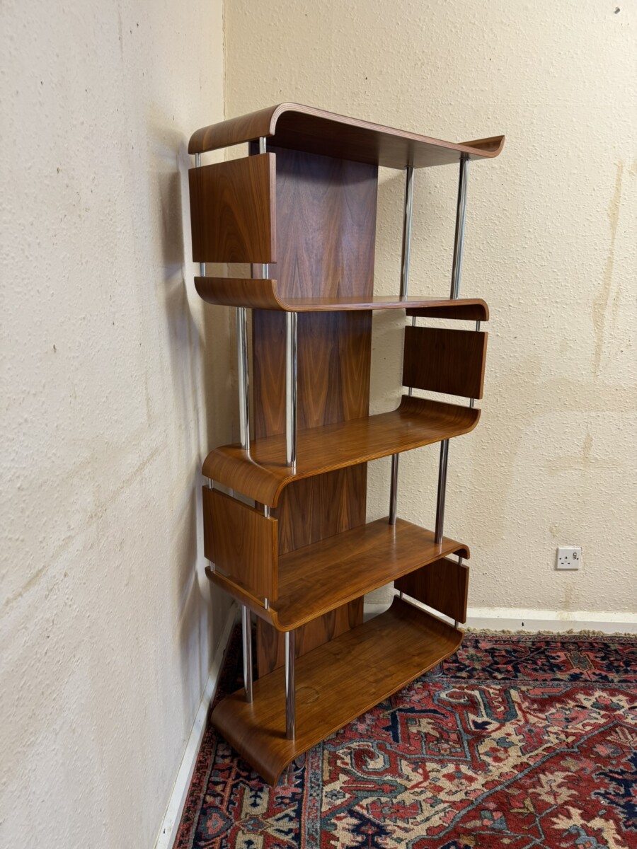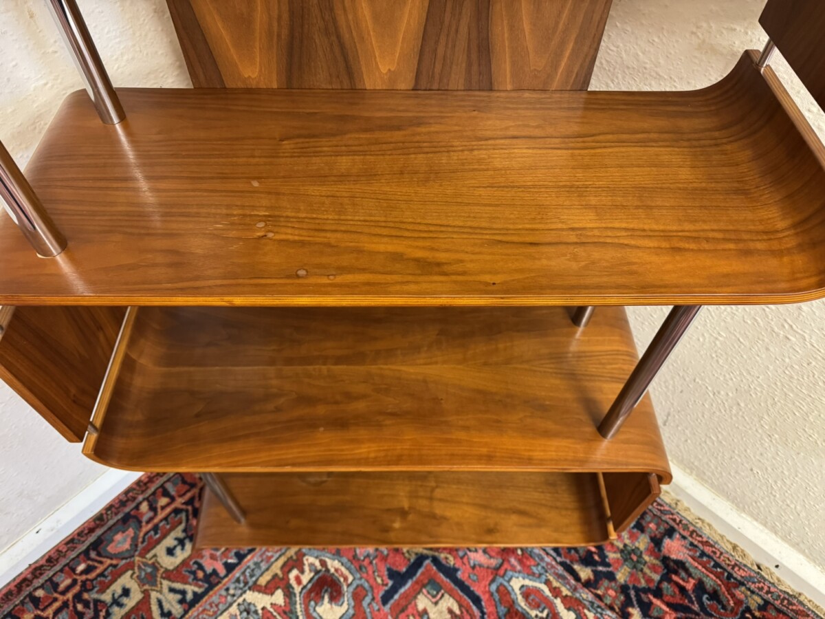 This cool room divider mixes stylish walnut bentwood shelving with polished chrome supports and feet.