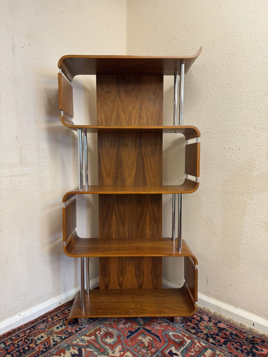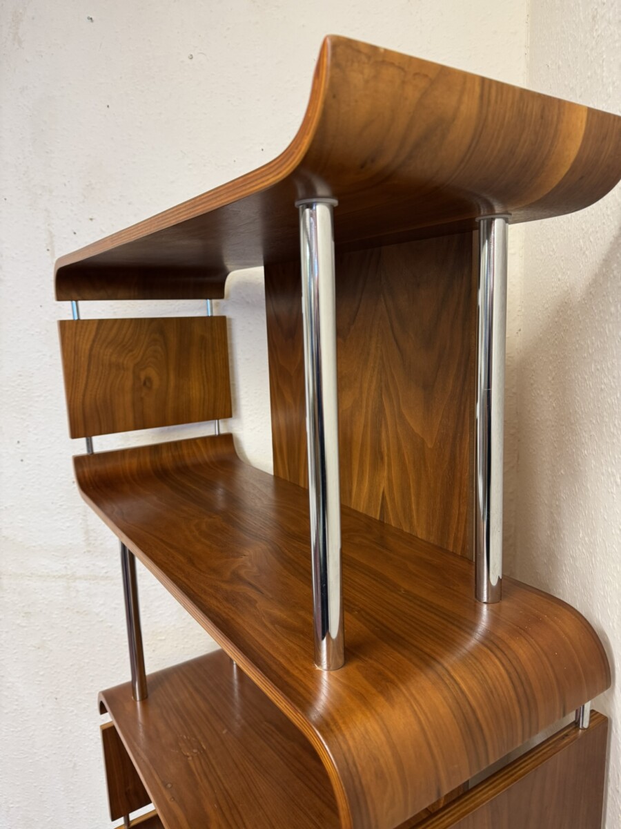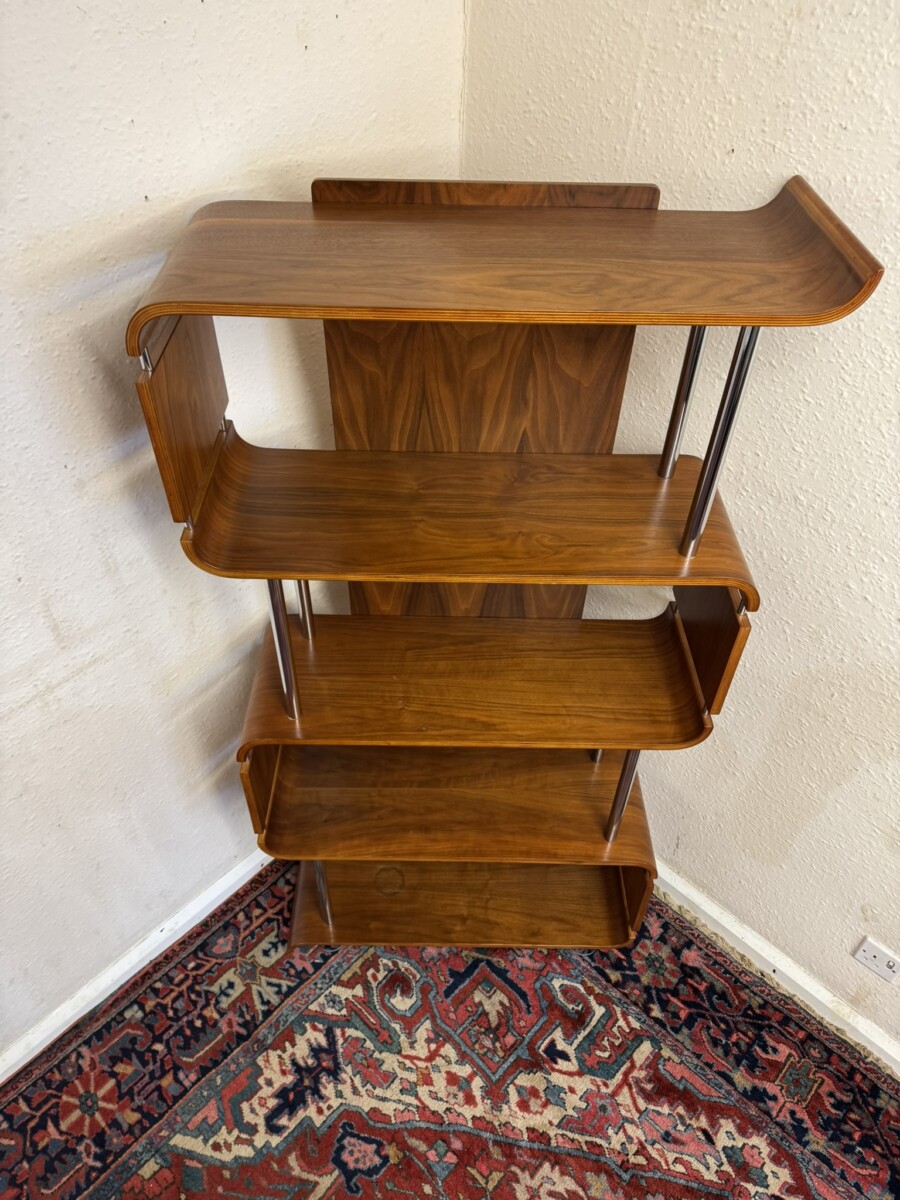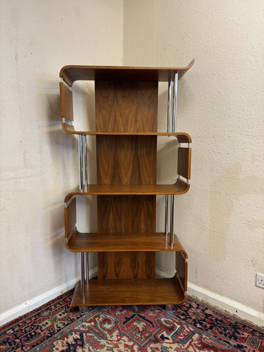 This cool room divider mixes stylish walnut bentwood shelving with polished chrome supports and feet.
