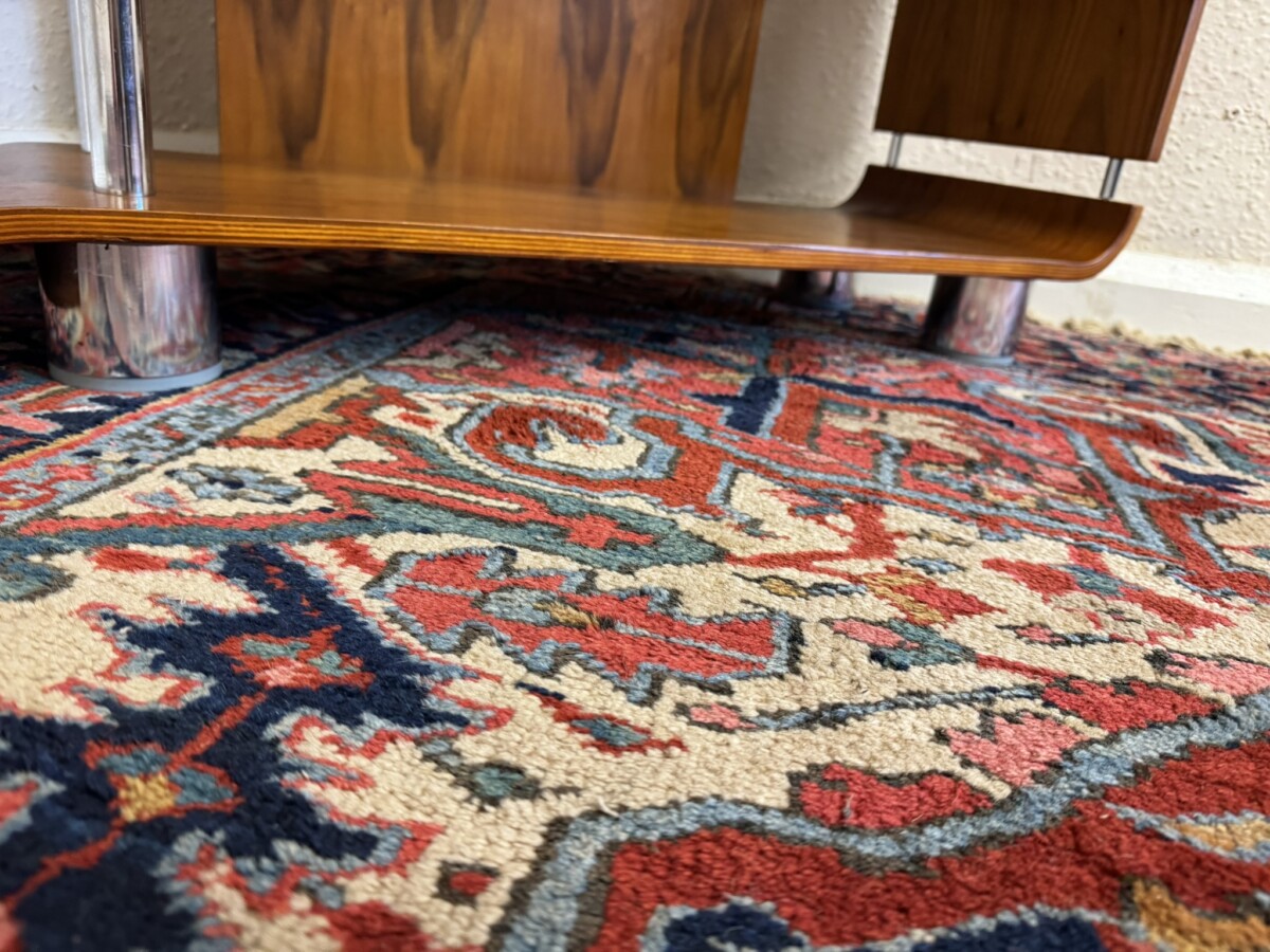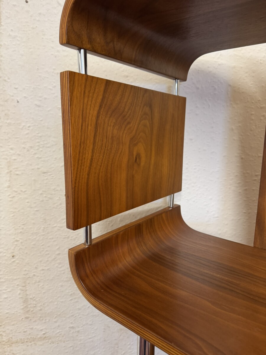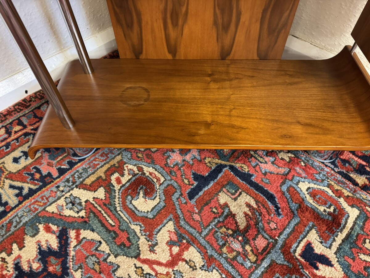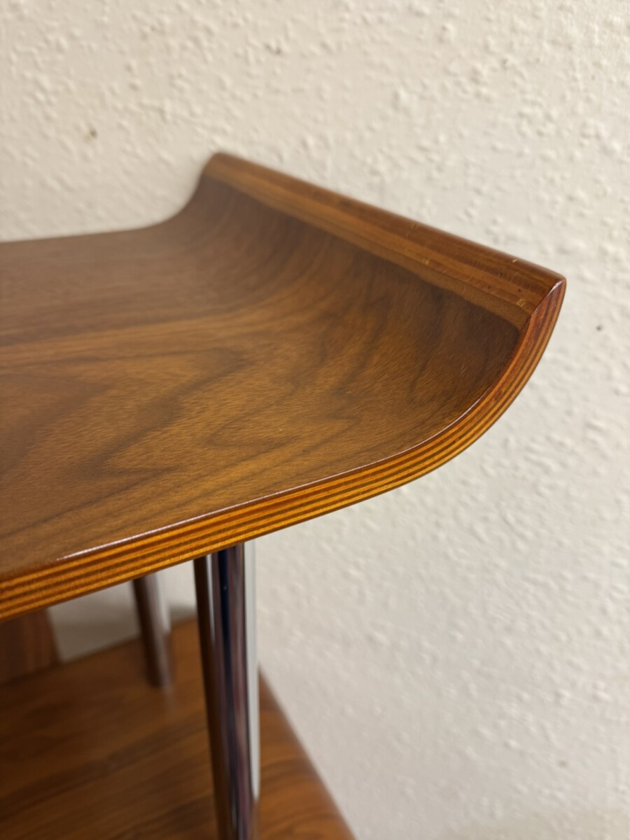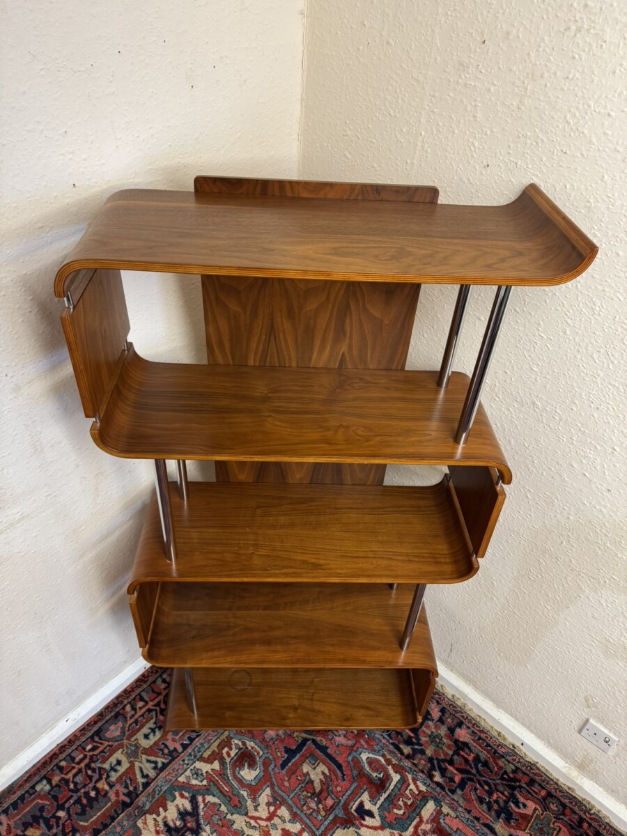 This cool room divider mixes stylish walnut bentwood shelving with polished chrome supports and feet.