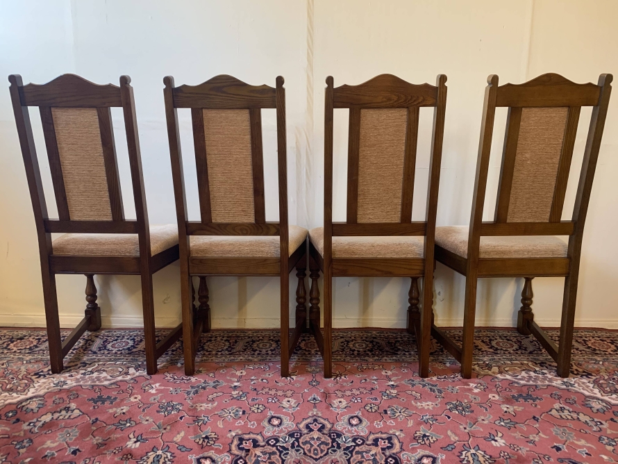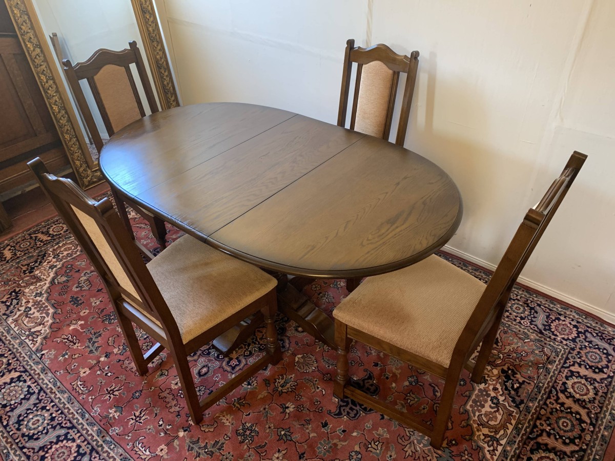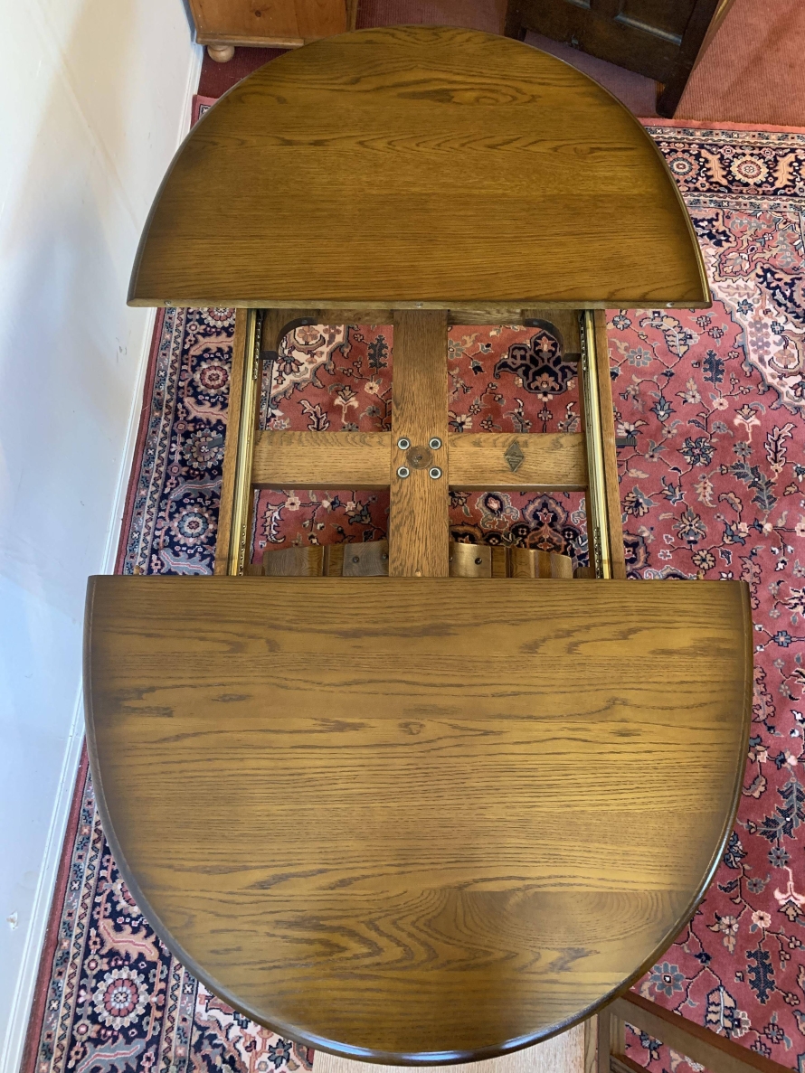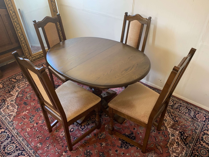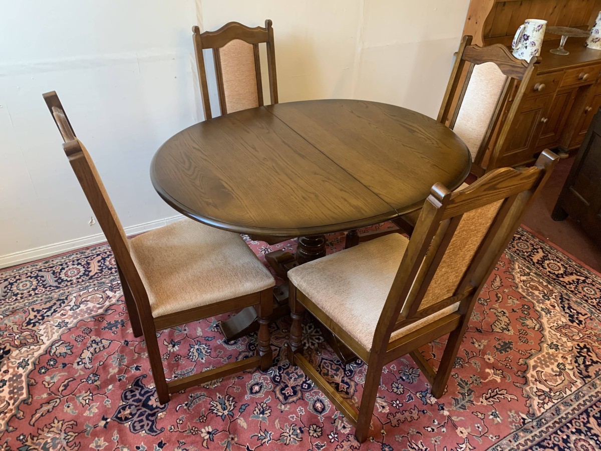 A superb quality table and four chairs produced by the renowned Old Charm furniture company, which is in fantastic condition. This neat sized table can be extended. The top leaves slide apart and a hidden leaf can be placed between them to gain extra table space. The turned pedestal base sits on four shaped legs. Each of the four chairs has an upholstered cushioned back rest and upholstered cushion seat. This table and chair set is in excellent condition.