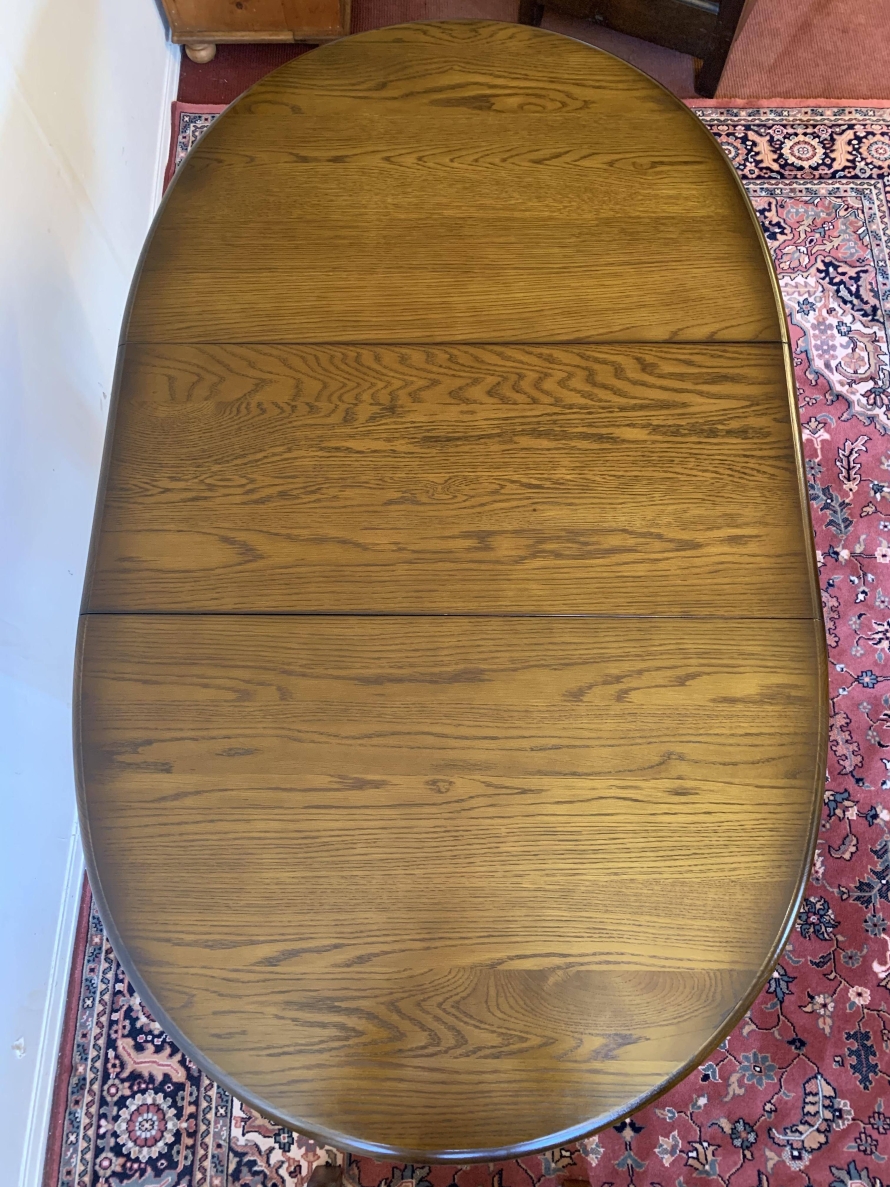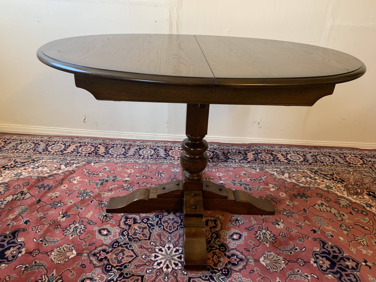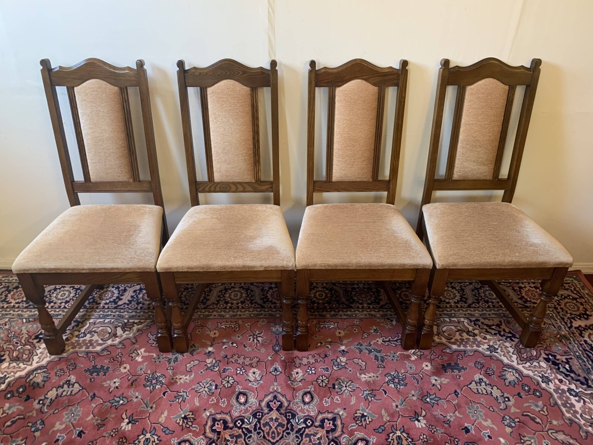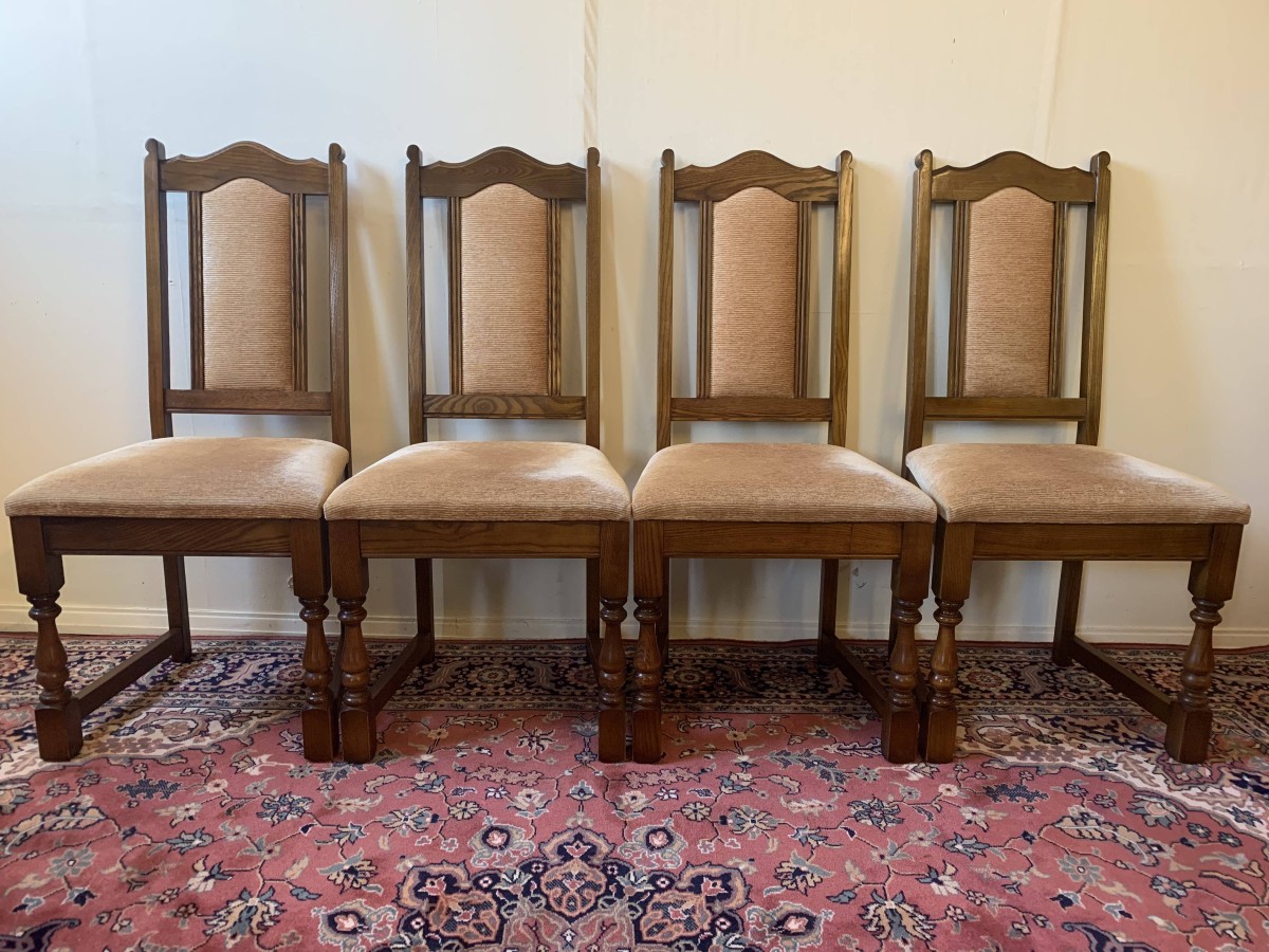 A superb quality table and four chairs produced by the renowned Old Charm furniture company, which is in fantastic condition. This neat sized table can be extended. The top leaves slide apart and a hidden leaf can be placed between them to gain extra table space. The turned pedestal base sits on four shaped legs. Each of the four chairs has an upholstered cushioned back rest and upholstered cushion seat. This table and chair set is in excellent condition.