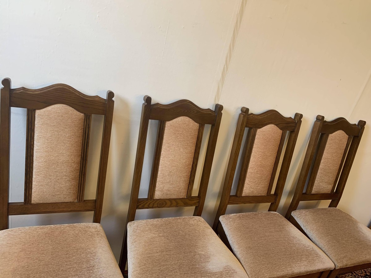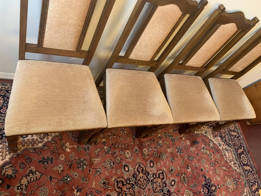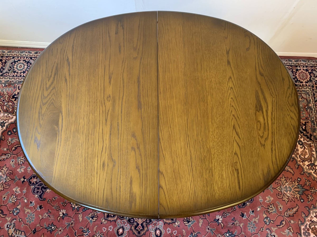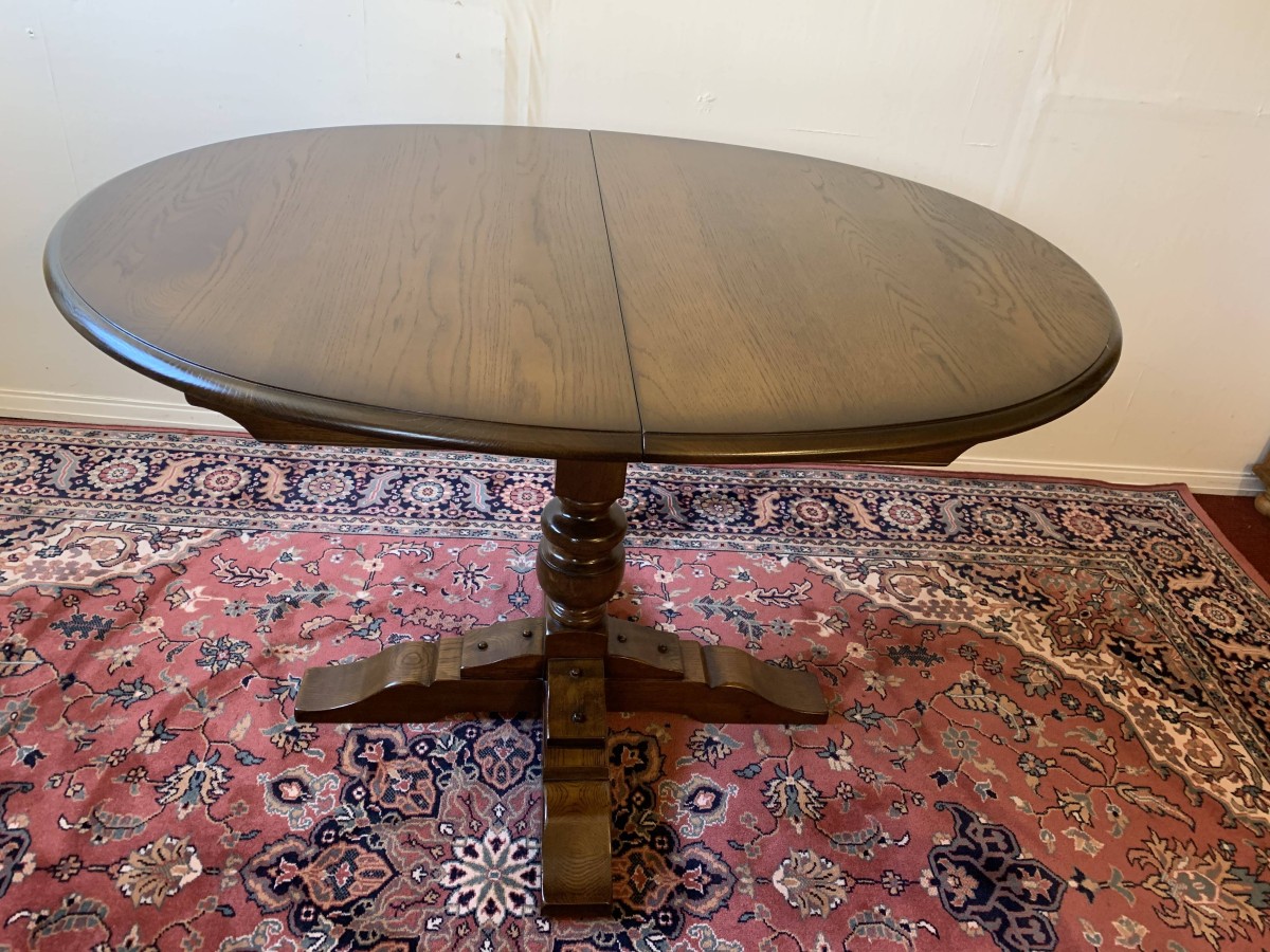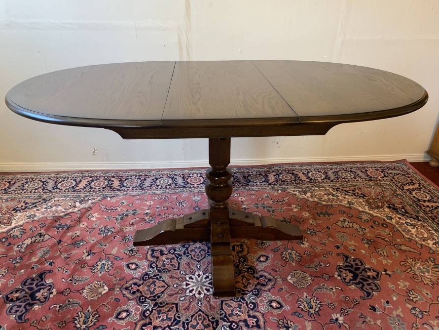 A superb quality table and four chairs produced by the renowned Old Charm furniture company, which is in fantastic condition. This neat sized table can be extended. The top leaves slide apart and a hidden leaf can be placed between them to gain extra table space. The turned pedestal base sits on four shaped legs. Each of the four chairs has an upholstered cushioned back rest and upholstered cushion seat. This table and chair set is in excellent condition.