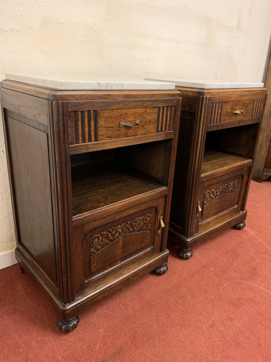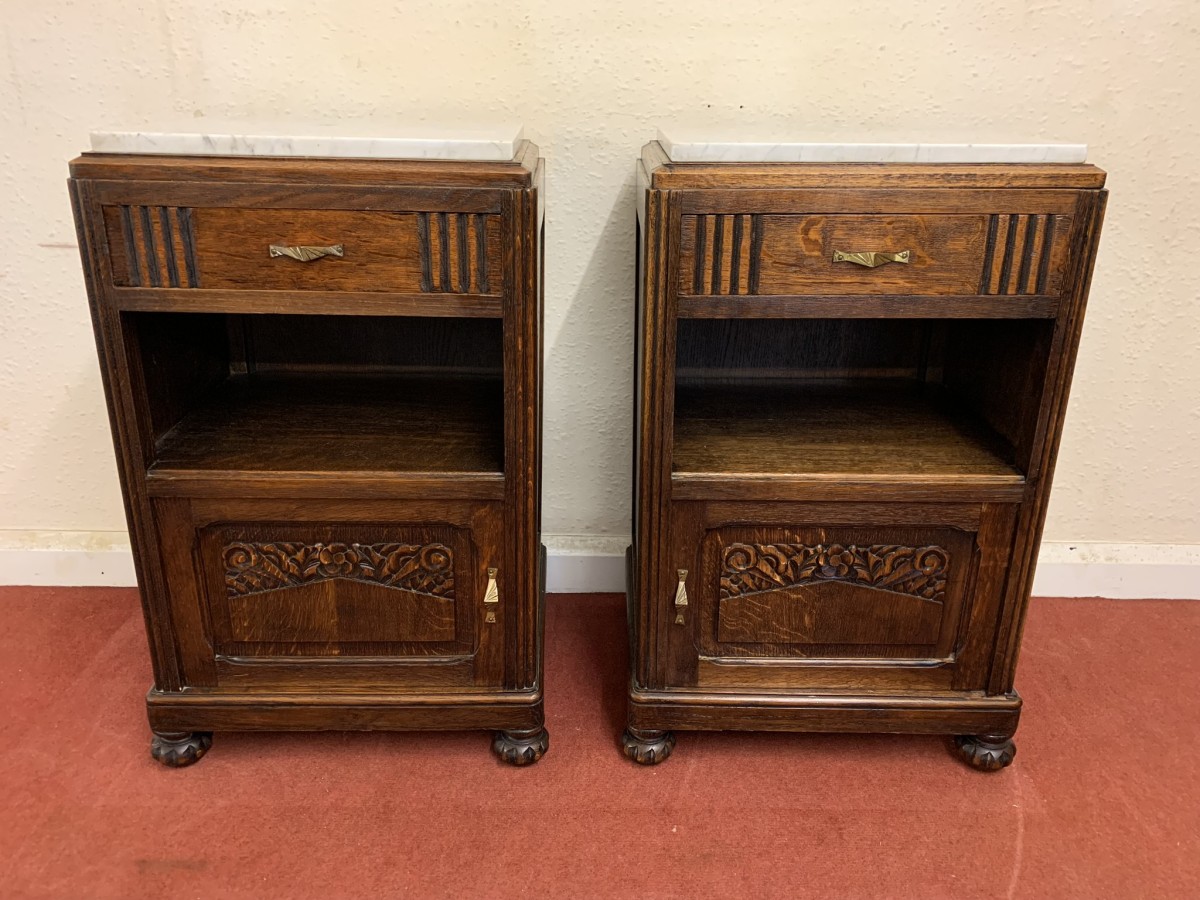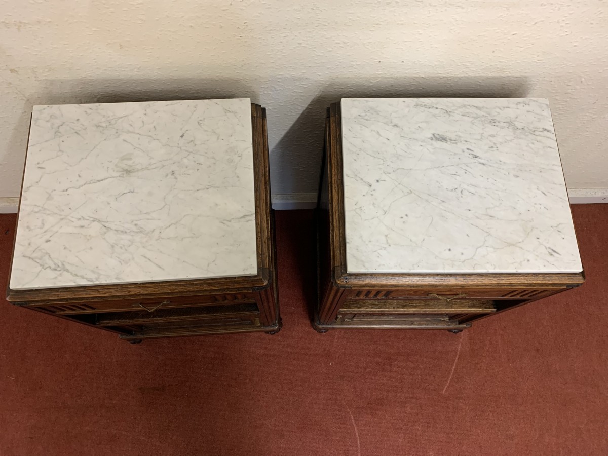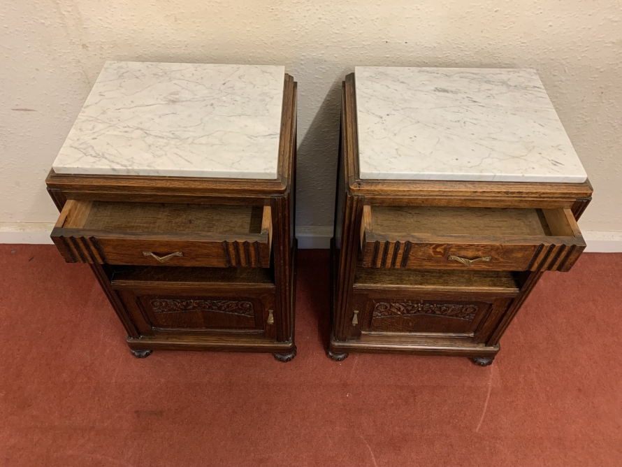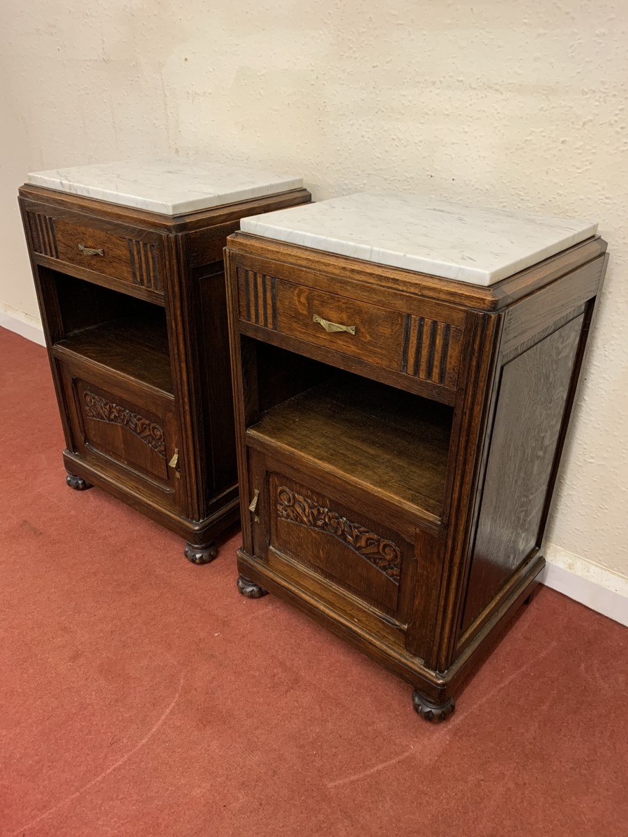 The white marble top sits above a carved drawer, the drawer having an ornate brass handle. The open section sits above a carved recessed panelled cupboard door, the door having an ornate brass handle. The doors open to reveal a useful storage space. Recessed panelled sides this fabulous pair of French cabinets sit on two carved turned feet to the front.