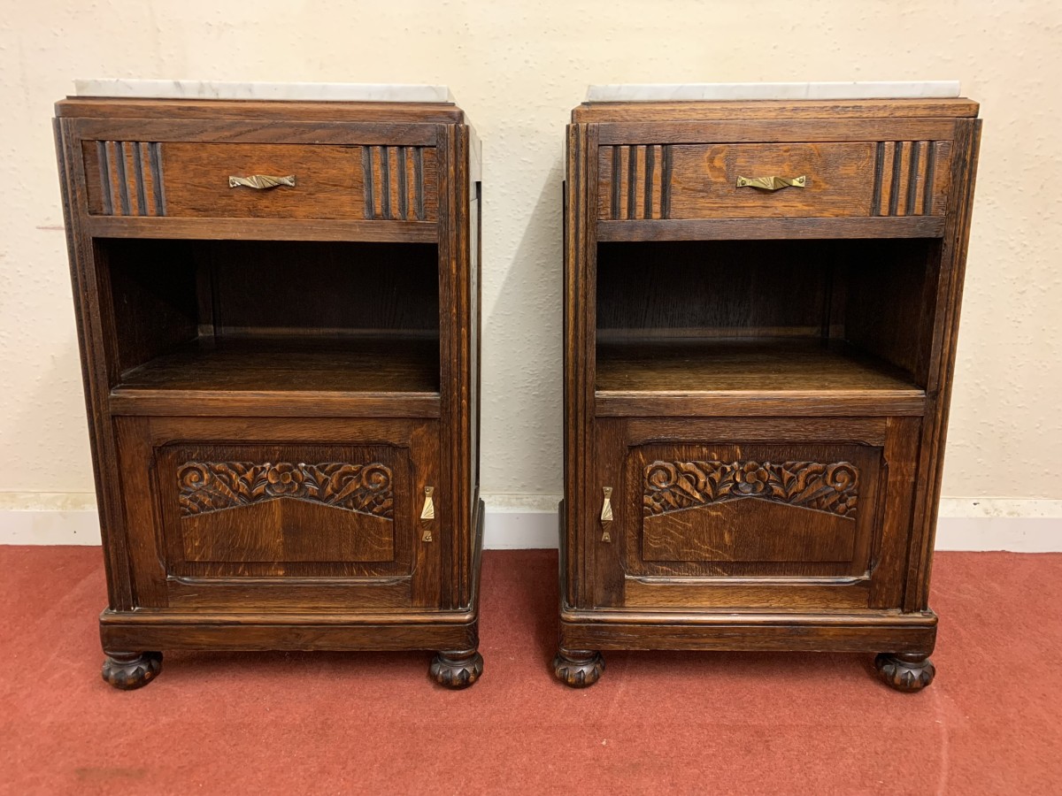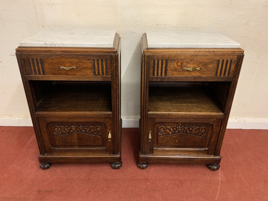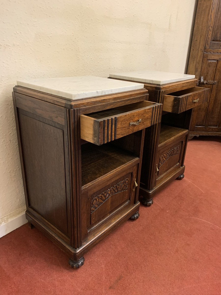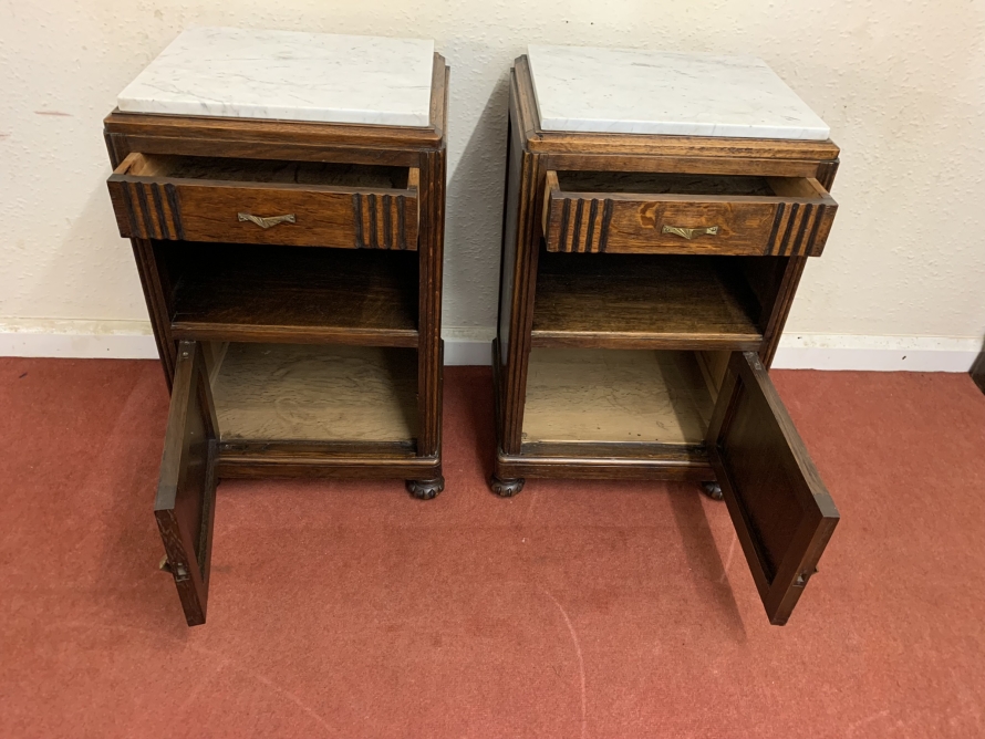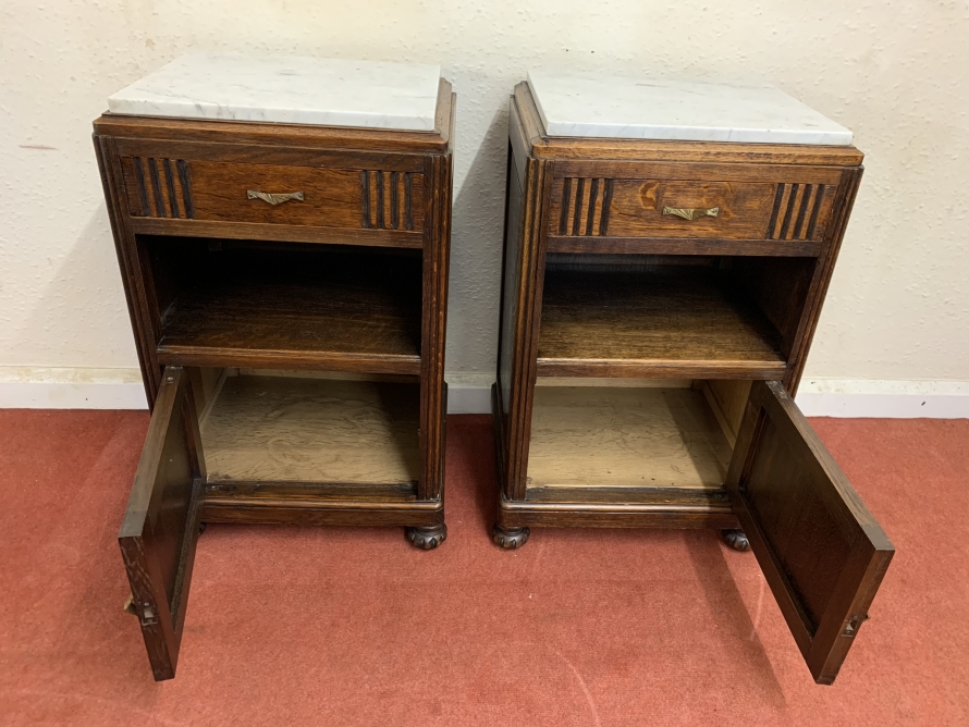 The white marble top sits above a carved drawer, the drawer having an ornate brass handle. The open section sits above a carved recessed panelled cupboard door, the door having an ornate brass handle. The doors open to reveal a useful storage space. Recessed panelled sides this fabulous pair of French cabinets sit on two carved turned feet to the front.