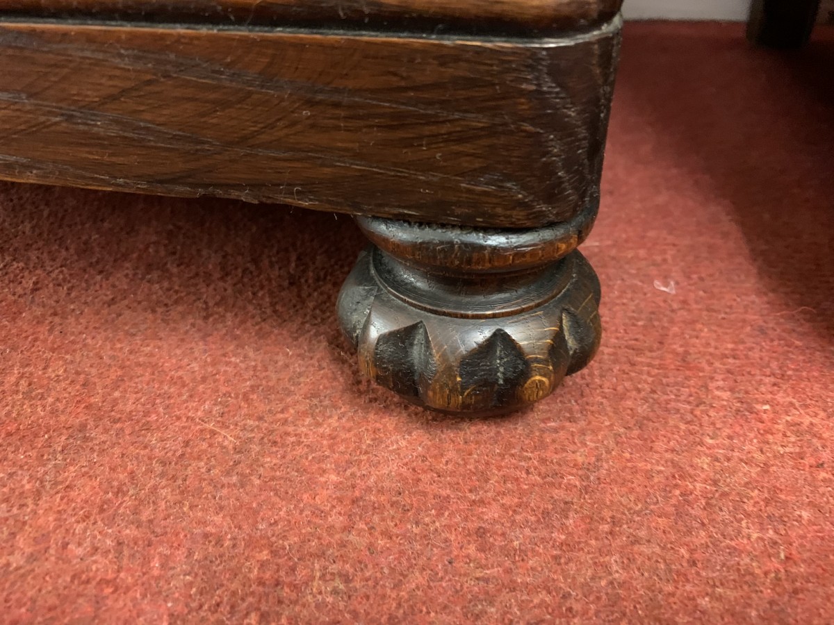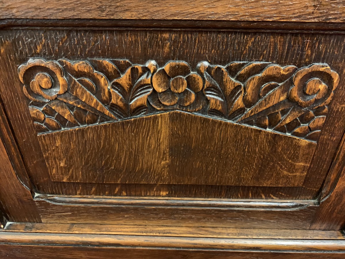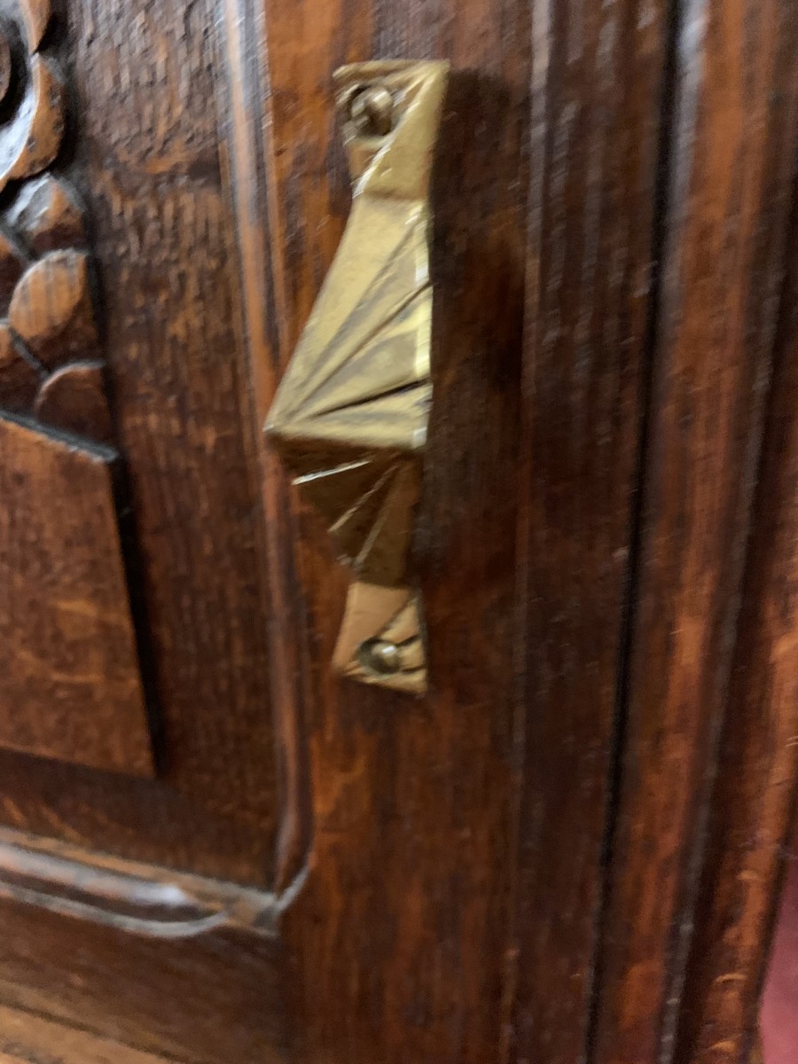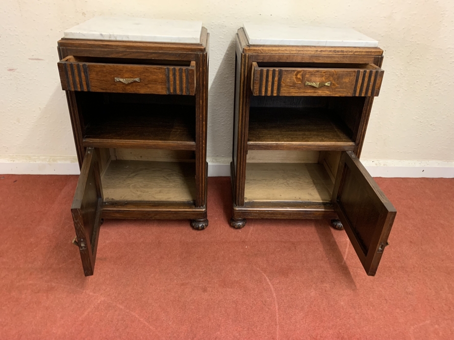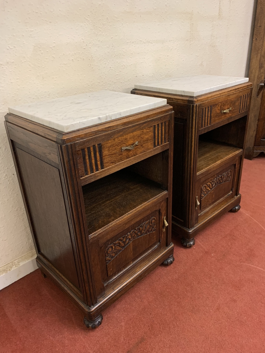 The white marble top sits above a carved drawer, the drawer having an ornate brass handle. The open section sits above a carved recessed panelled cupboard door, the door having an ornate brass handle. The doors open to reveal a useful storage space. Recessed panelled sides this fabulous pair of French cabinets sit on two carved turned feet to the front.