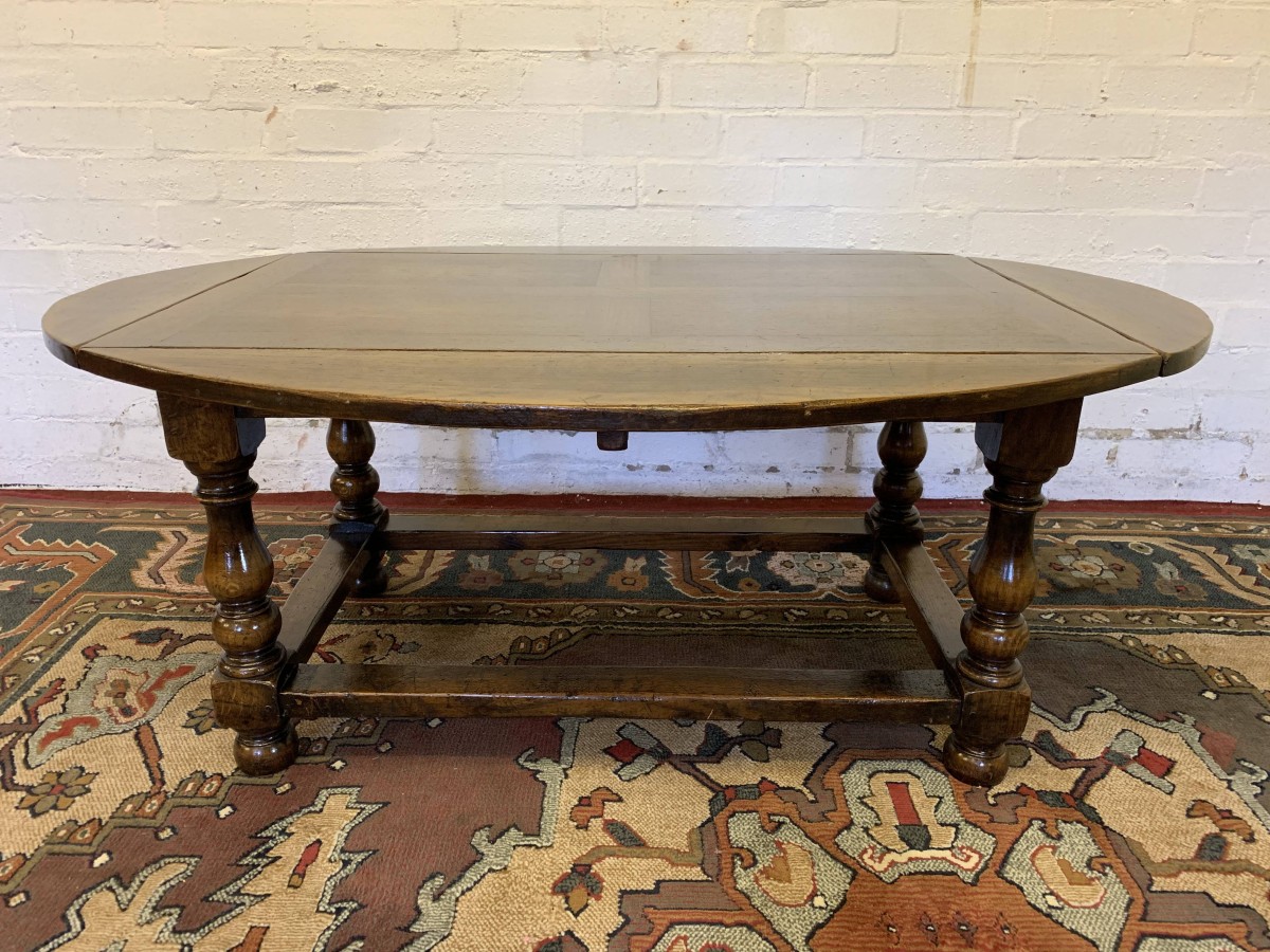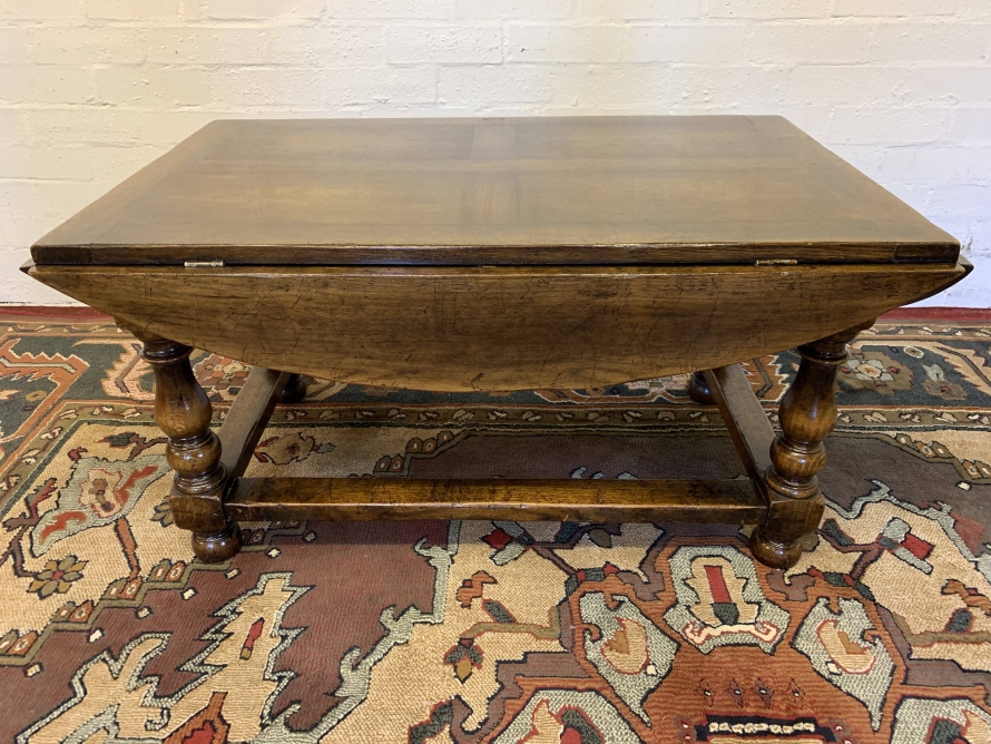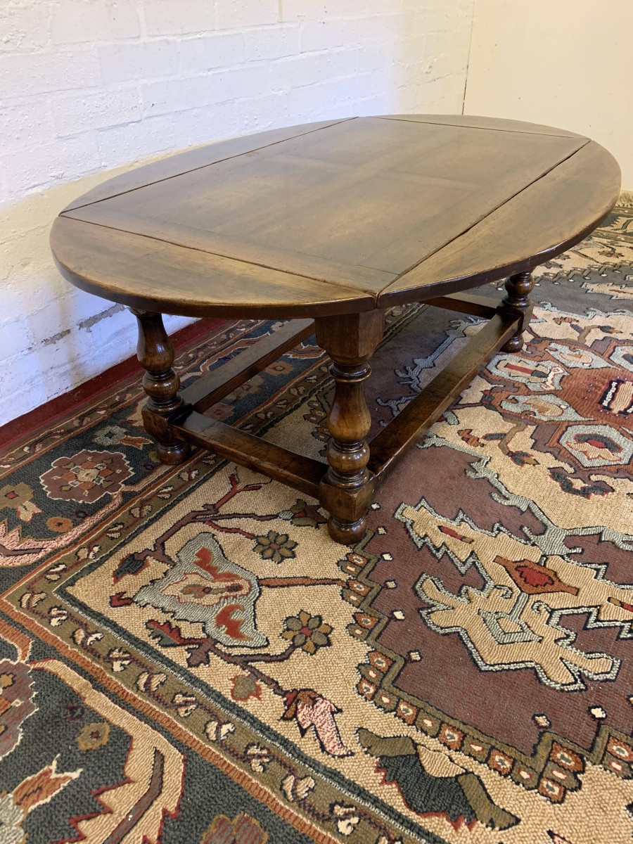 We are delighted to offer you this outstanding quality solid oak coffee table made by the renowned Titchmarsh & Goodwin furniture company. The table has a quartered oak top and drop down bleeps each side. Four super turned legs which are connected by stretcher supports. This stunning quality oak table sits on four turned legs.