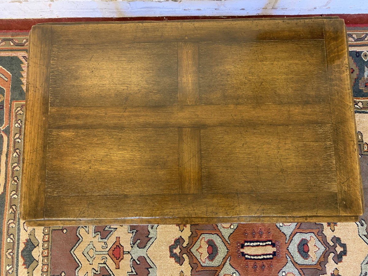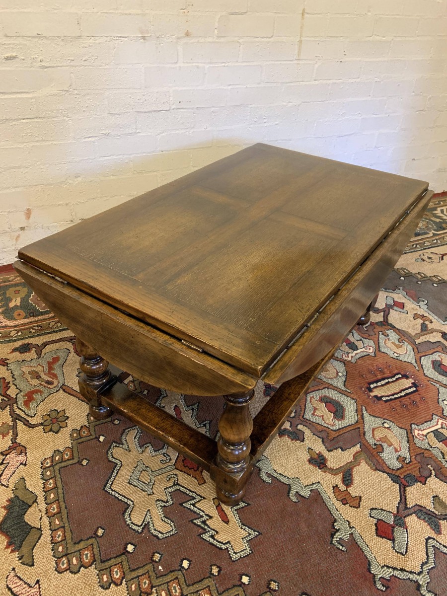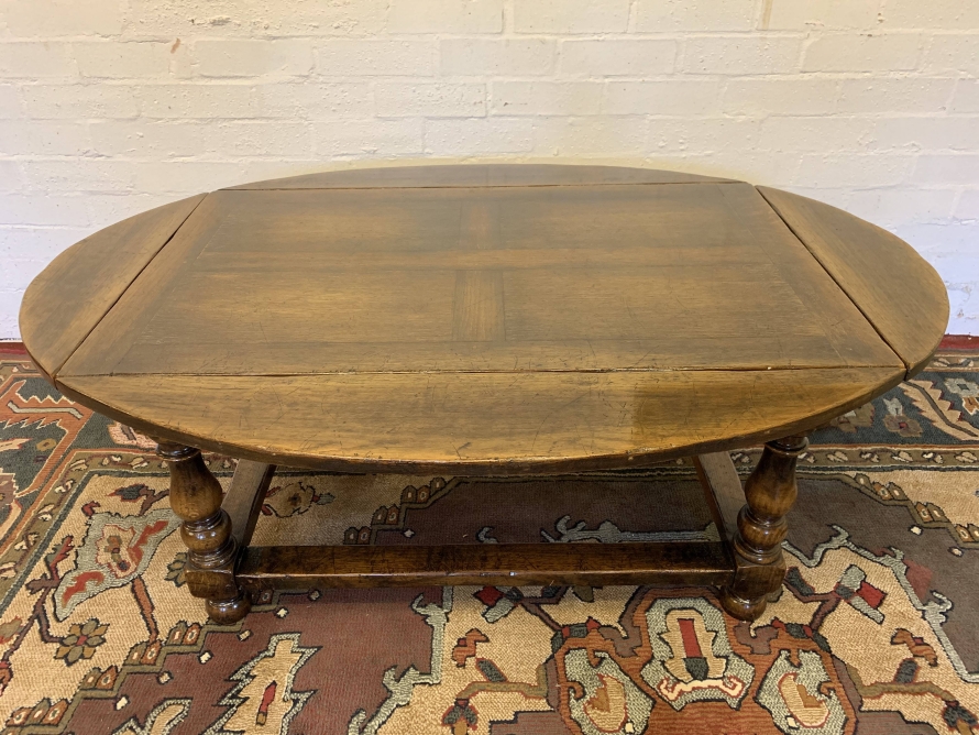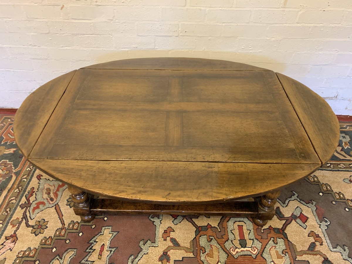 We are delighted to offer you this outstanding quality solid oak coffee table made by the renowned Titchmarsh & Goodwin furniture company. The table has a quartered oak top and drop down bleeps each side. Four super turned legs which are connected by stretcher supports. This stunning quality oak table sits on four turned legs.
