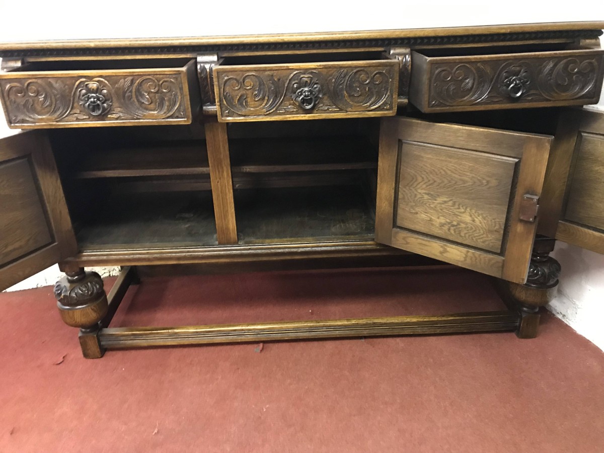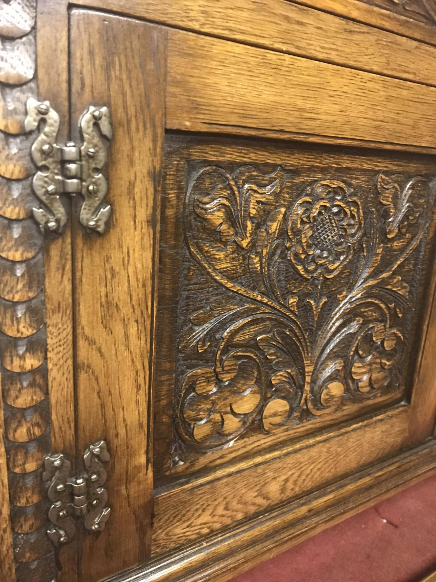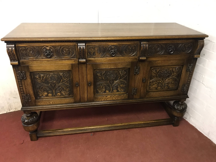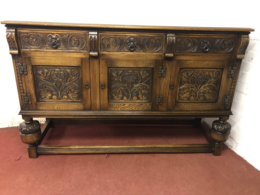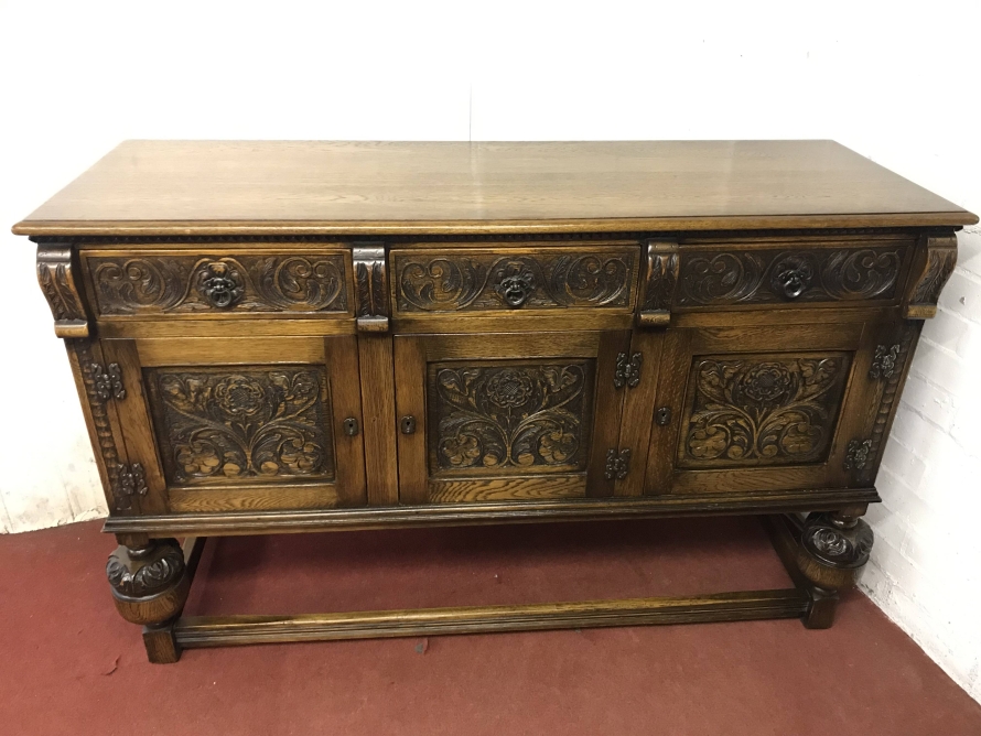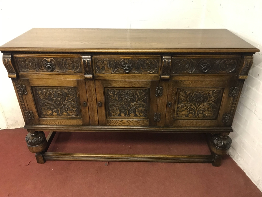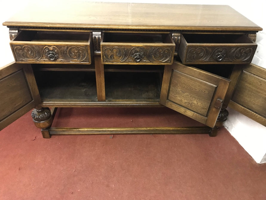 The over sailing top has carved decoration, below are three carved oak drawers each with decorative handle which sit above three carved recess panelled doors each door having decorative hinges key and escutcheon. The the left and central door opened to reveal a removable shelf the right-hand door opens to reveal ample storage. Stretcher below, the dresser has two carved bulbous legs to the front.