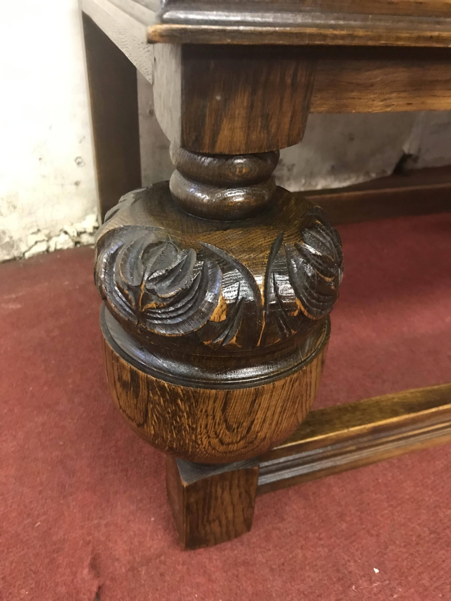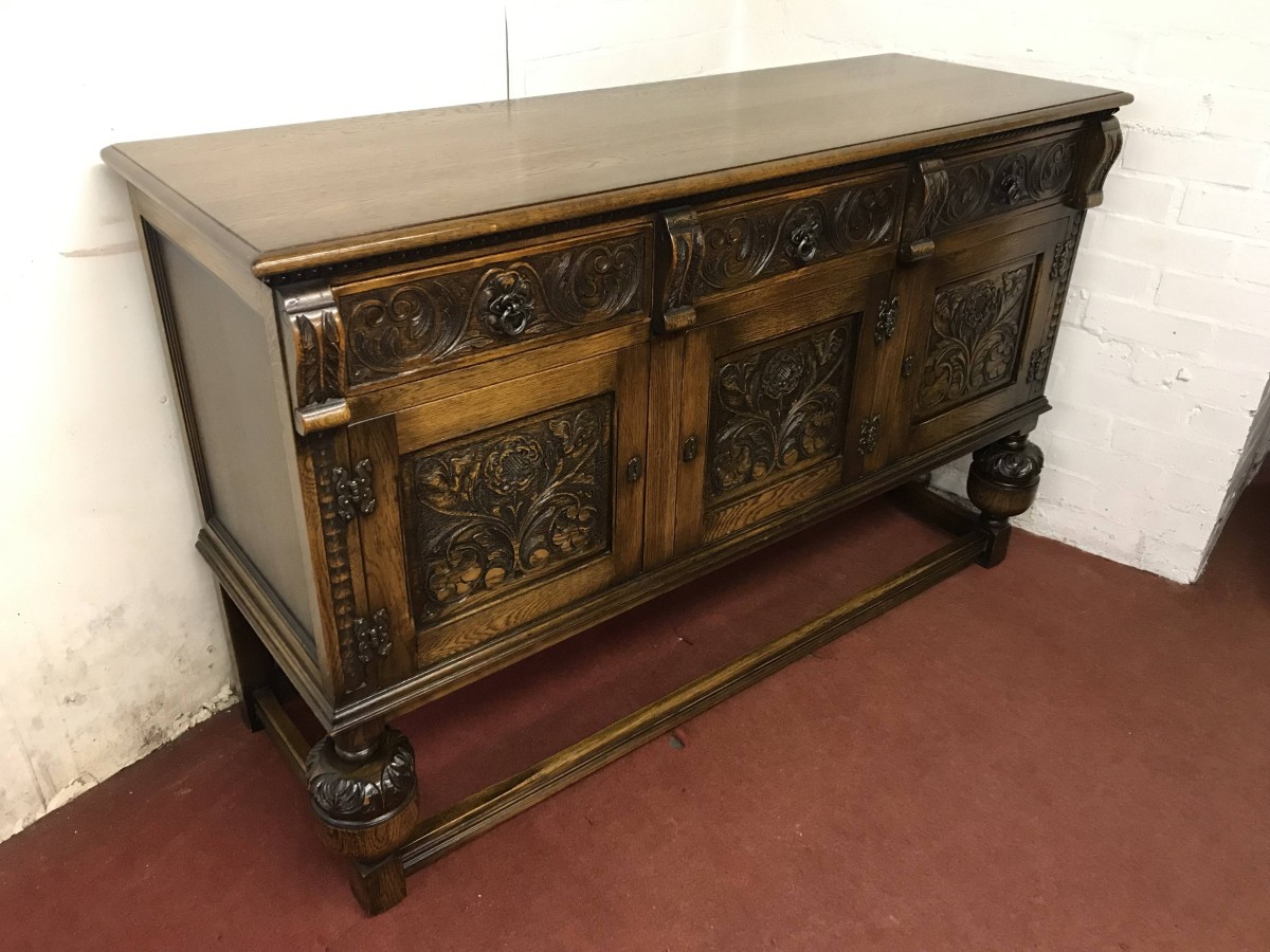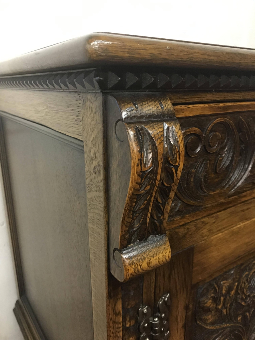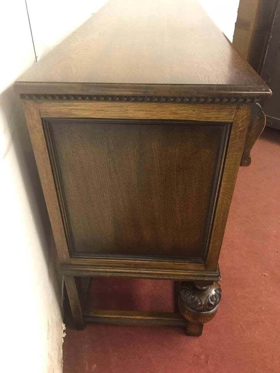 The over sailing top has carved decoration, below are three carved oak drawers each with decorative handle which sit above three carved recess panelled doors each door having decorative hinges key and escutcheon. The the left and central door opened to reveal a removable shelf the right-hand door opens to reveal ample storage. Stretcher below, the dresser has two carved bulbous legs to the front.