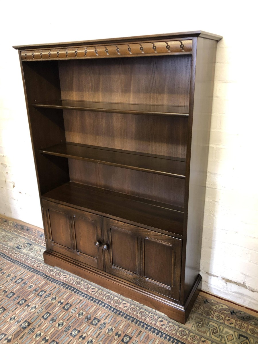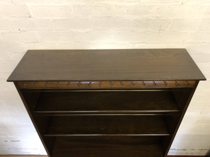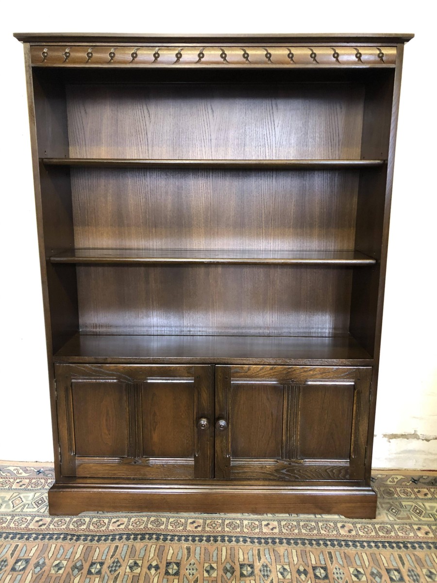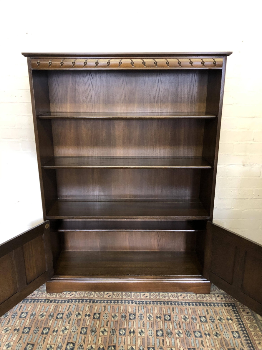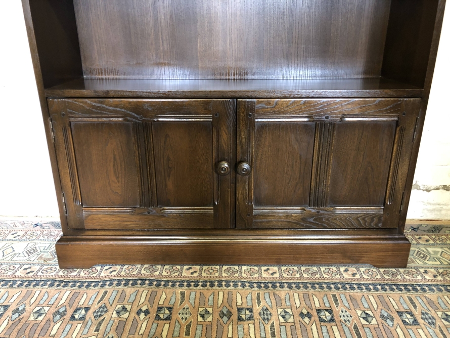 Fantastic quality item made in Elm wood and produced by the renowned Ercol furniture company. The oversailing top sits above two adjustable and removable shelves, below are a pair of recessed panelled cupboard doors, each door having a turned knob handle. This super bookcase sits on a bracket plinth base. Please note this Ercol bookcase is in excellent condition.
