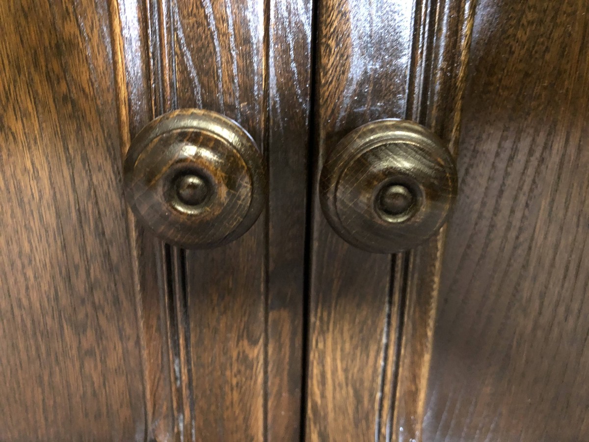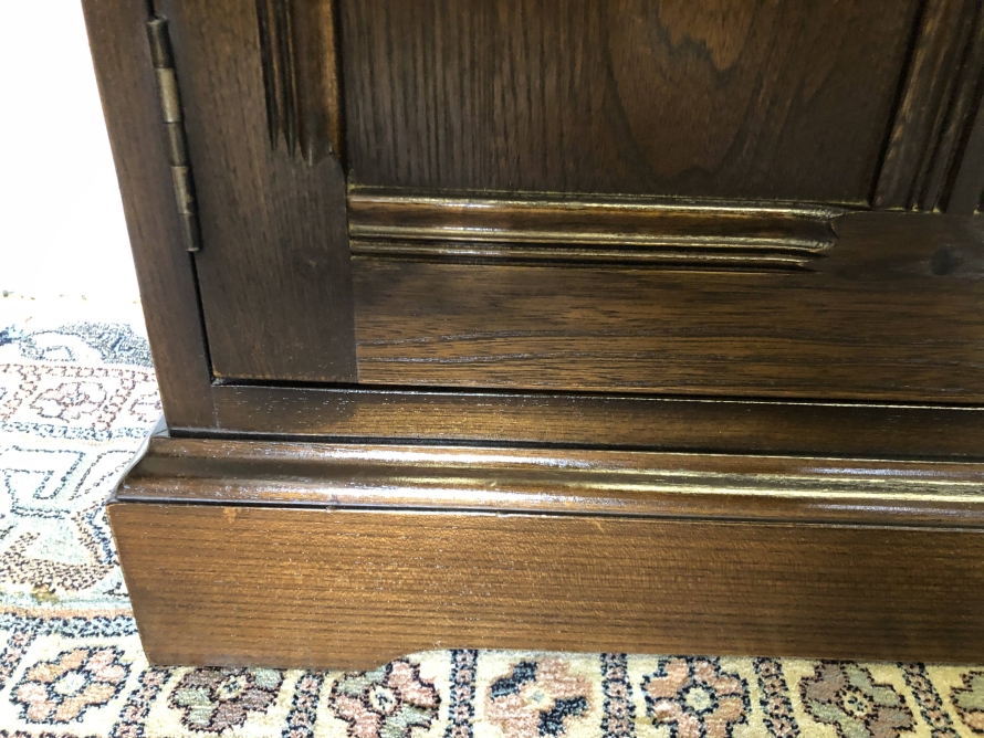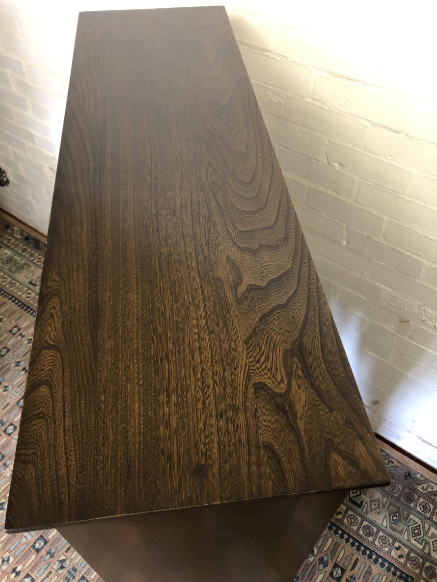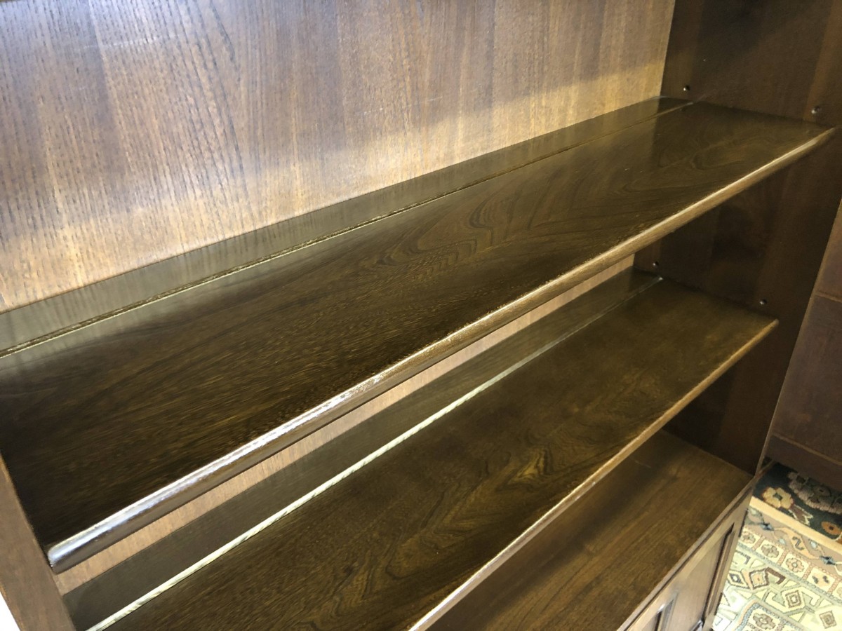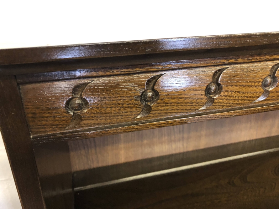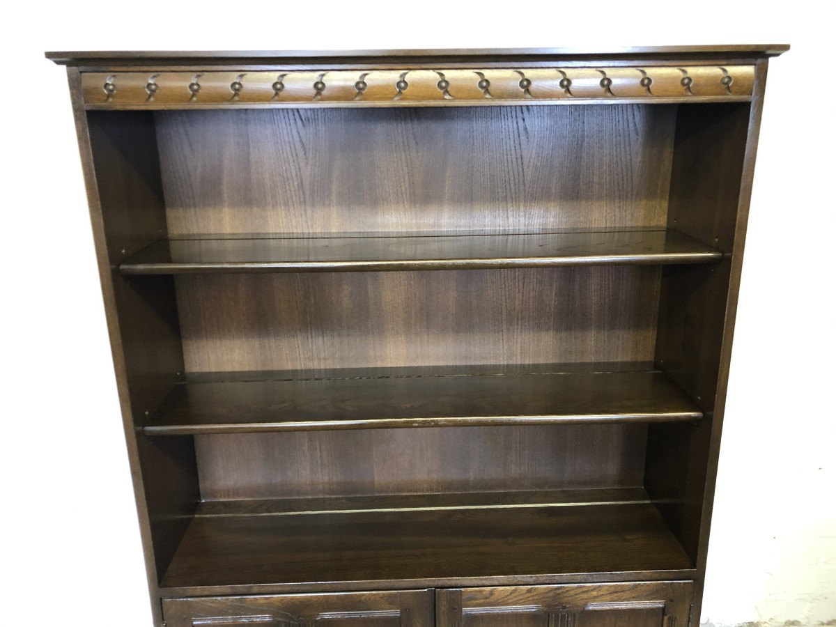Fantastic quality item made in Elm wood and produced by the renowned Ercol furniture company. The oversailing top sits above two adjustable and removable shelves, below are a pair of recessed panelled cupboard doors, each door having a turned knob handle. This super bookcase sits on a bracket plinth base. Please note this Ercol bookcase is in excellent condition.