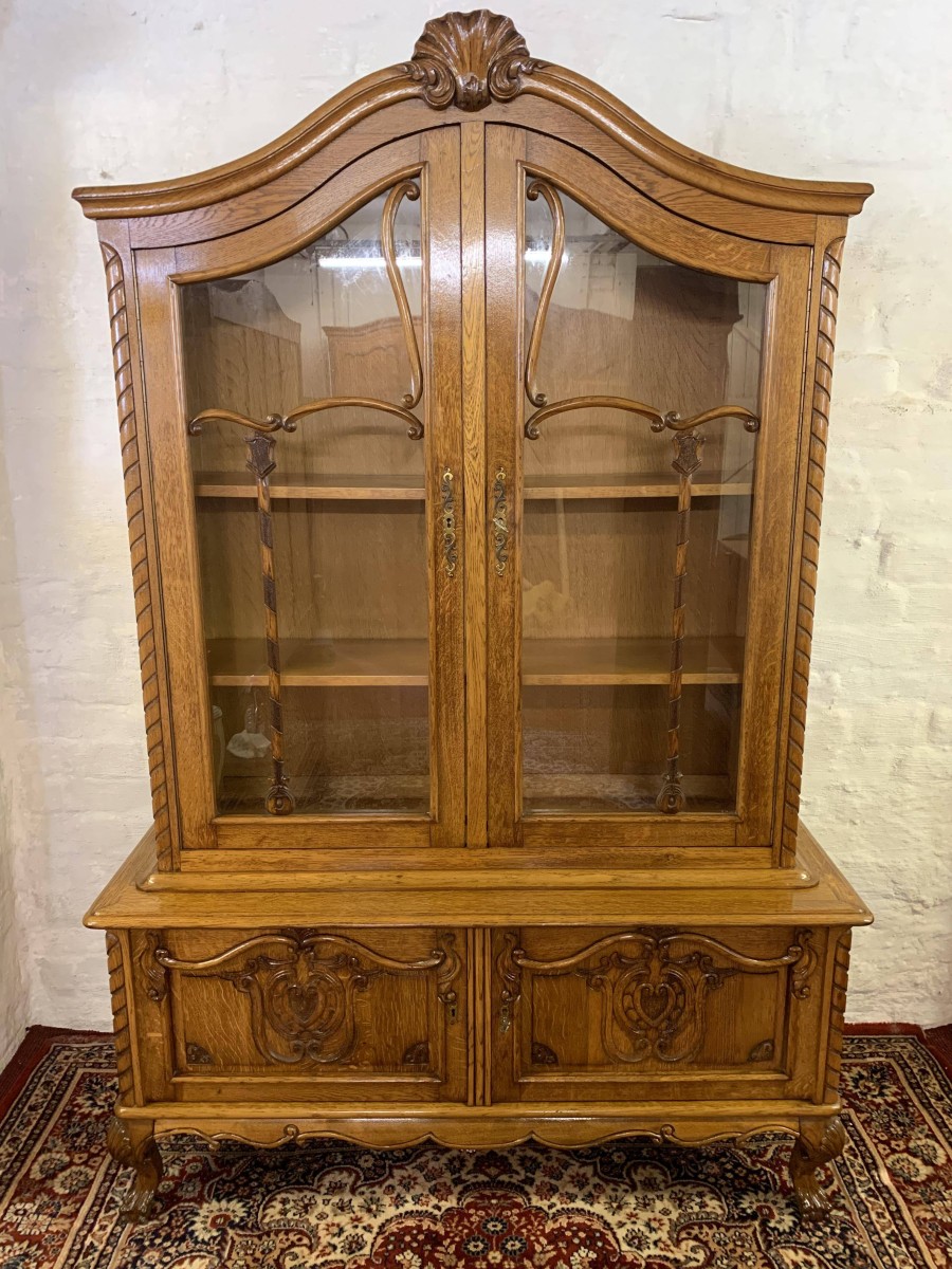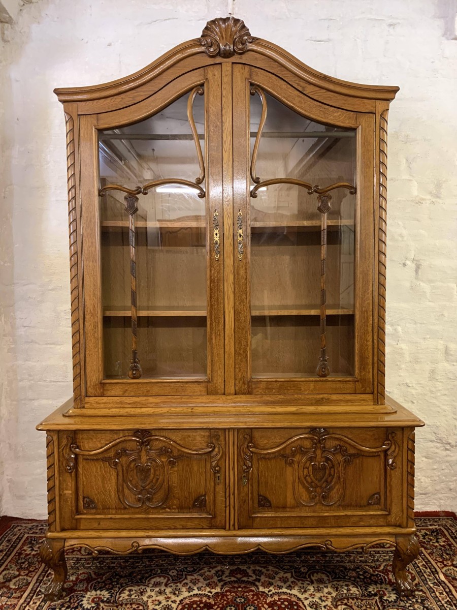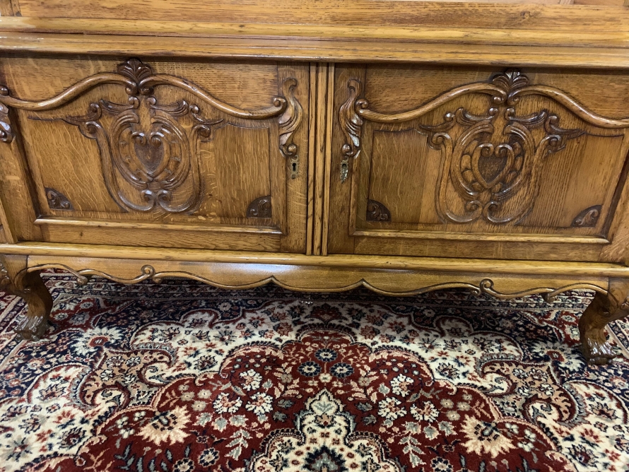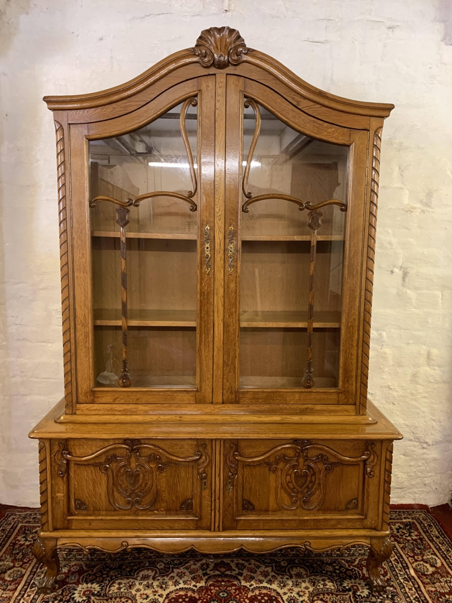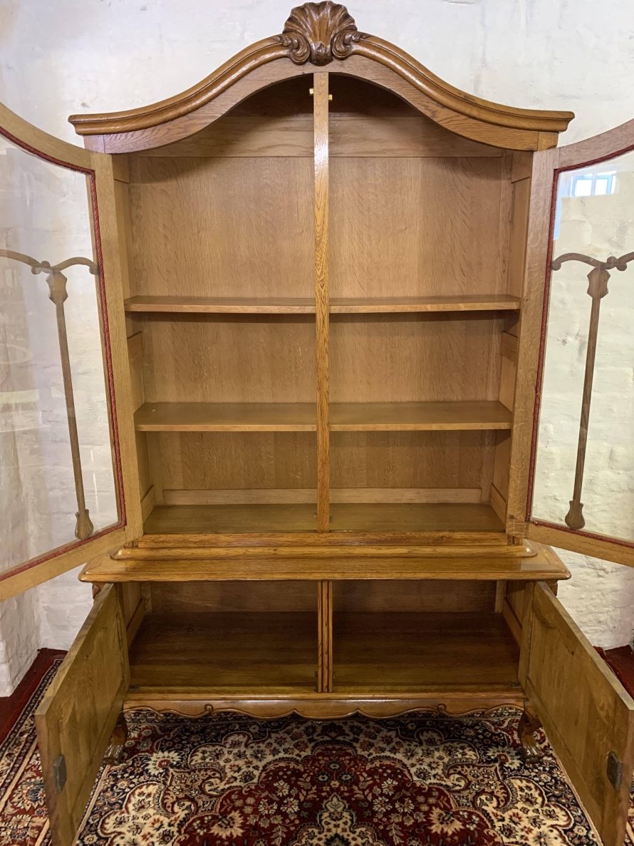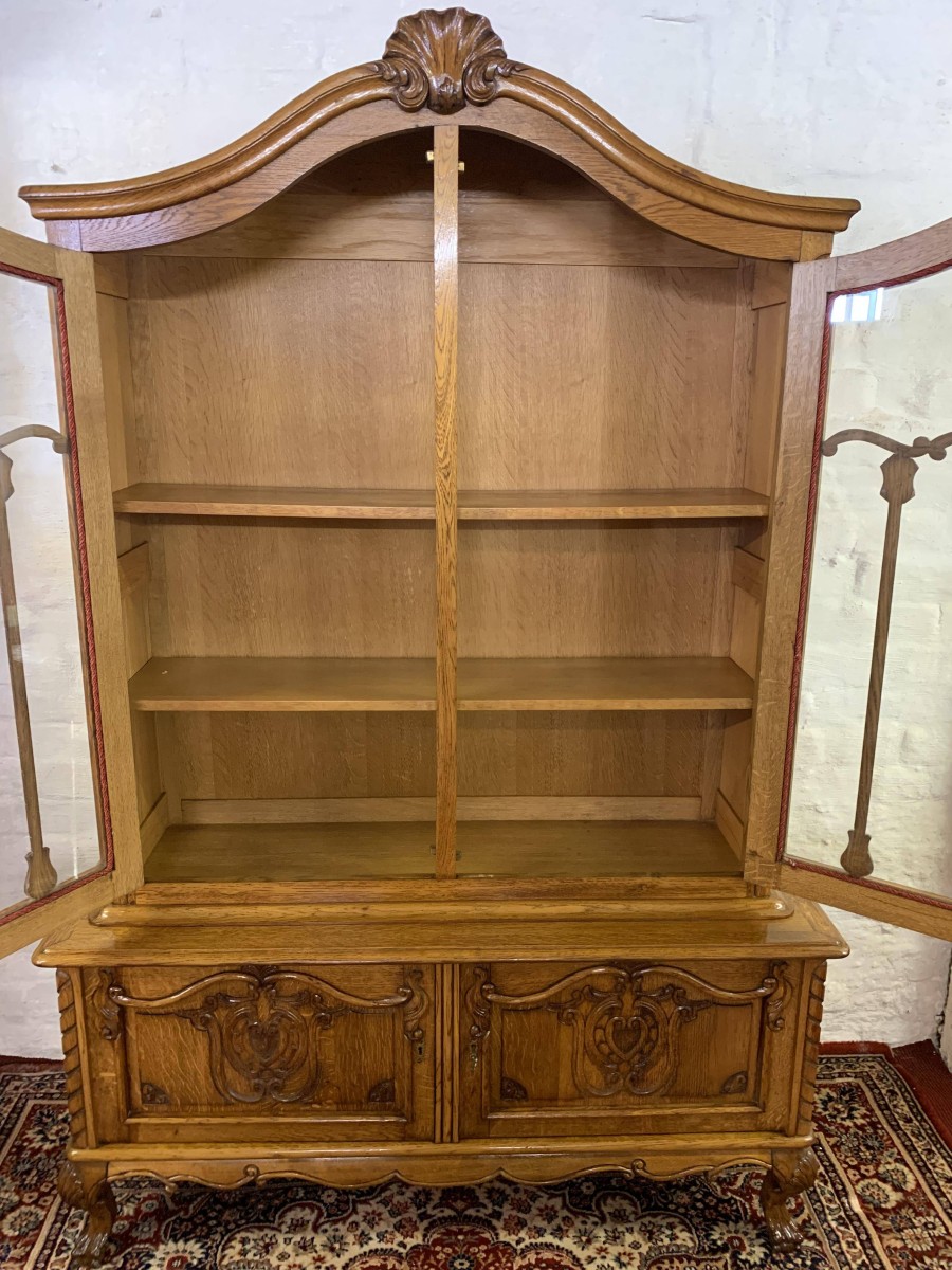 The removable top rises to a central fan carving. Below are a pair of shaped glazed cupboard doors, each door having super decorative wood barring, brass escutcheon and key. The sides have decorative carvings. The base has a pair of decorative carved lockable doors, the doors open to reveal ample storage. The top glazed doors open to reveal two removable shelves. Recessed panelled sides, shaped carved skirt. This stunning cabinet sits on carved shaped cabriole legs and ball and claw feet.