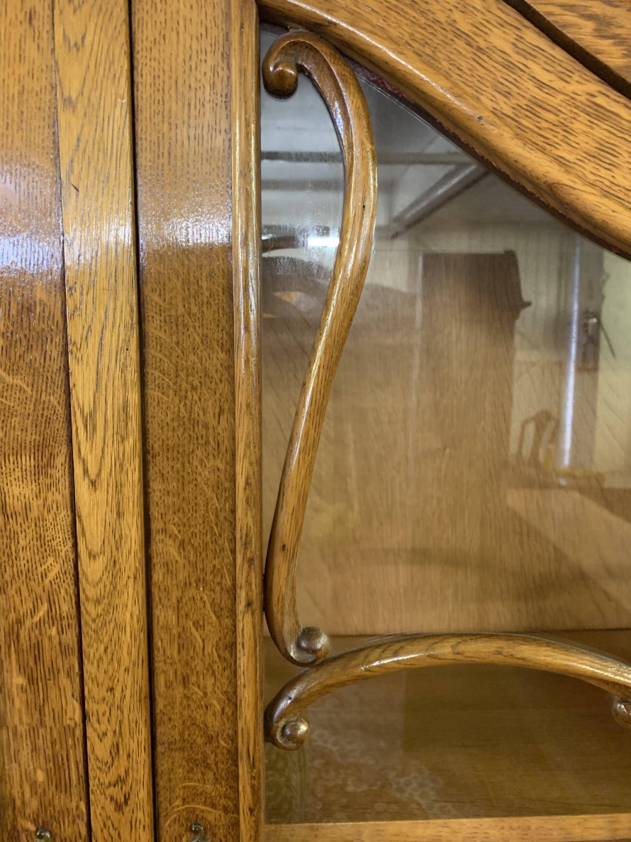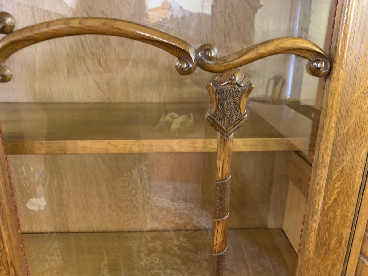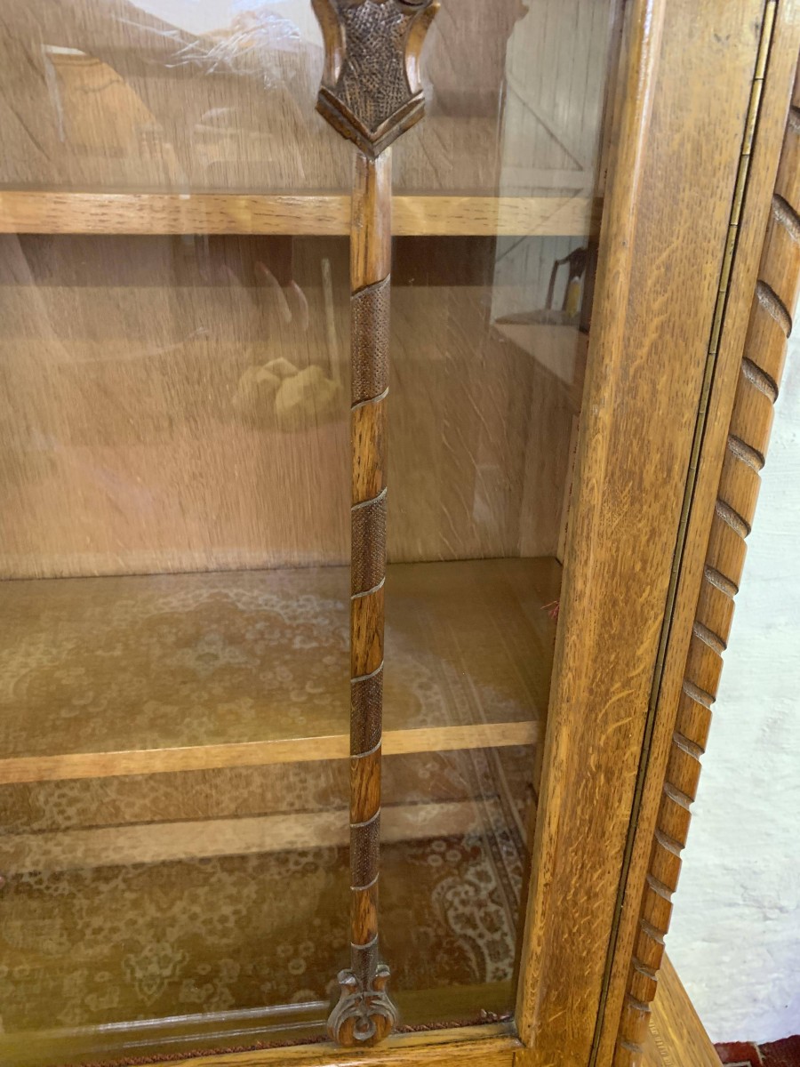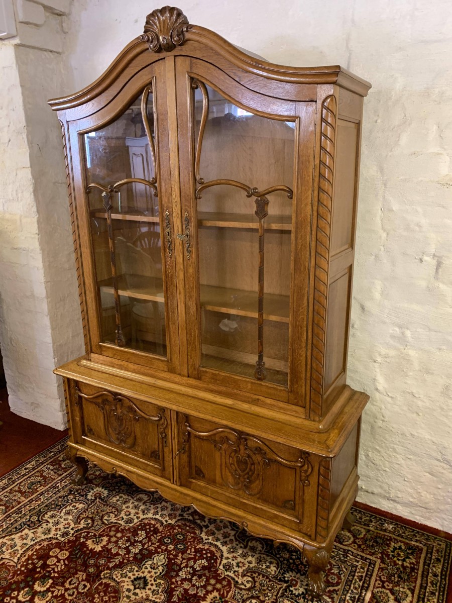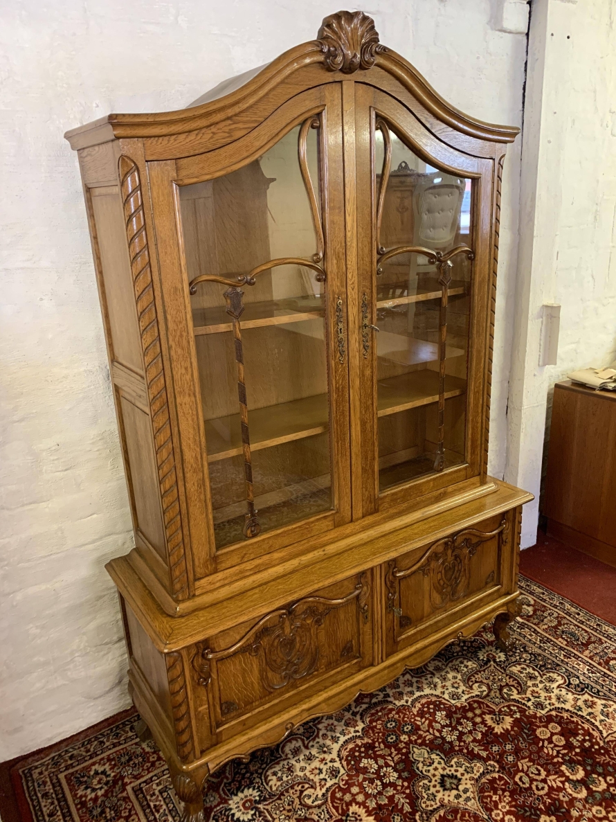 The removable top rises to a central fan carving. Below are a pair of shaped glazed cupboard doors, each door having super decorative wood barring, brass escutcheon and key. The sides have decorative carvings. The base has a pair of decorative carved lockable doors, the doors open to reveal ample storage. The top glazed doors open to reveal two removable shelves. Recessed panelled sides, shaped carved skirt. This stunning cabinet sits on carved shaped cabriole legs and ball and claw feet.