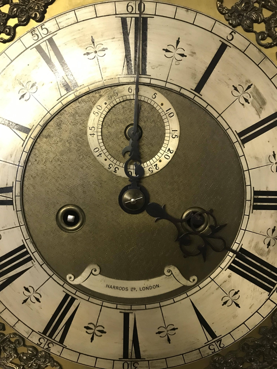 The square brass dial has a silvered chapter ring with black numerals and is divided by Fleur-De-Lis to the minutes. there is a silvered chapter ring depicting seconds. At the 6 O'clock position is a silvered cartouche depicting “Harrods Ltd London”. there are four cherub head spandrels to the corners.