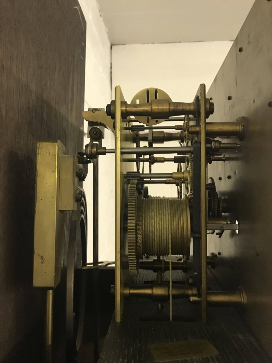 The eight day movement strikes the hours on a single gong and is driven by two brass weights on pulley's. the hands are serpentine shaped and are of blue steel. The pendulum consists of a flat metal rod with a flat lead adjustable bob. The clock is in excellent working order.