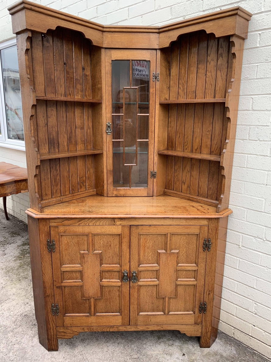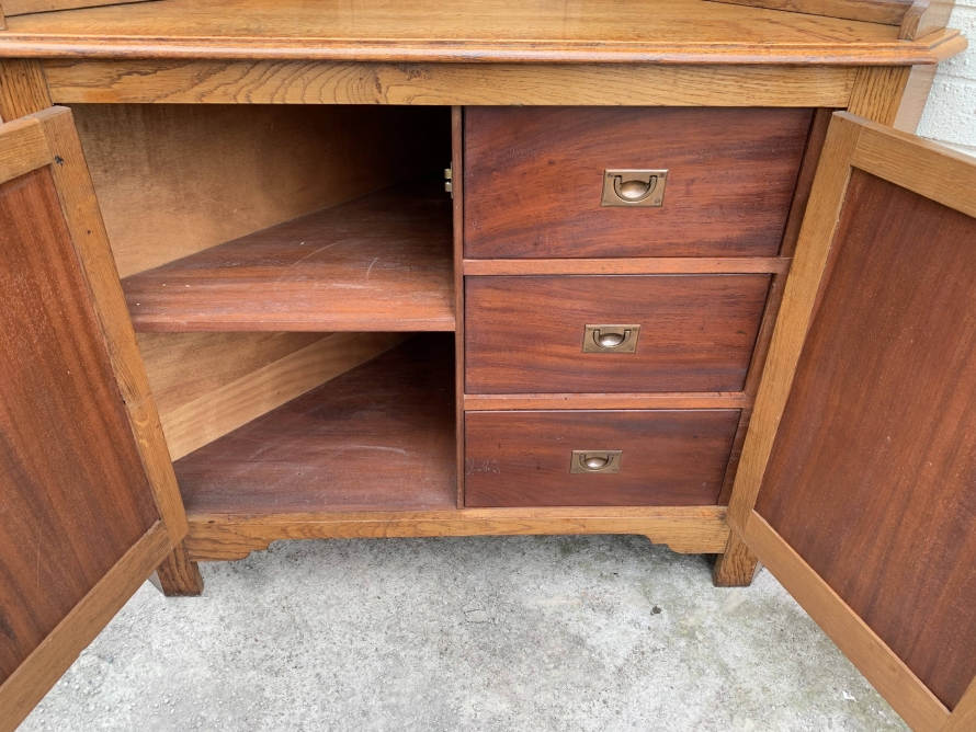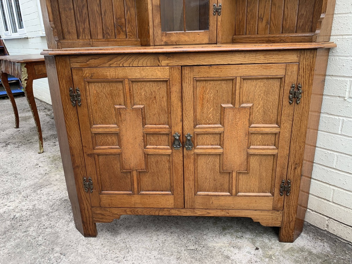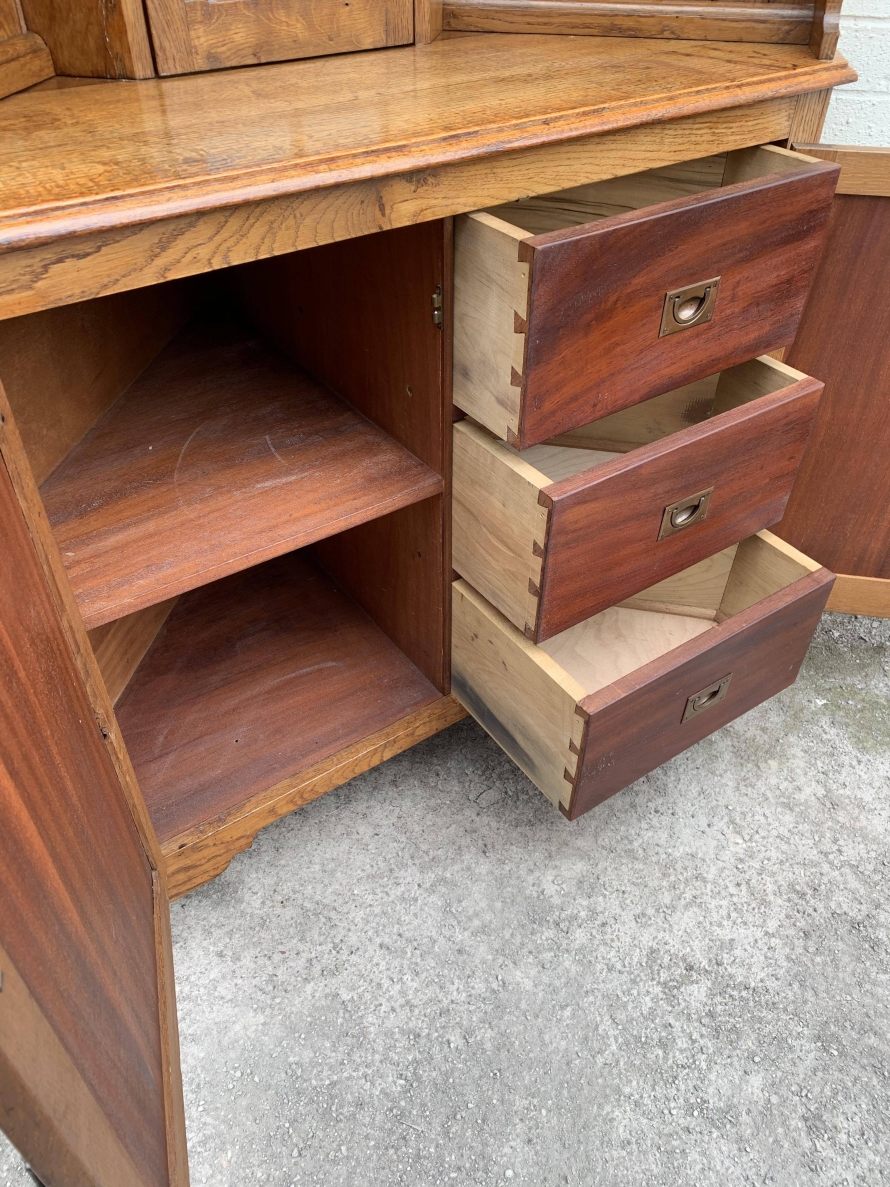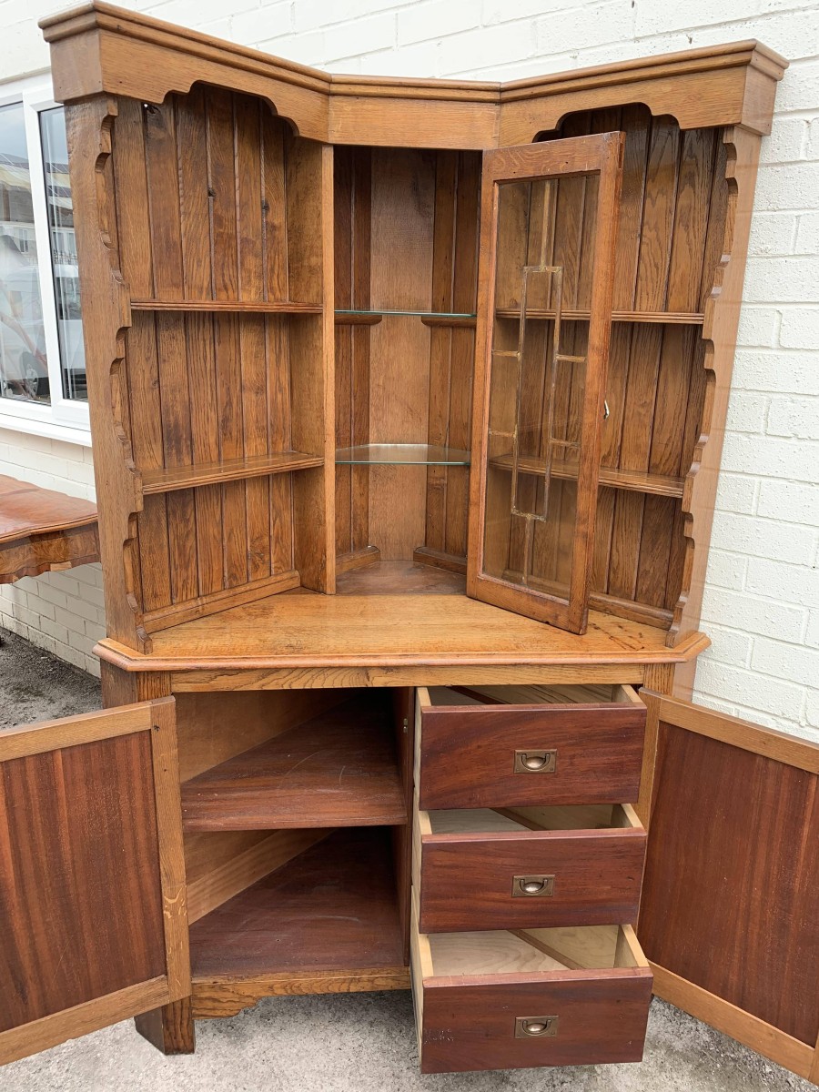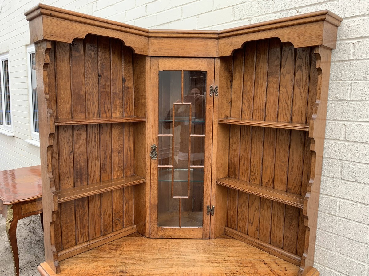 The removable top section has a central glazed door which opens to reveal two removable glass display shelves this door is flanked by a pair of shelves, the corners of the shelves are wavy. The bottom section has an over sailing top which sits above a pair of recessed panelled oak doors. The doors open to reveal shelving to the left-hand side and there are three handy storage drawers to the right. Please note this item is made entirely of glorious golden oak.