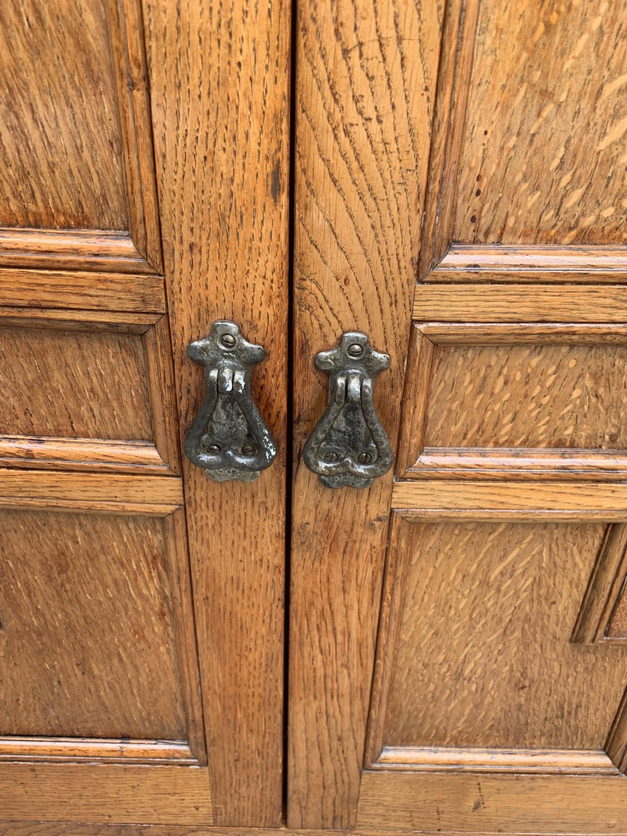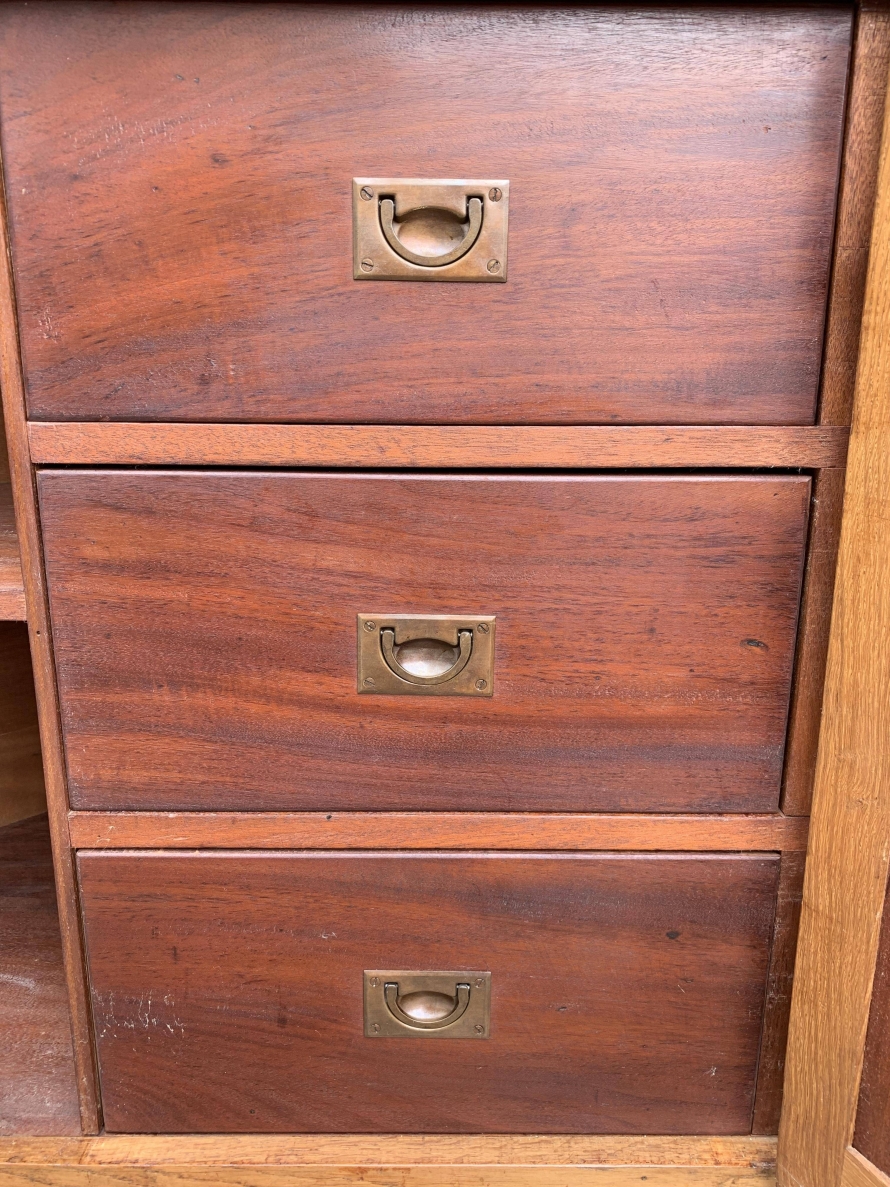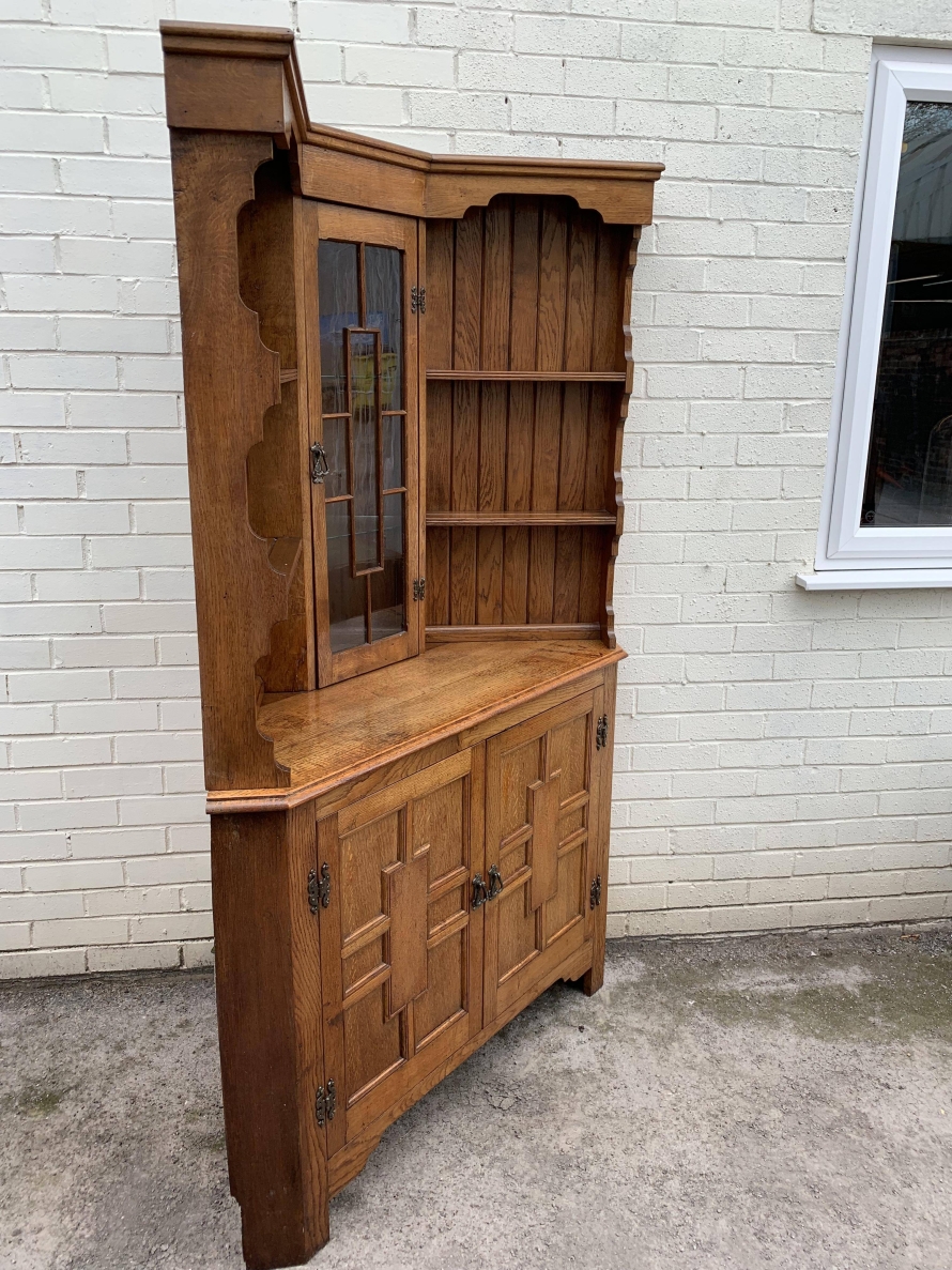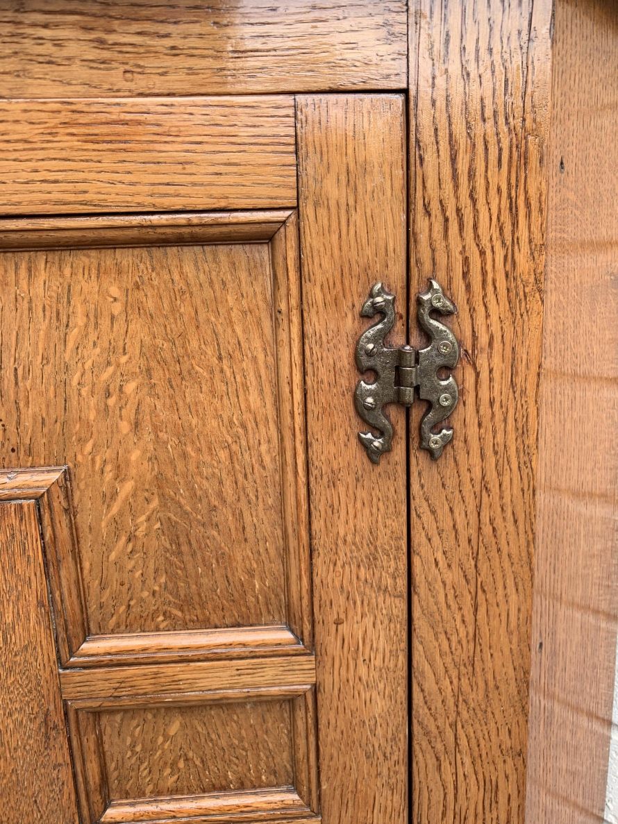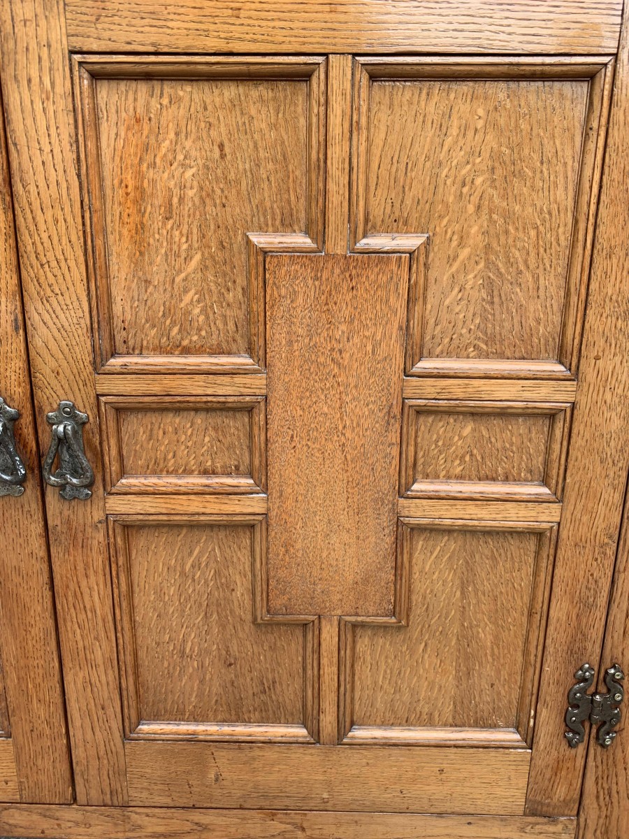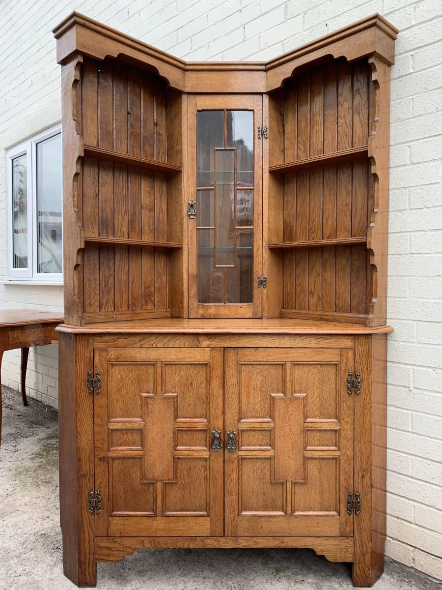 The removable top section has a central glazed door which opens to reveal two removable glass display shelves this door is flanked by a pair of shelves, the corners of the shelves are wavy. The bottom section has an over sailing top which sits above a pair of recessed panelled oak doors. The doors open to reveal shelving to the left-hand side and there are three handy storage drawers to the right. Please note this item is made entirely of glorious golden oak.