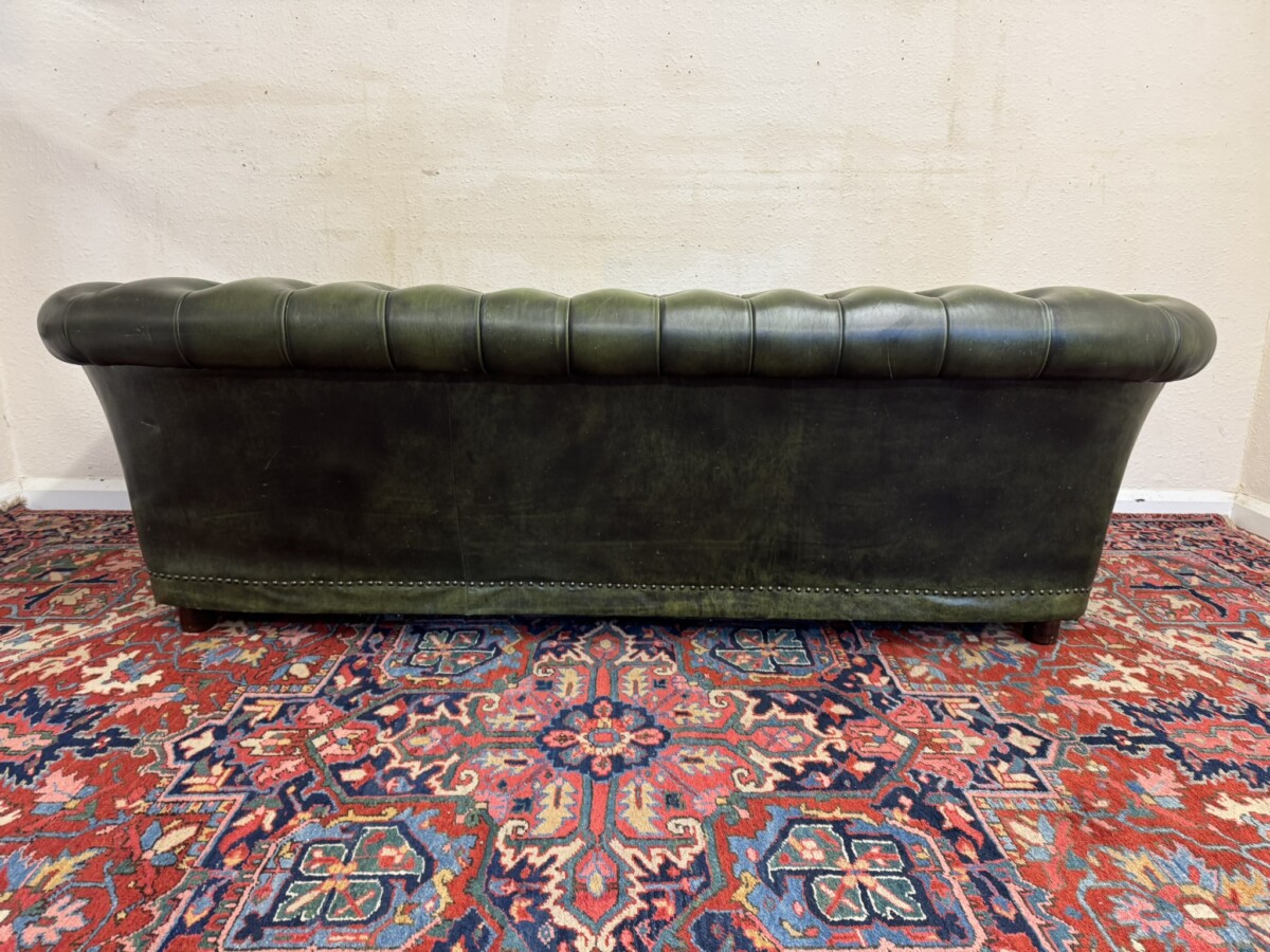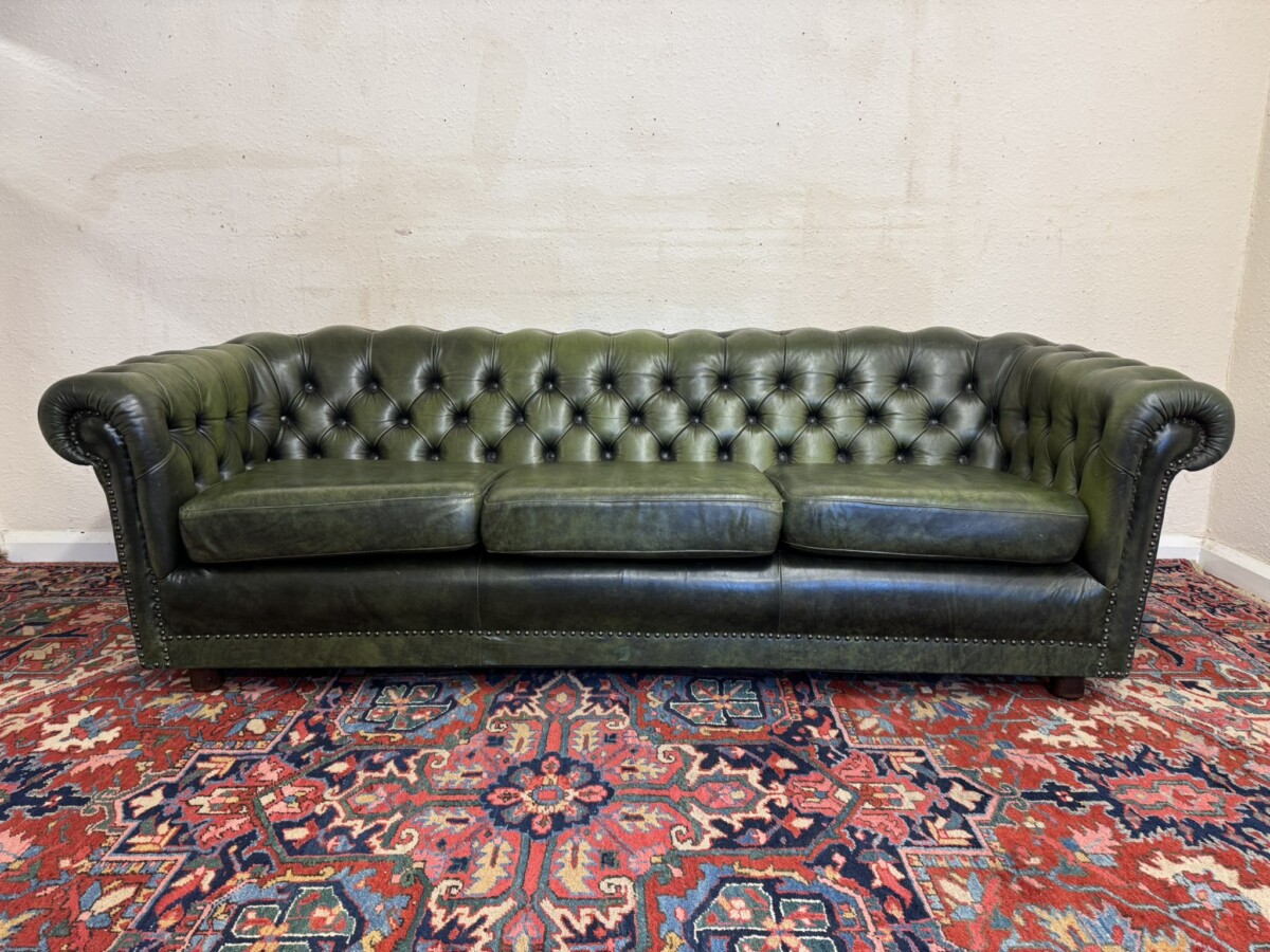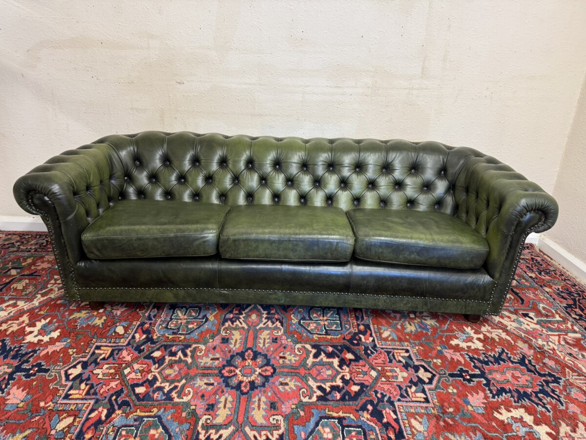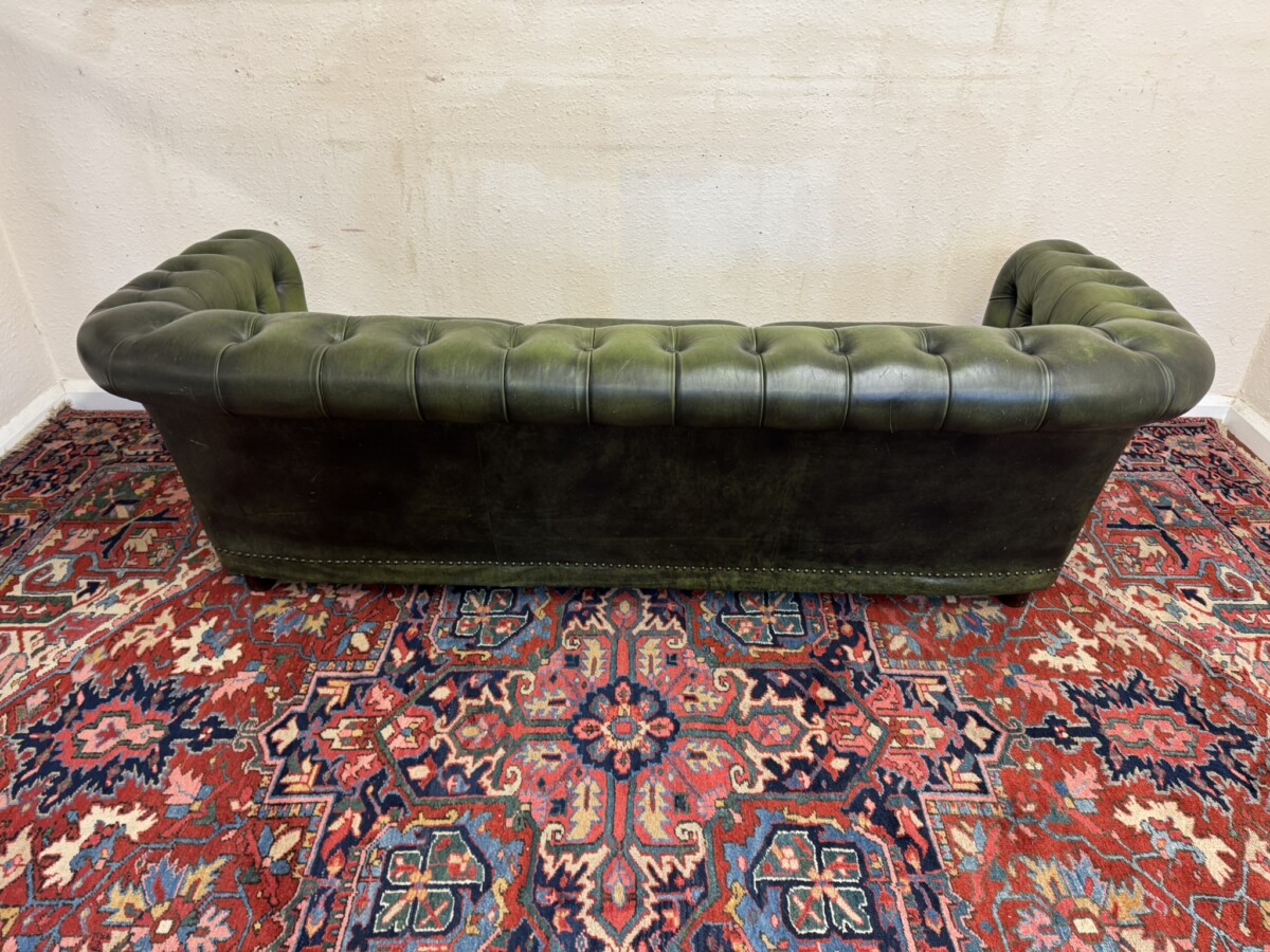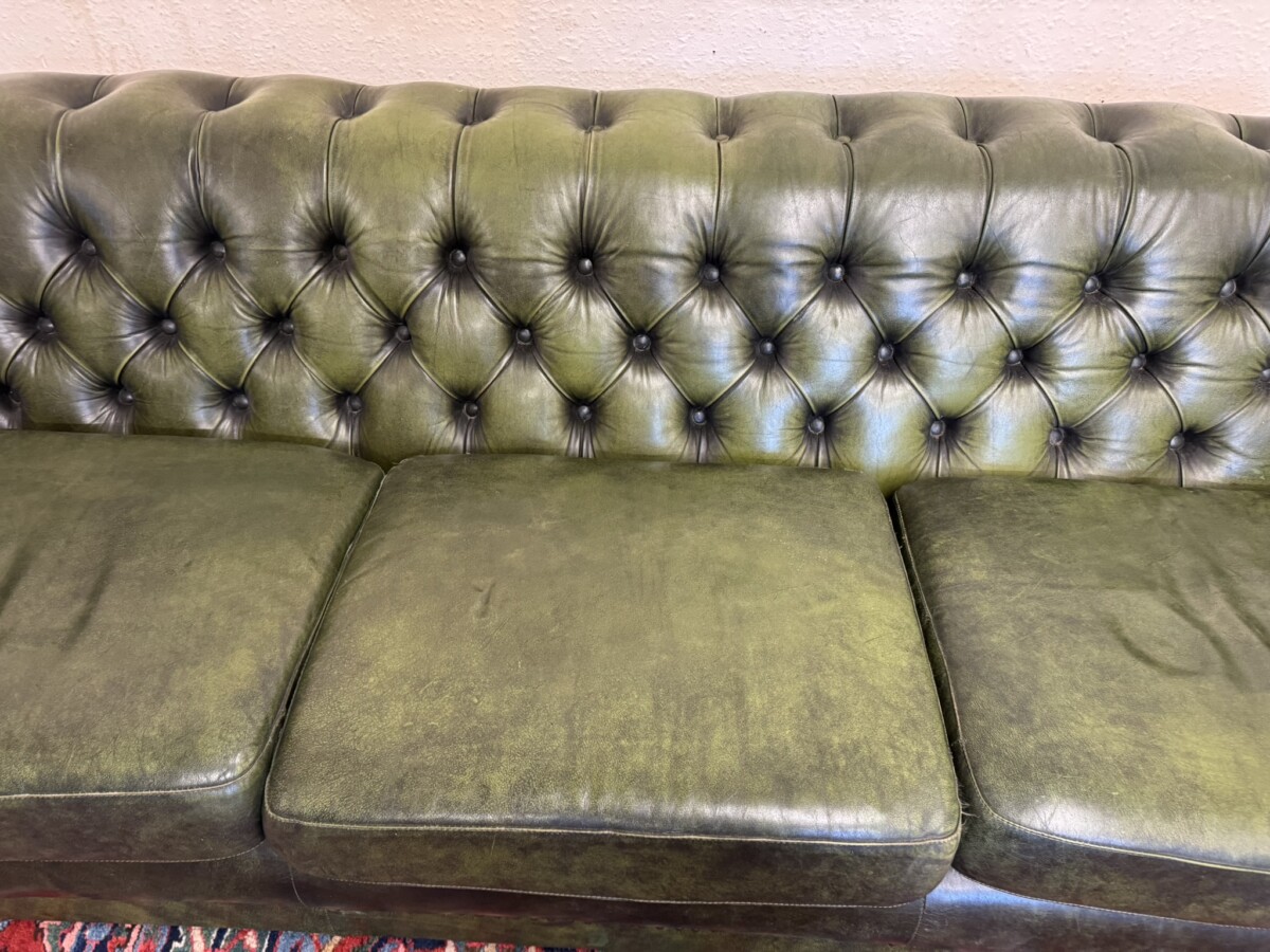 The sofa has deep buttoned back and arms, three removable seat cushions with studied decoration.
