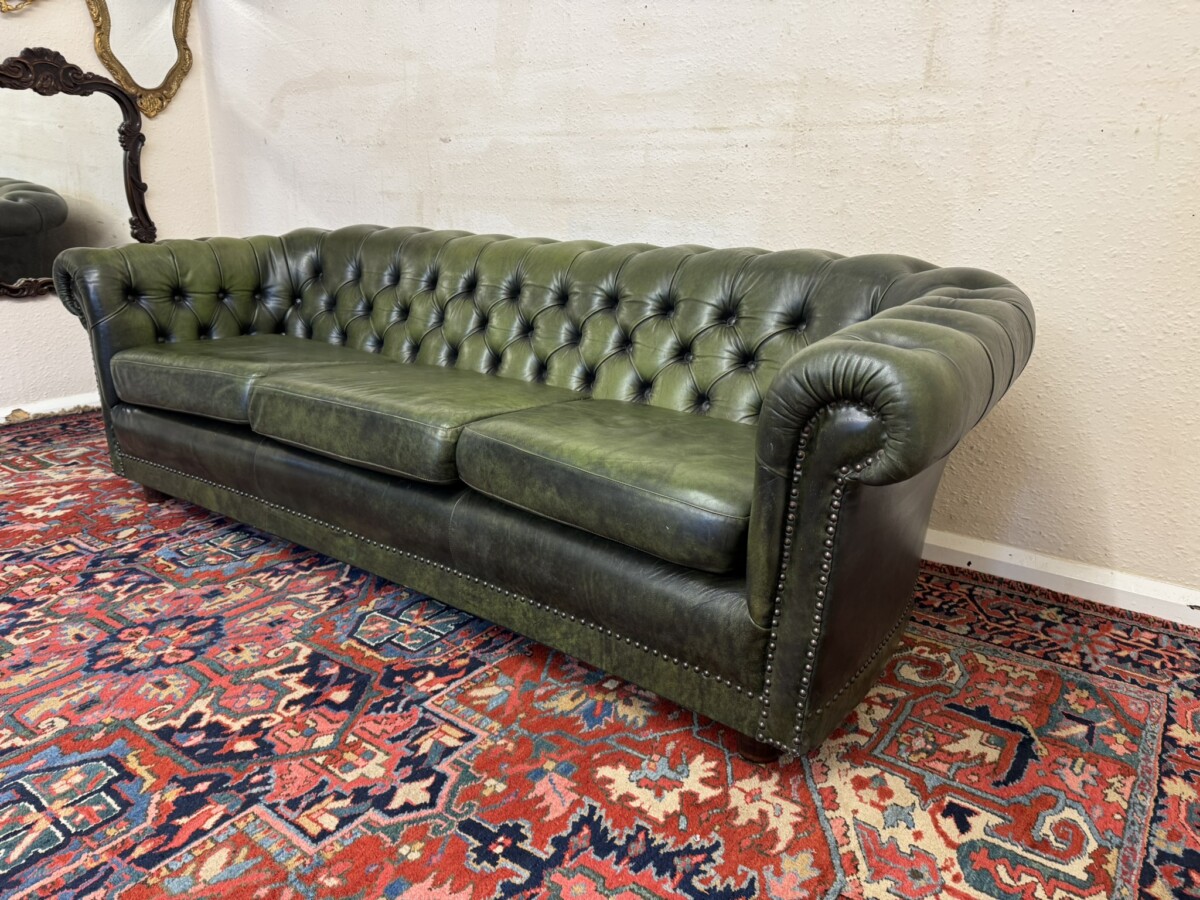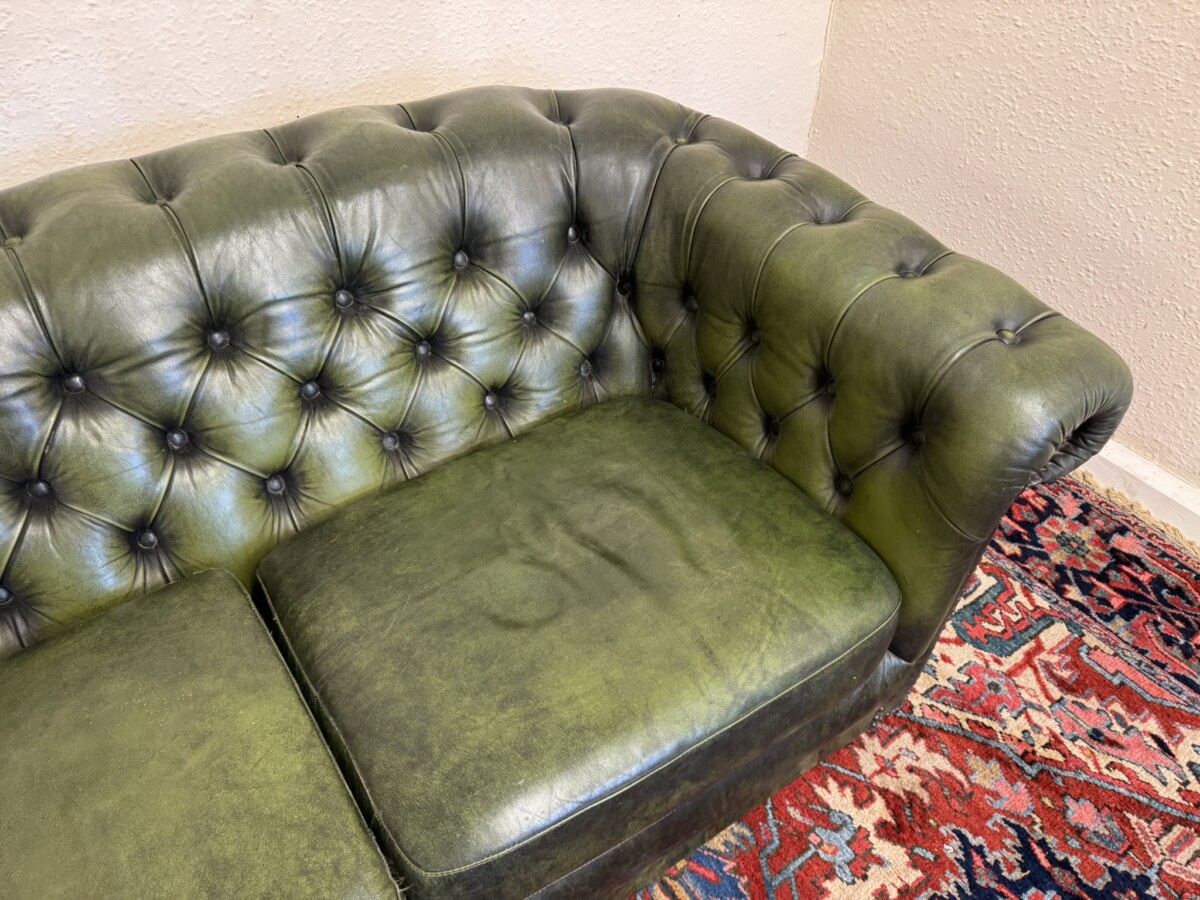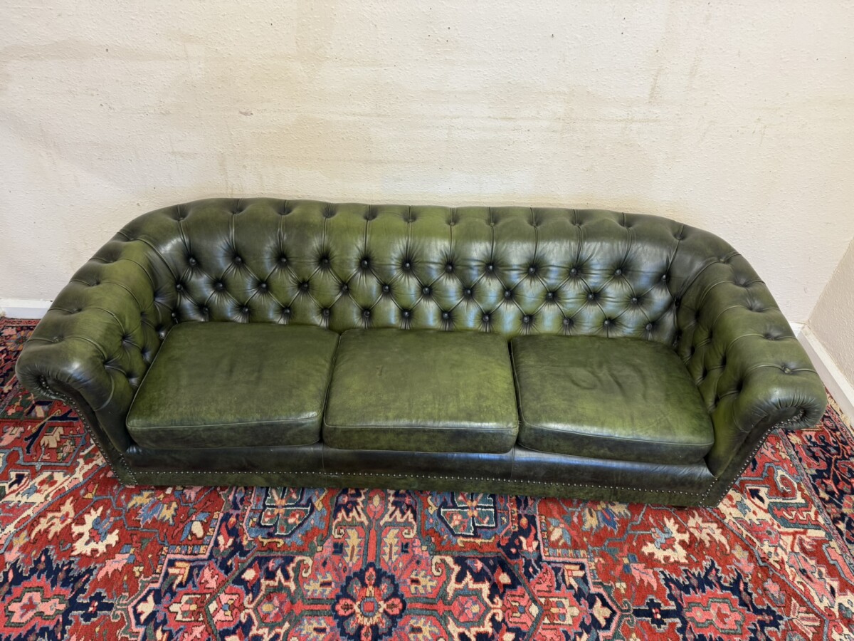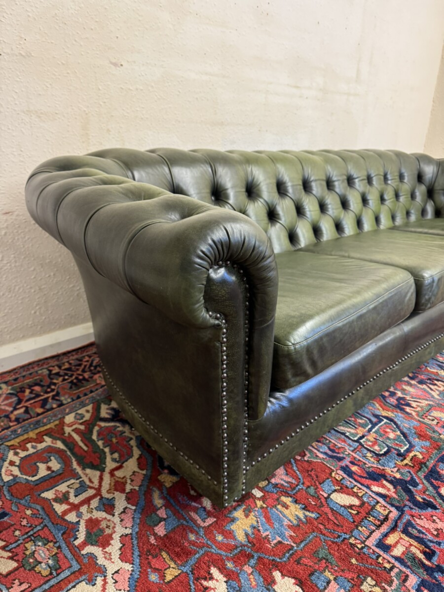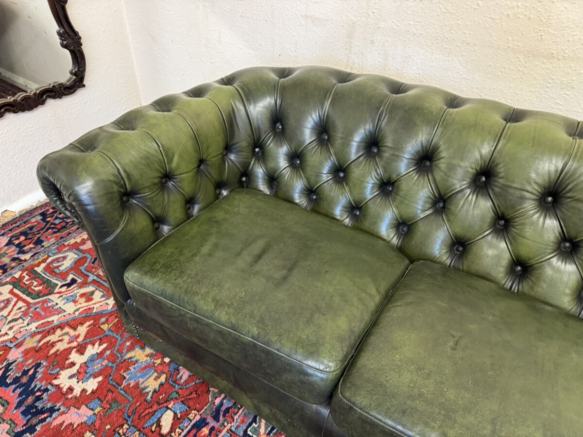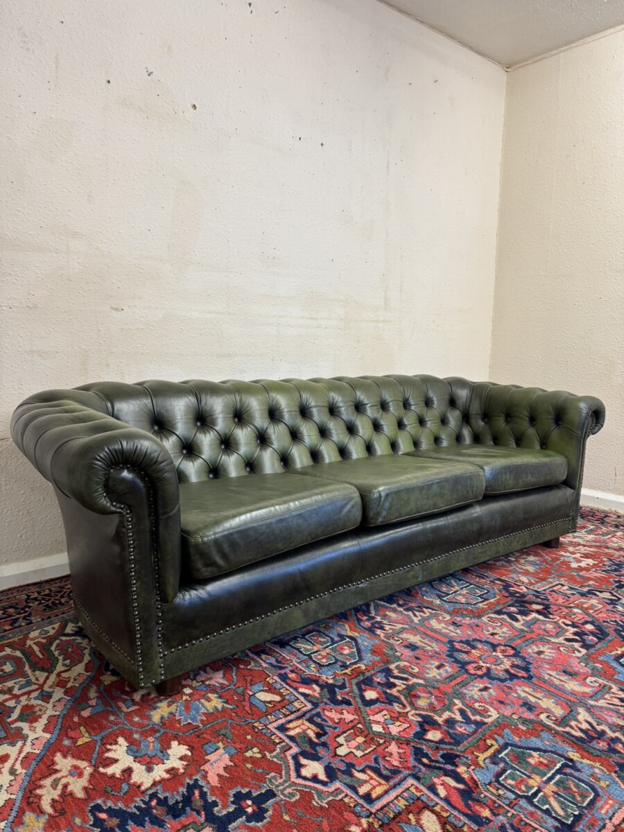 The sofa has deep buttoned back and arms, three removable seat cushions with studied decoration.