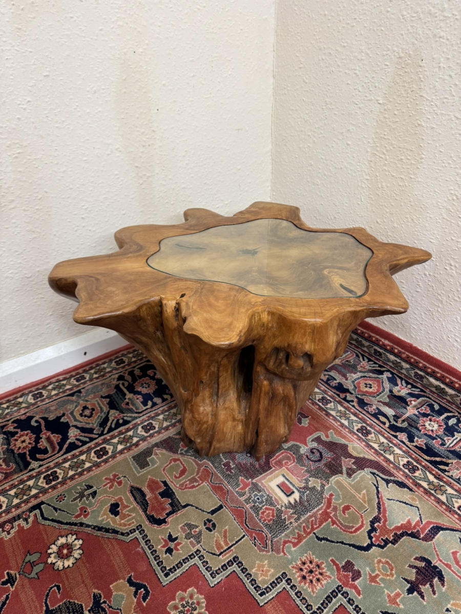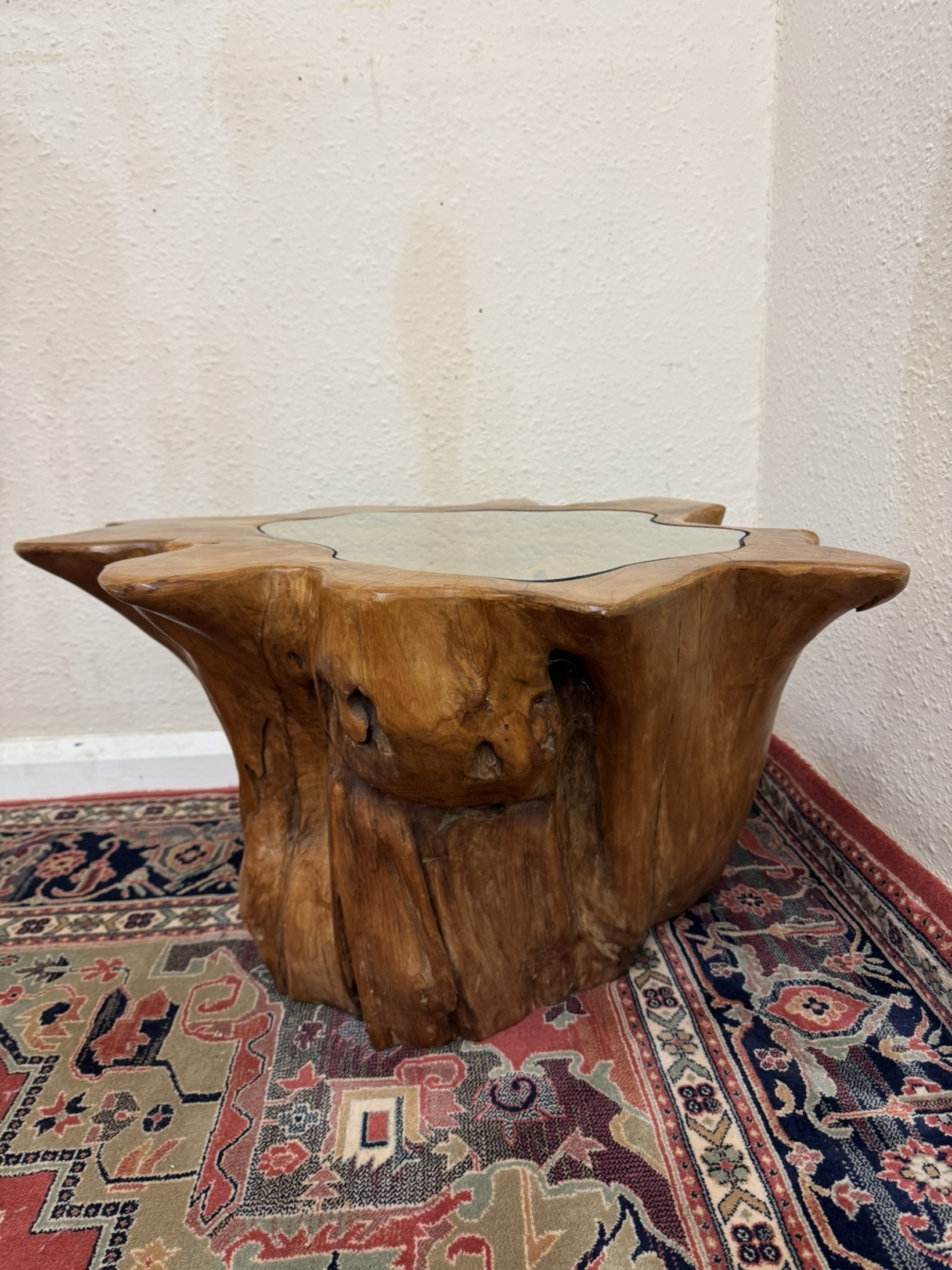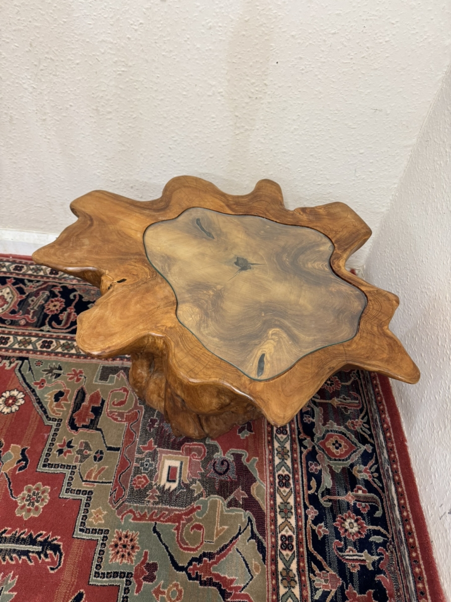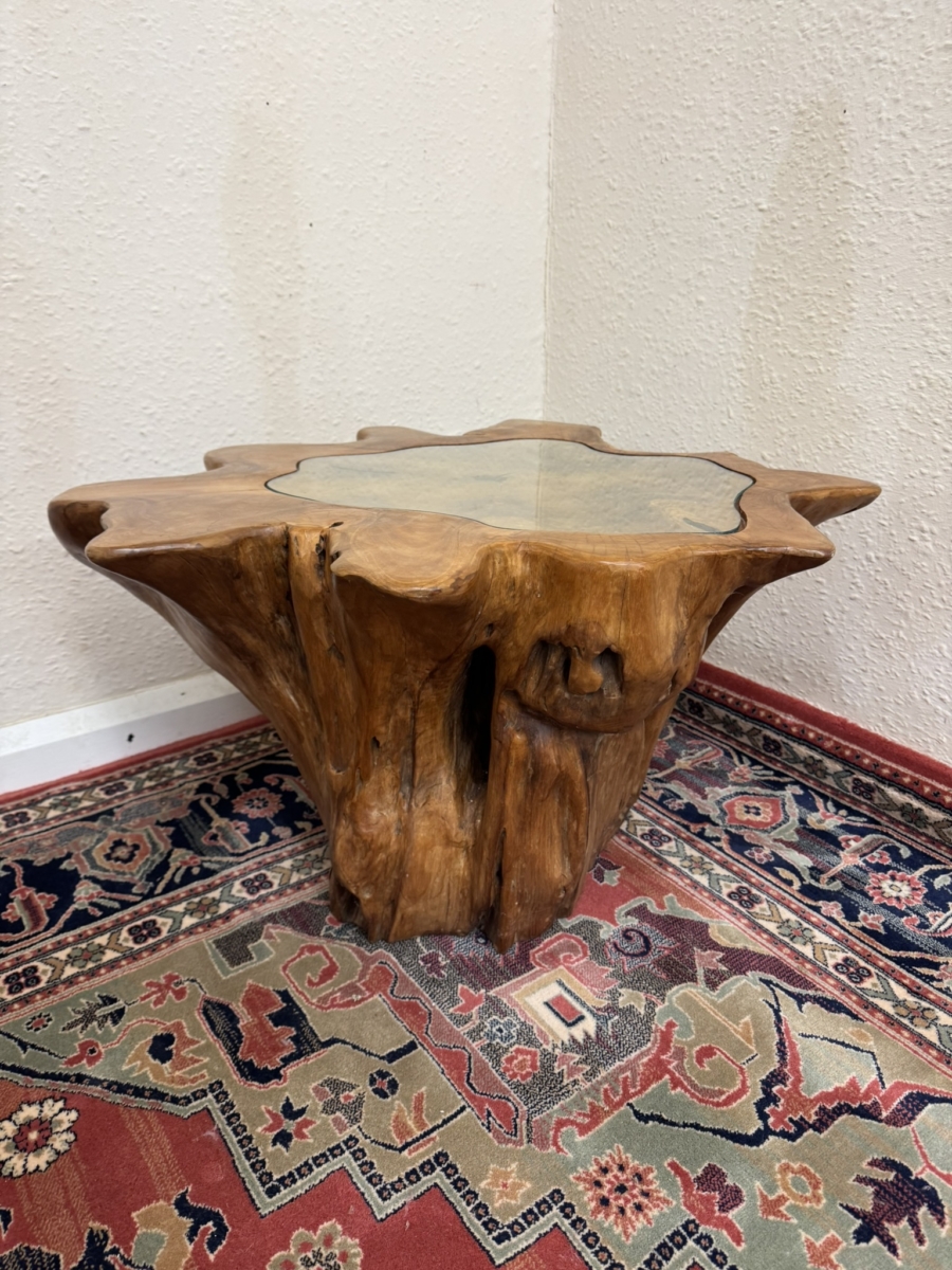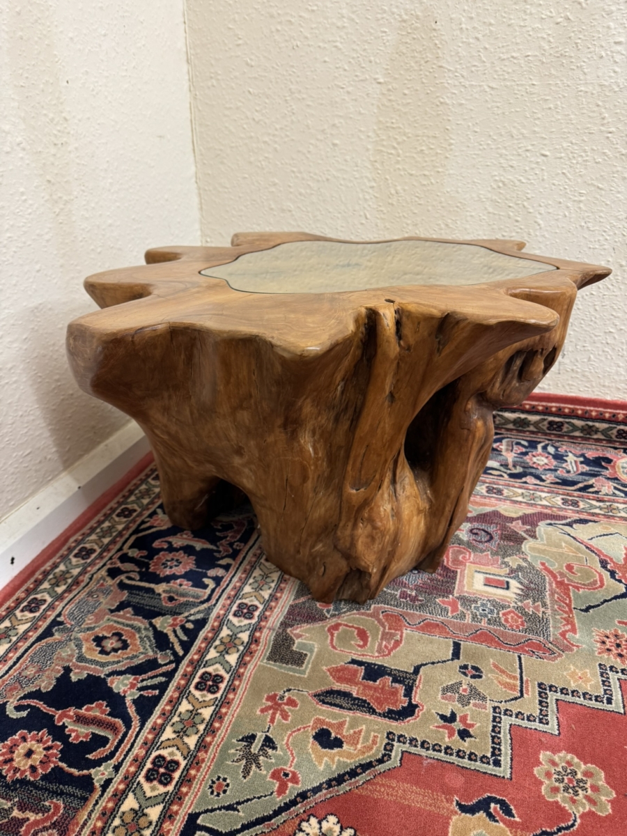 This is a rustic handcrafted coffee table made from a large natural wood root. The table retains its organic irregular shape which highlights the natural wood grain and curves of the wood. In the centre a custom glass insert fits into a recessed area providing a functional surface whilst allowing the visibility of the unique wood patterns.