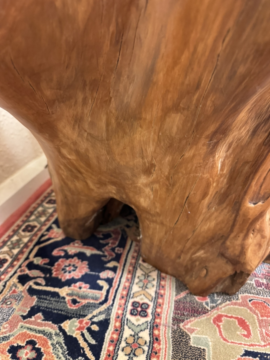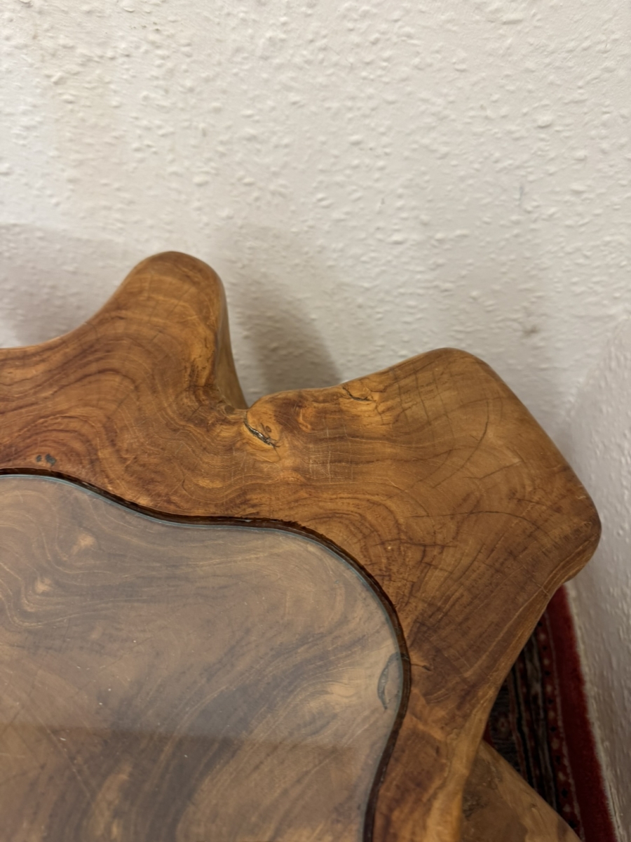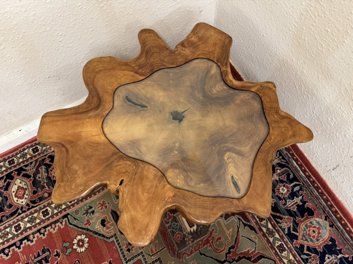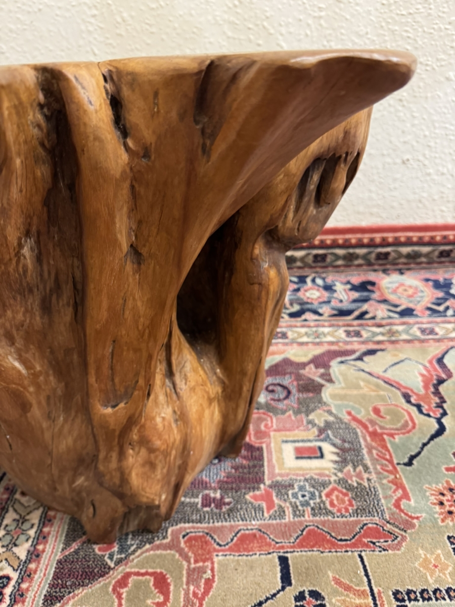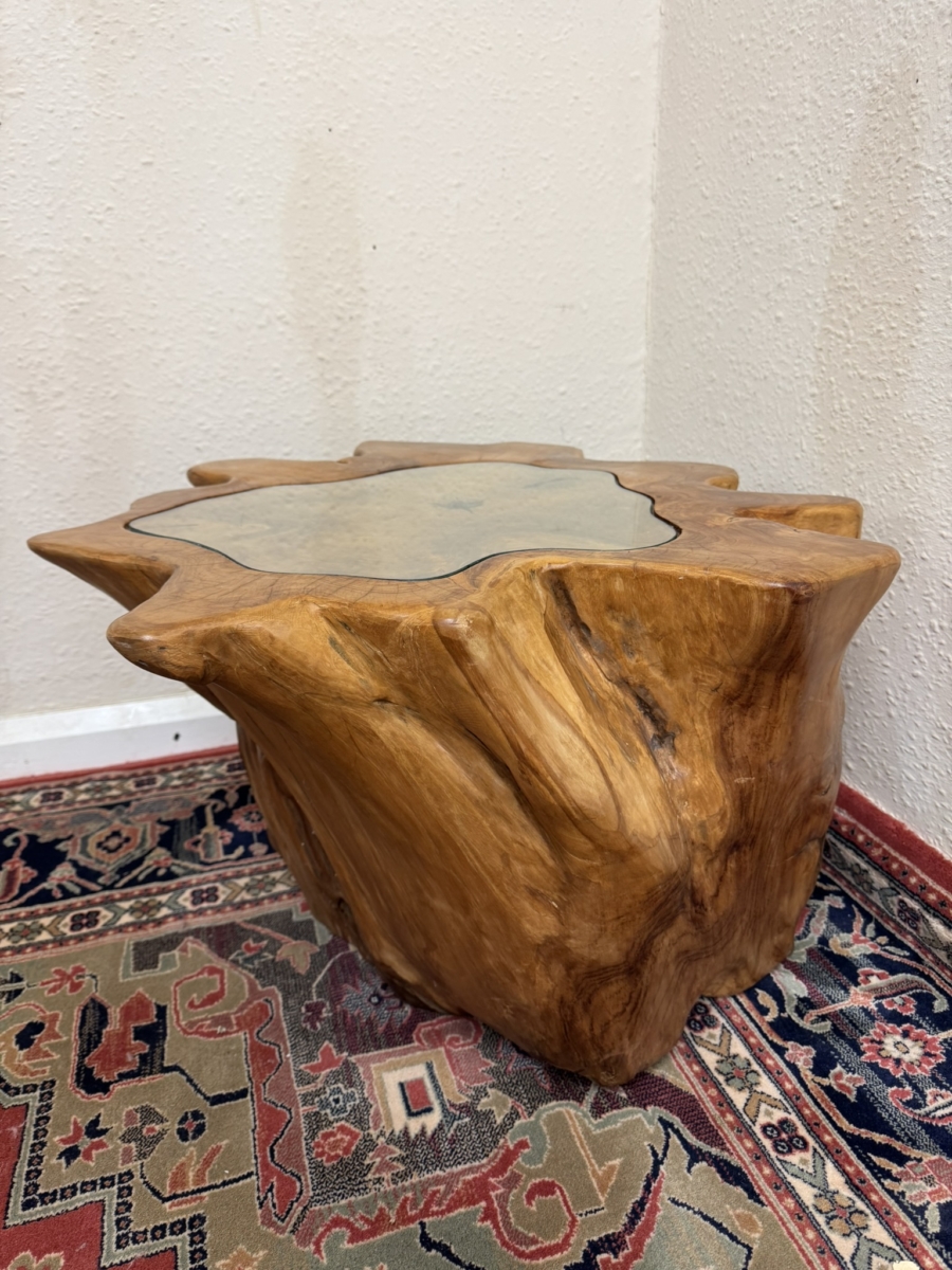 This is a rustic handcrafted coffee table made from a large natural wood root. The table retains its organic irregular shape which highlights the natural wood grain and curves of the wood. In the centre a custom glass insert fits into a recessed area providing a functional surface whilst allowing the visibility of the unique wood patterns.