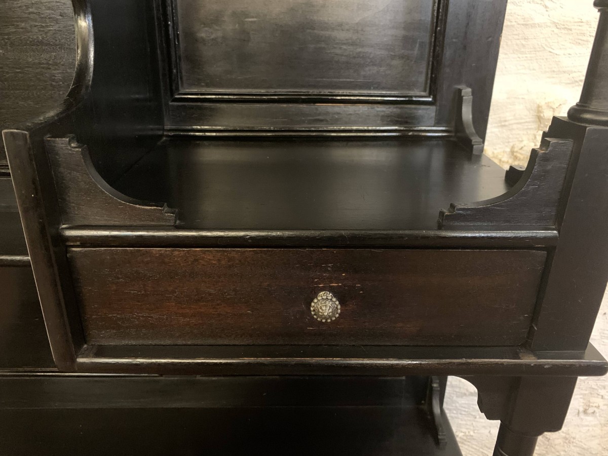 A fine example of aesthetic movement furniture. The stepped top has four finials. Below is a bevelled glass cupboard door a drawer and an arrangement of shelving all connected with elegant turned and carved supports. This fantastic item sits on two turned feet to the front.