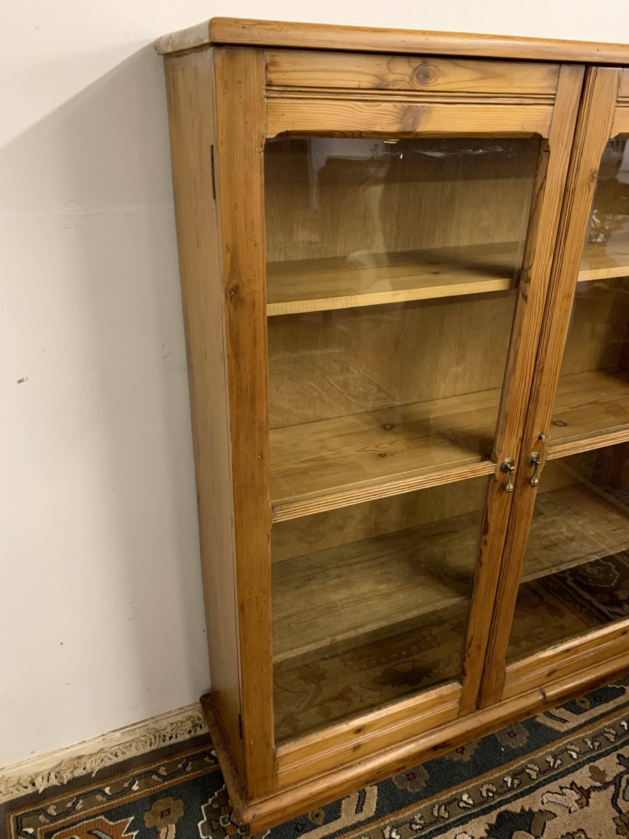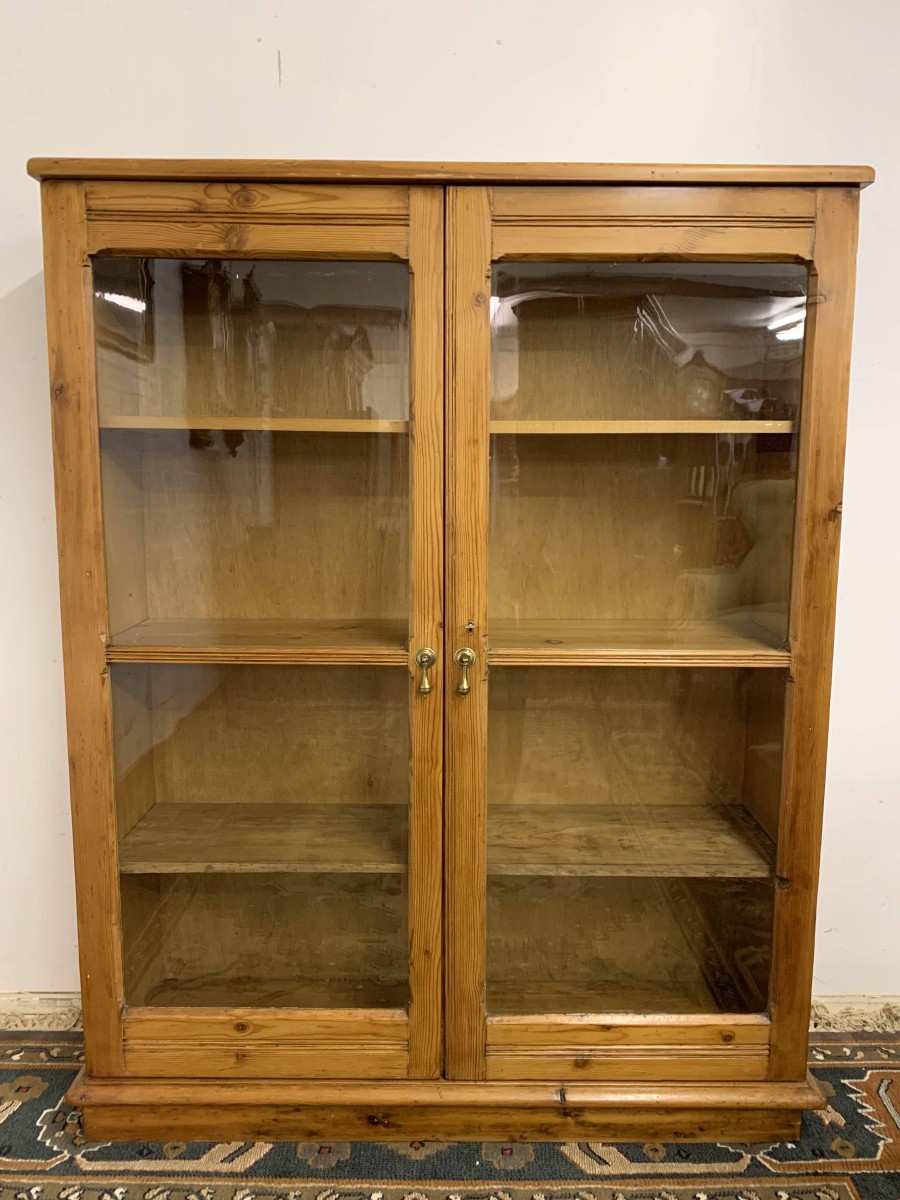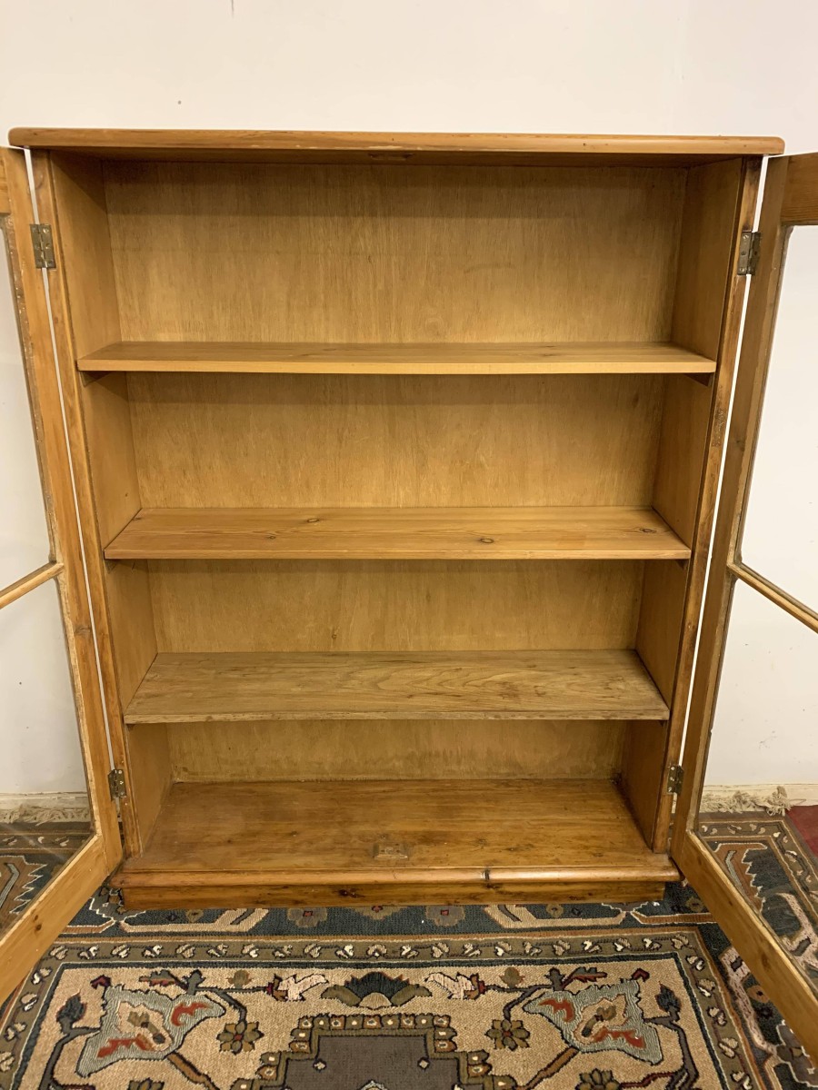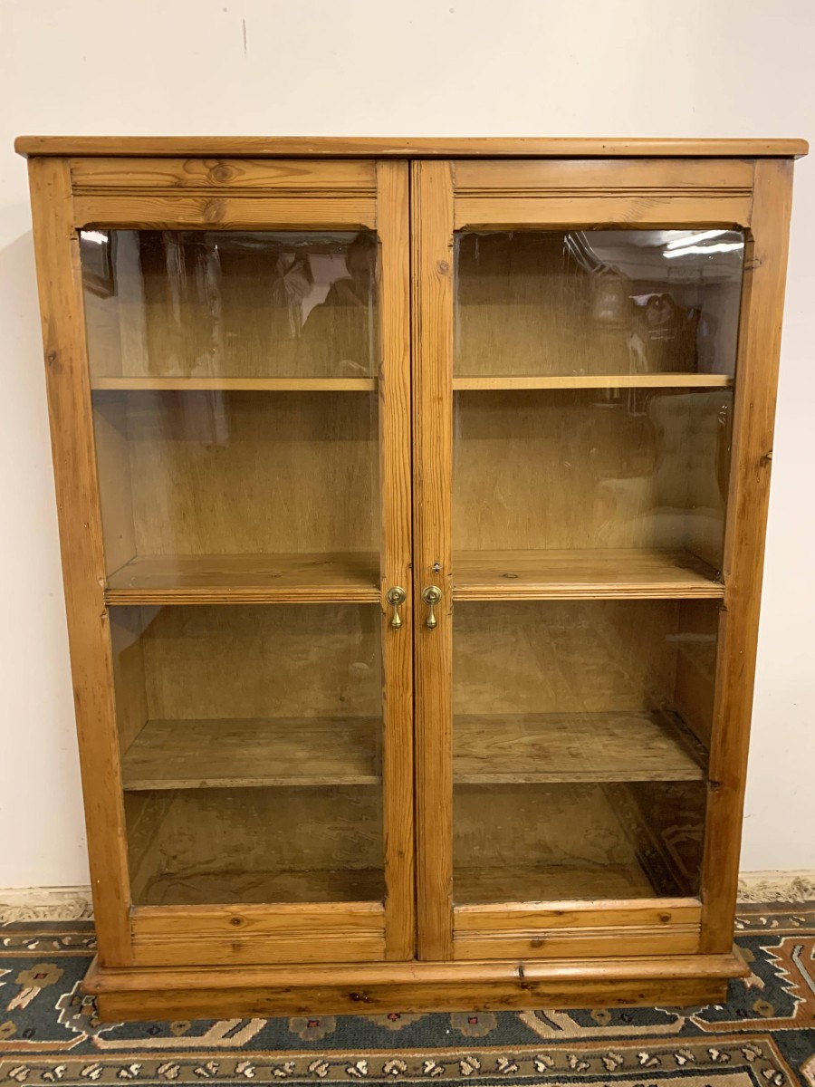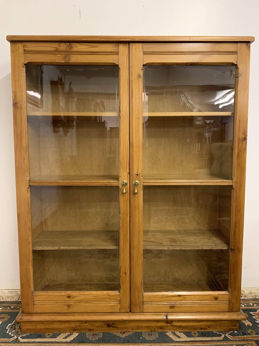 The over sailing top sits above a pair of lockable glazed doors, each door having brass drop handle. The doors open to reveal three removable shelves, offering ample storage. The bookcase sits on a platform base.
