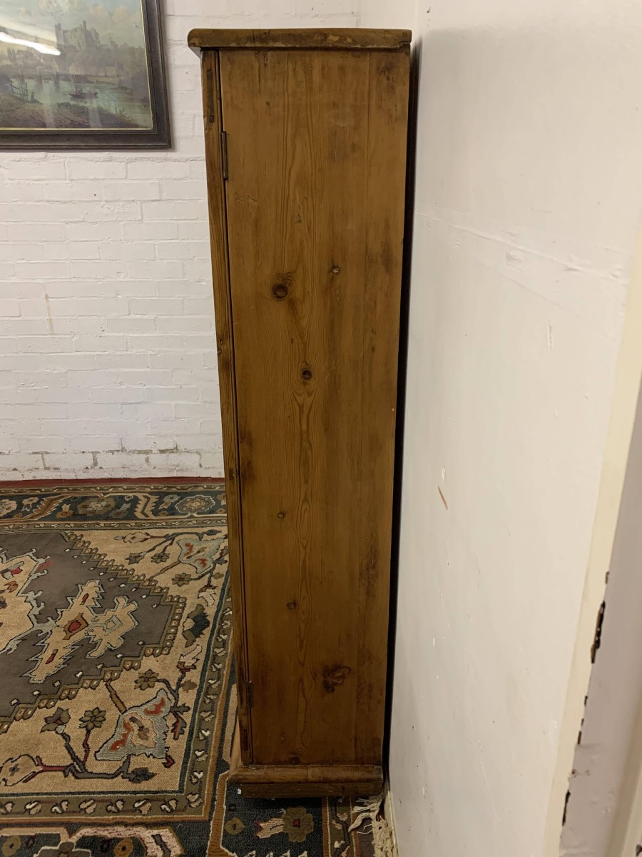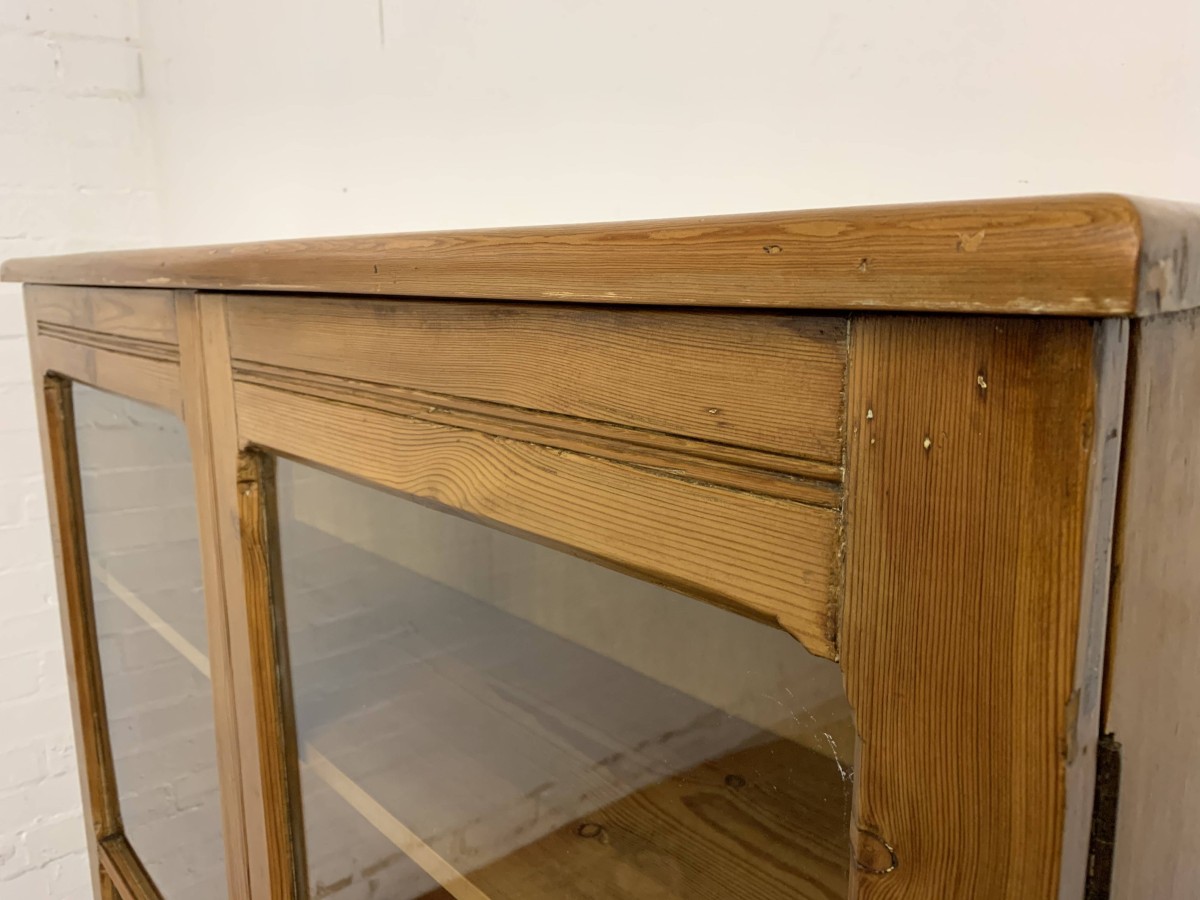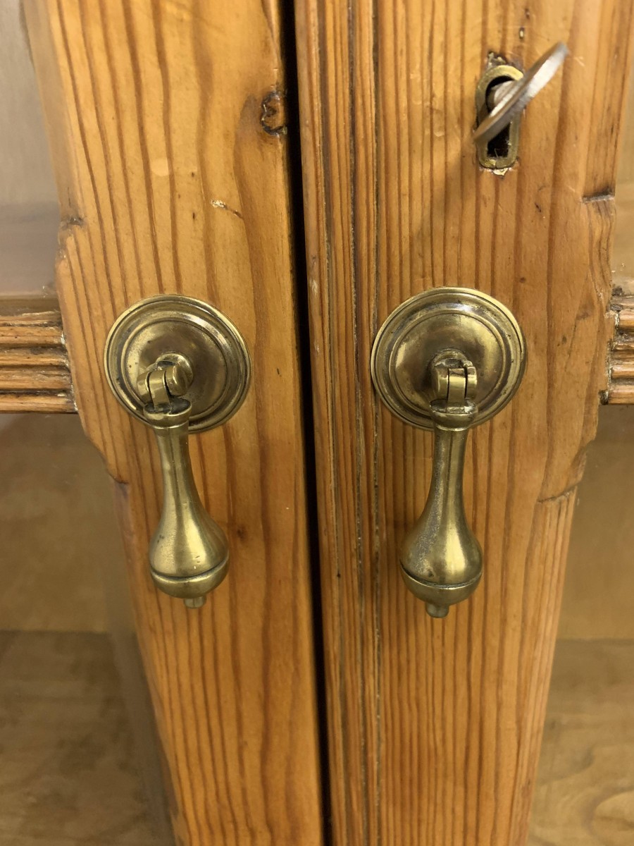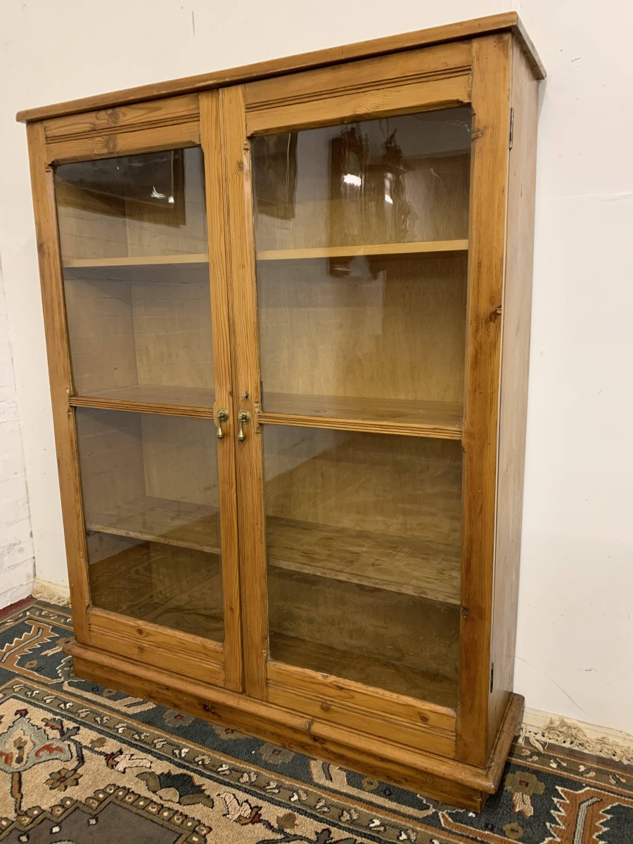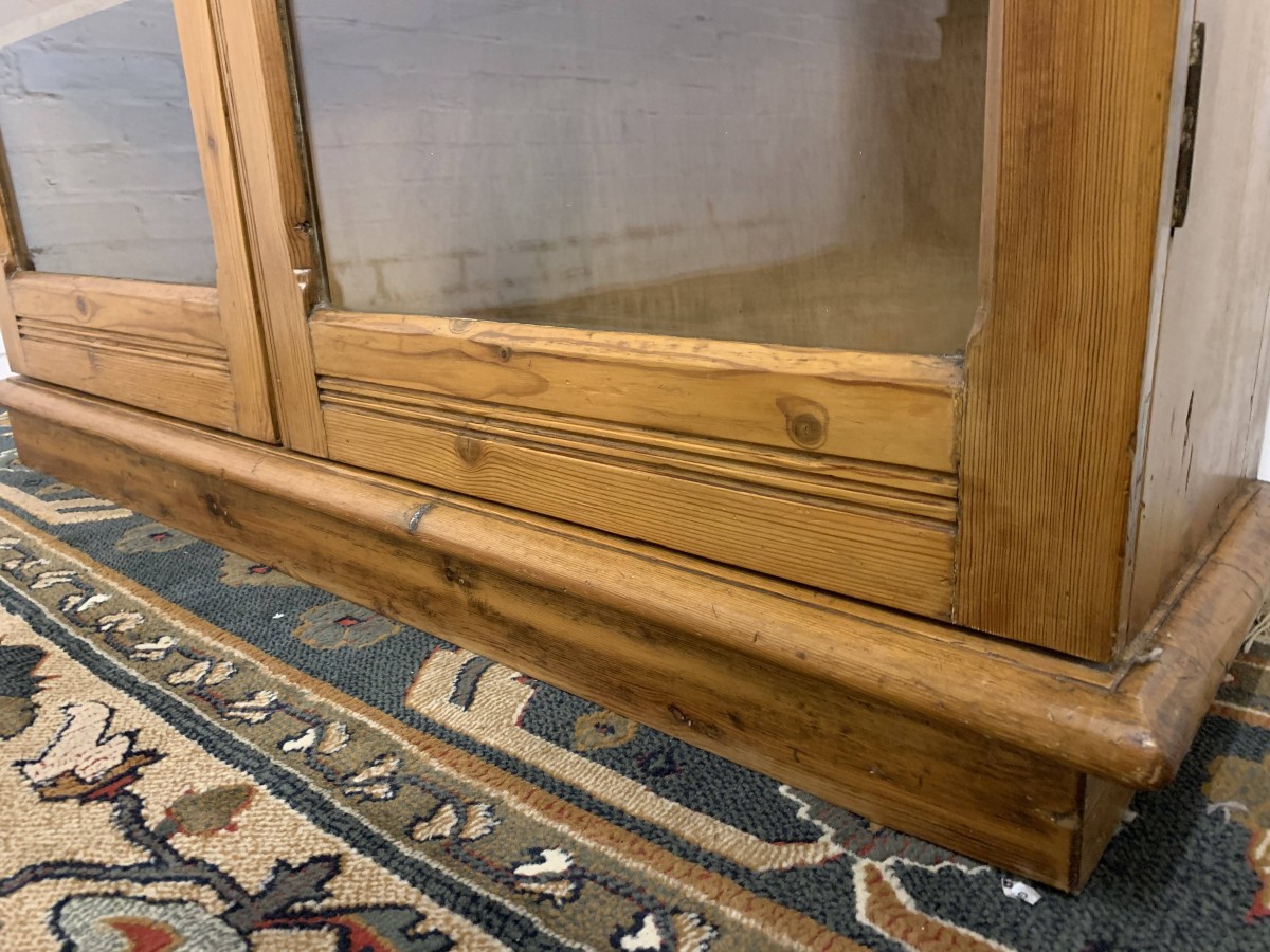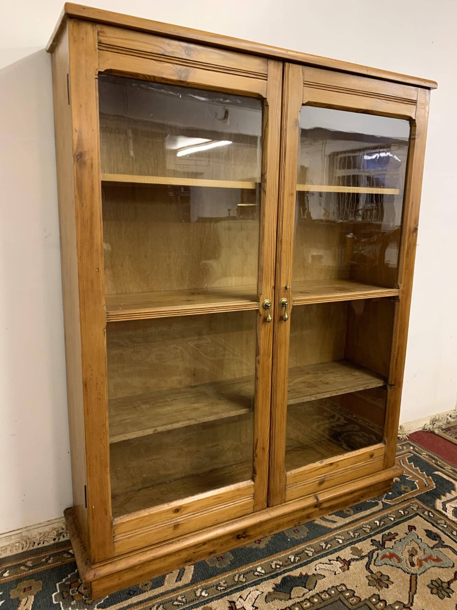 The over sailing top sits above a pair of lockable glazed doors, each door having brass drop handle. The doors open to reveal three removable shelves, offering ample storage. The bookcase sits on a platform base.