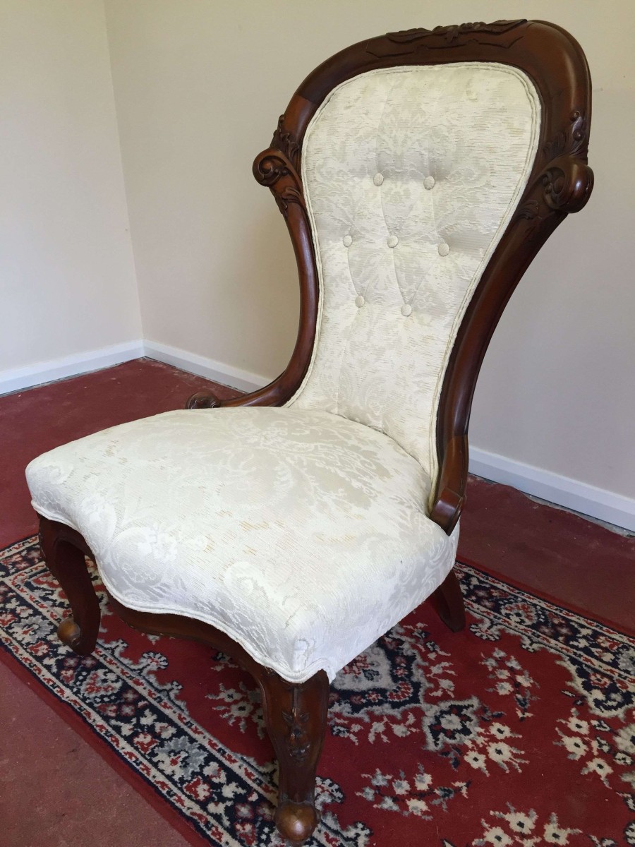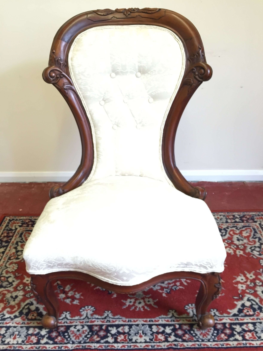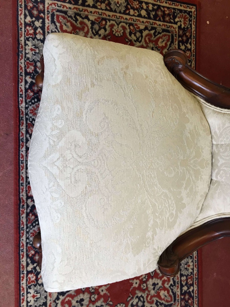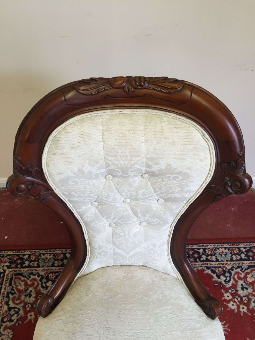 Classic style chair, carved mahogany frame with damask fabric upholstery.