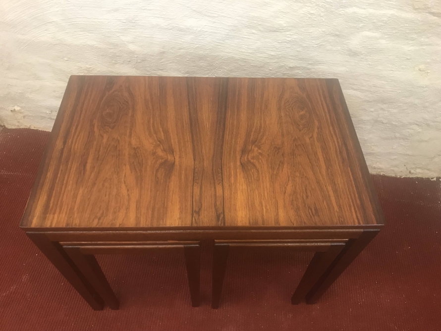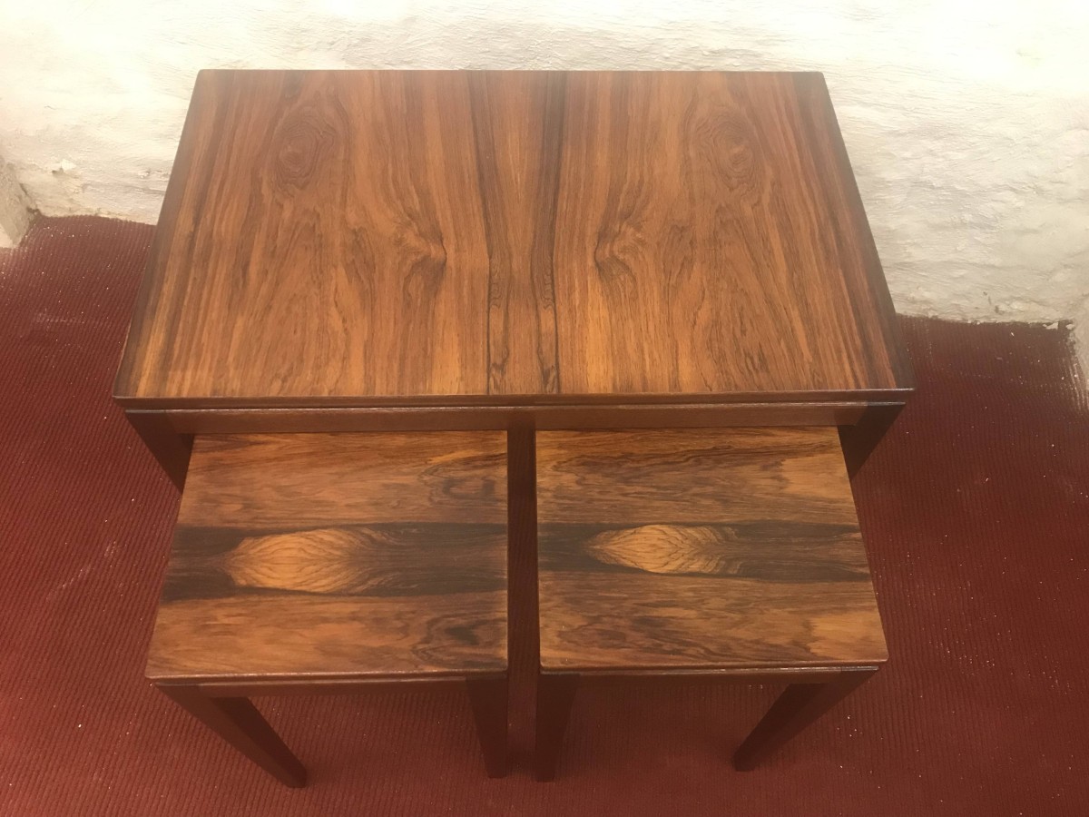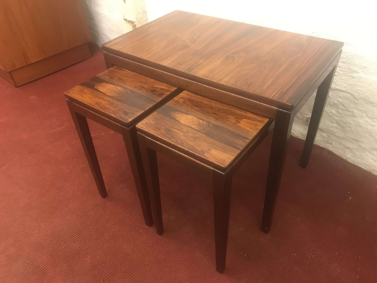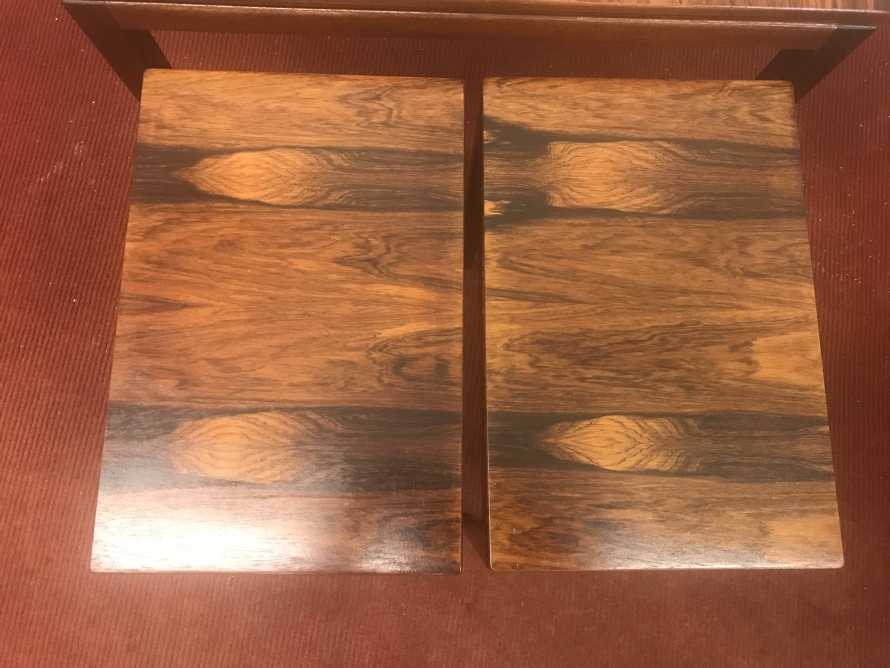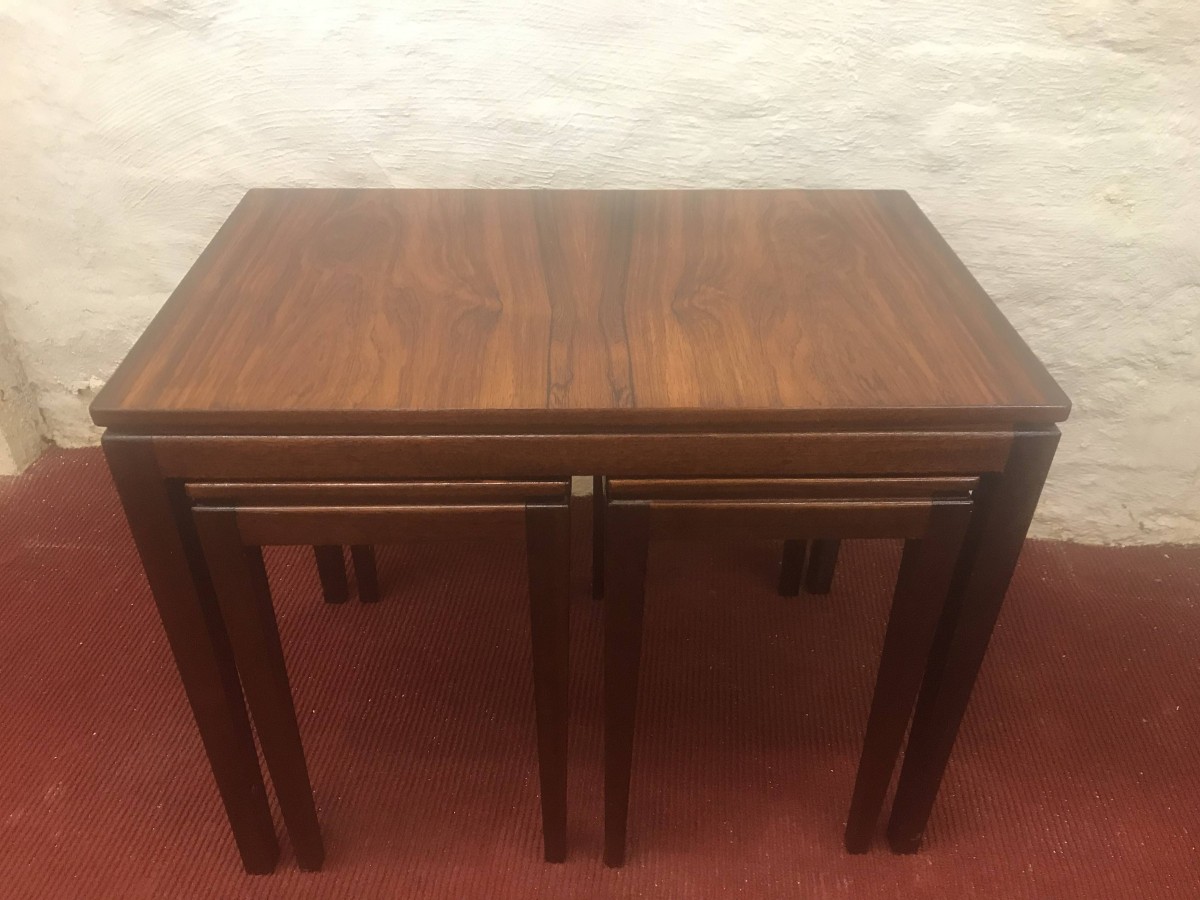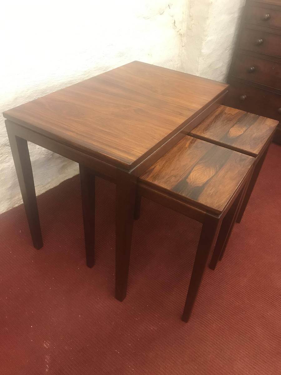 Mid-Century set of three rosewood nesting tables featuring angular shapes and nice details.