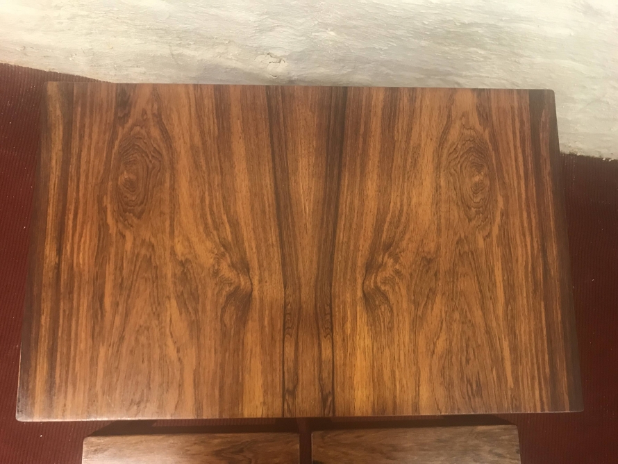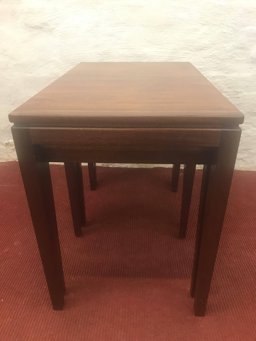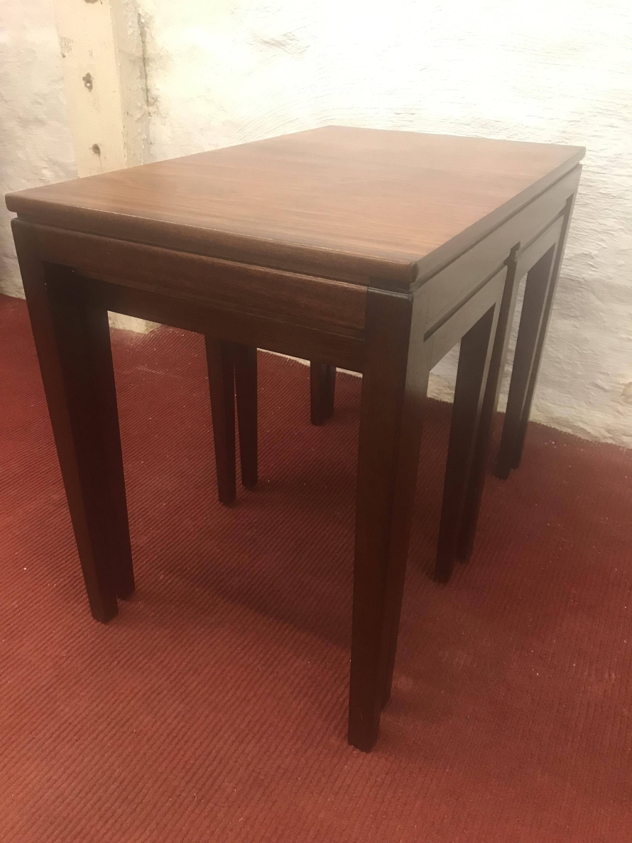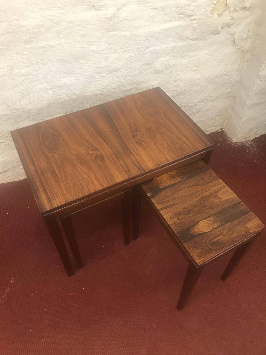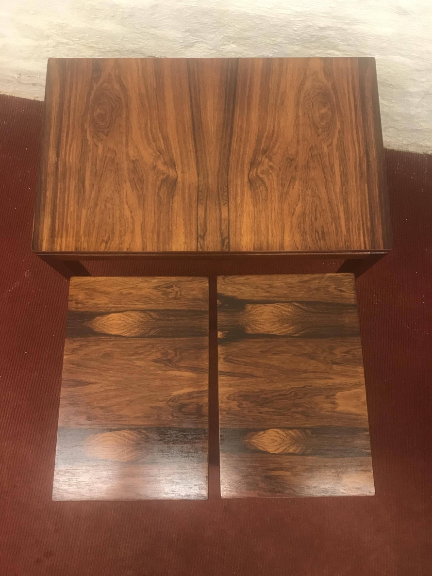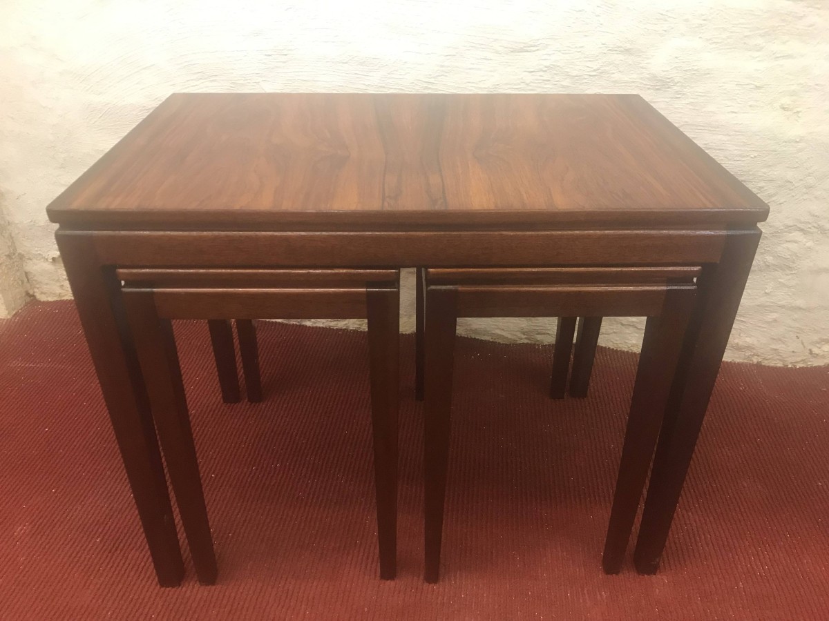 Mid-Century set of three rosewood nesting tables featuring angular shapes and nice details.