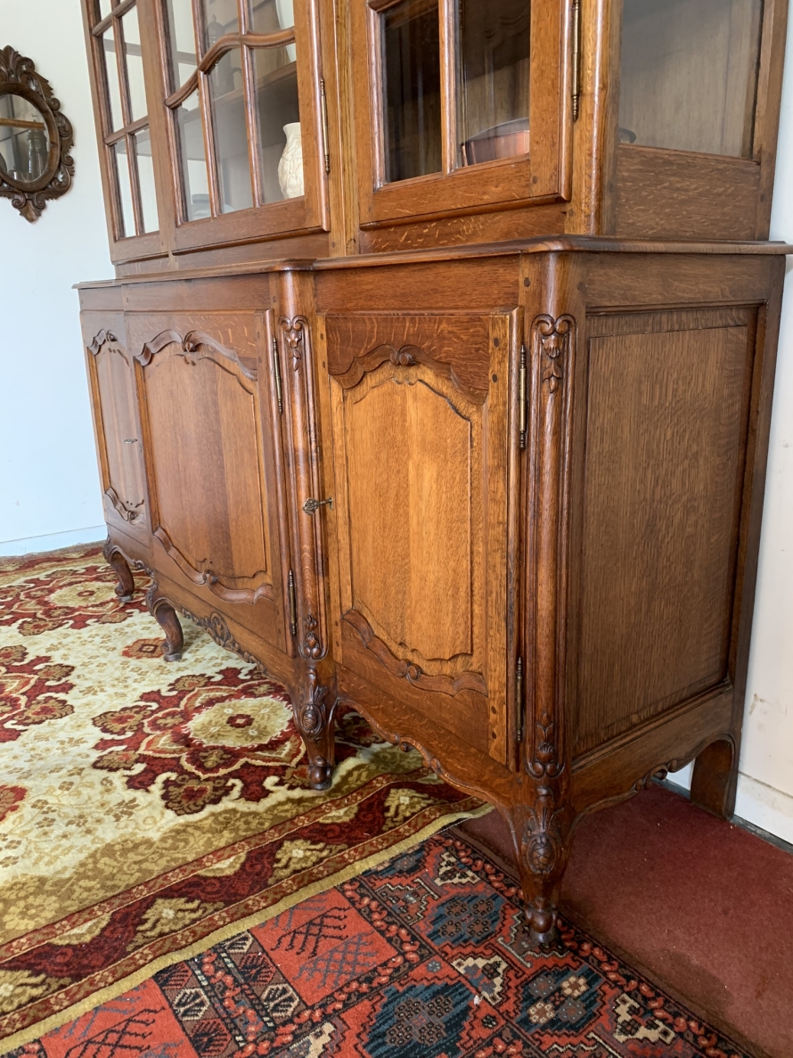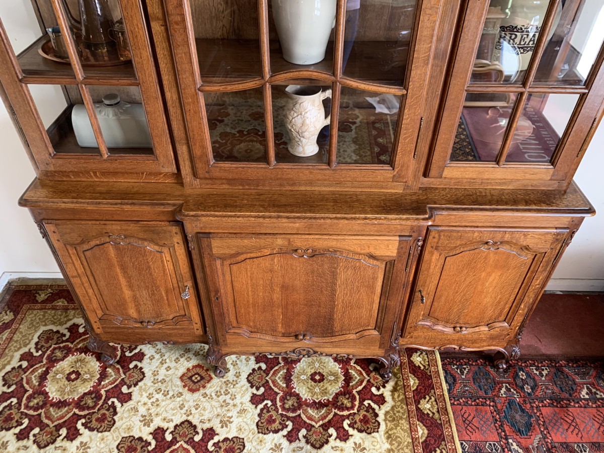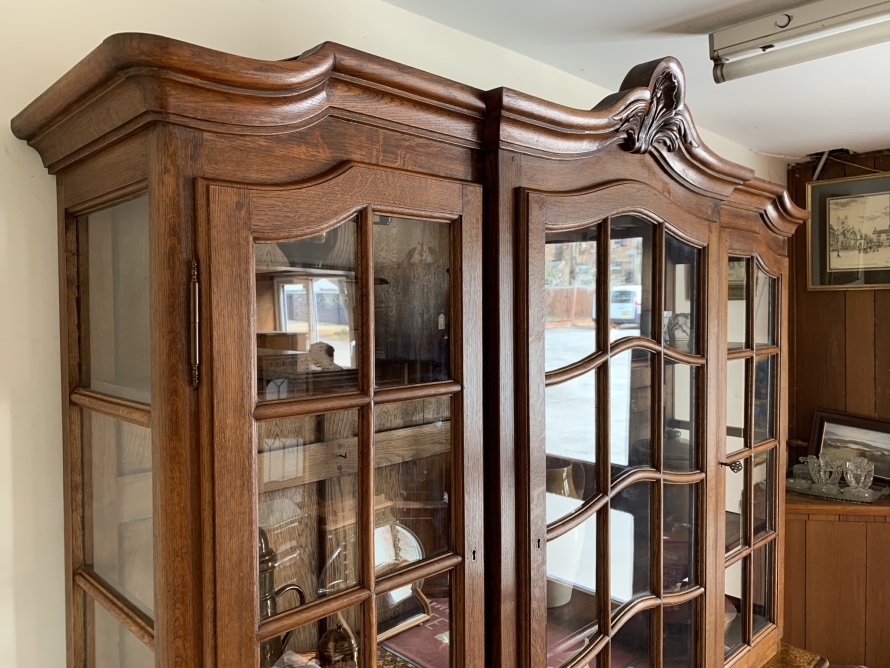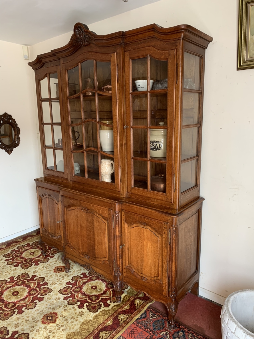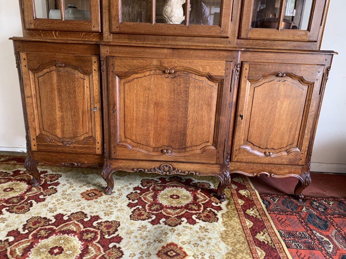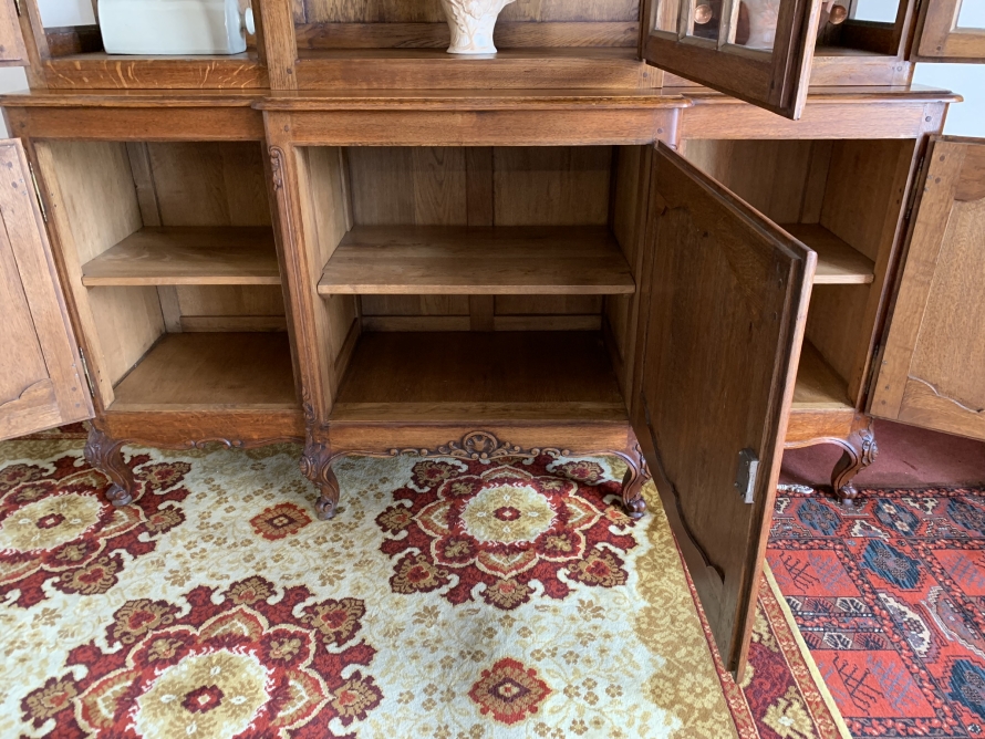 Made in glorious solid oak this cabinet dates circa 1920. The oversailing top rises to a decorative central carving. Three lockable glazed doors, the central door are brakefront the doors open to reveal two removable shelves. The top section is glazed to the sides, below are three lockable shaped recessed panelled doors, the central door is breakefront, the doors open to reveal a removable shelf. Recessed panelled sides, shaped skirt with decorative central carving this stunning French cabinet stands on four carved cabriole legs to the front.
