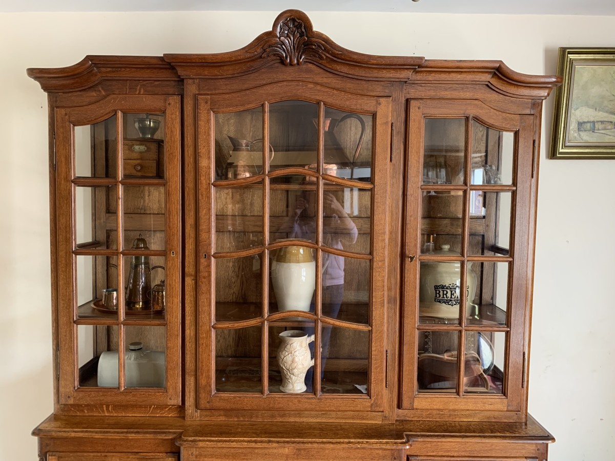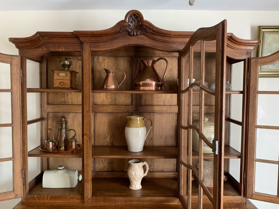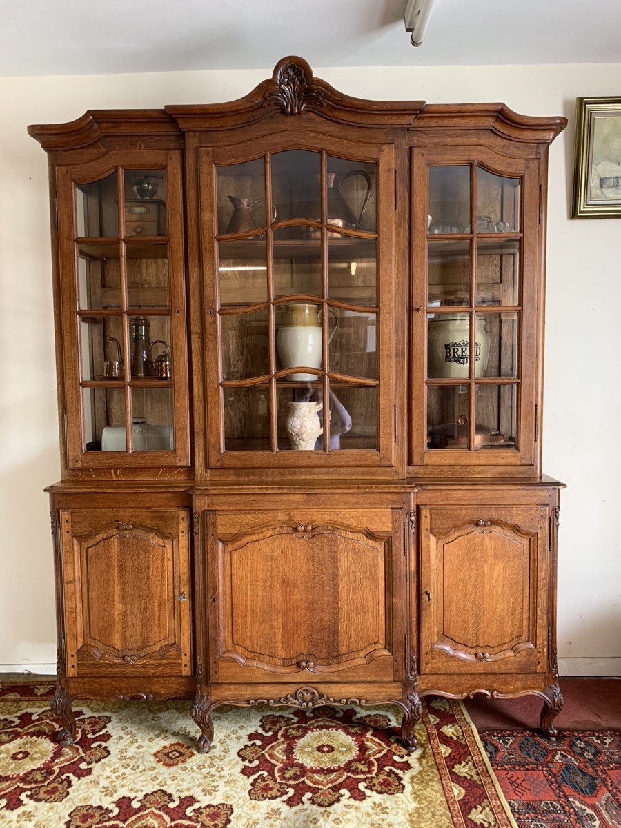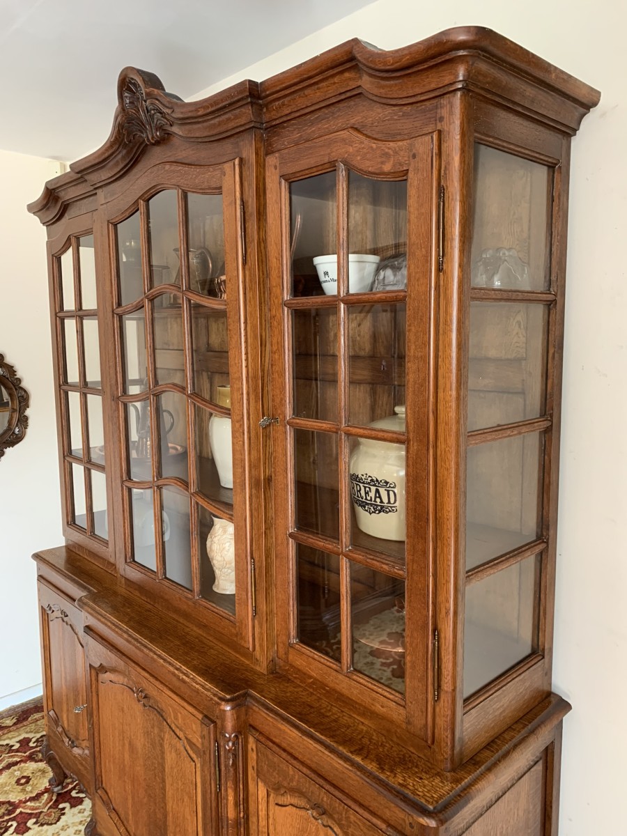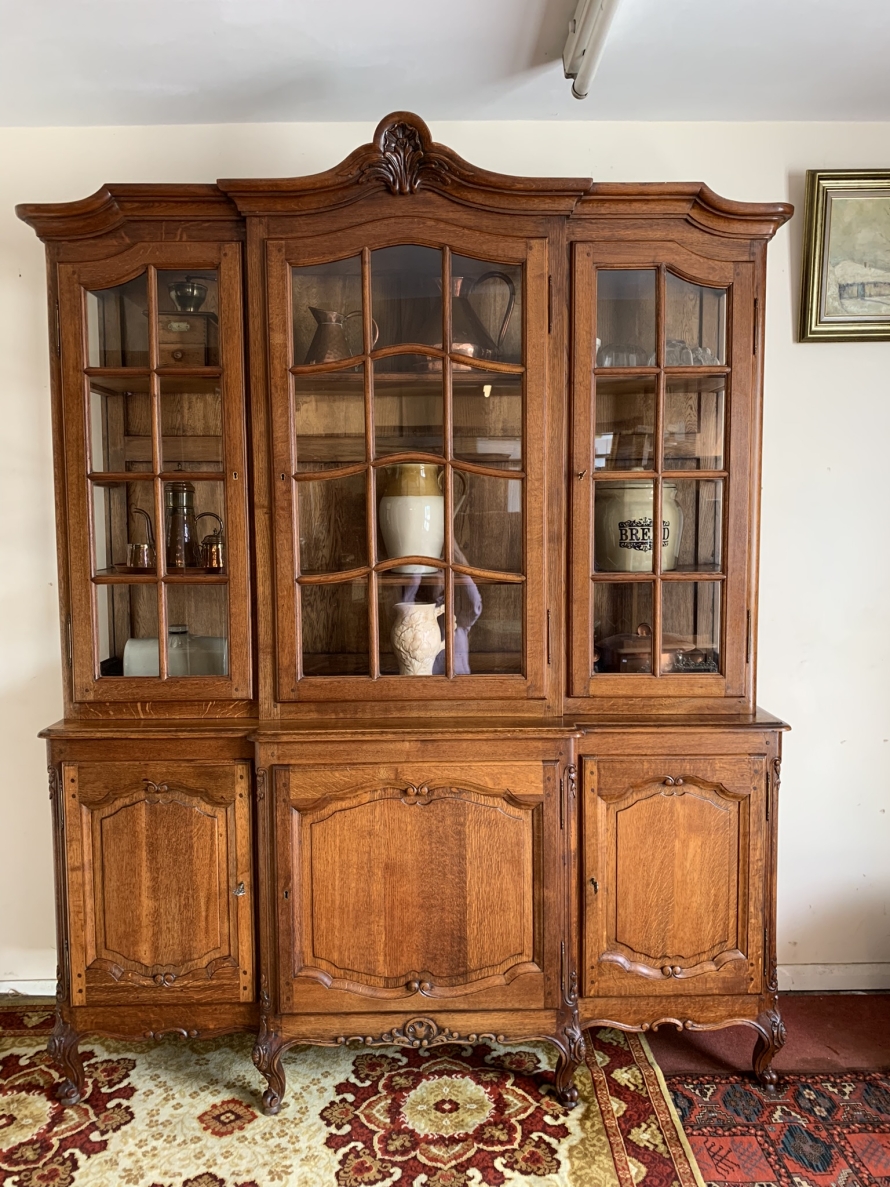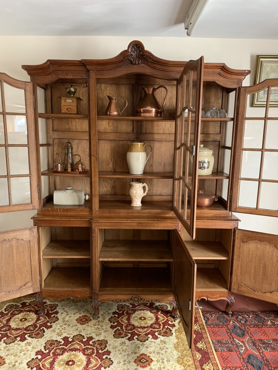 Made in glorious solid oak this cabinet dates circa 1920. The oversailing top rises to a decorative central carving. Three lockable glazed doors, the central door are brakefront the doors open to reveal two removable shelves. The top section is glazed to the sides, below are three lockable shaped recessed panelled doors, the central door is breakefront, the doors open to reveal a removable shelf. Recessed panelled sides, shaped skirt with decorative central carving this stunning French cabinet stands on four carved cabriole legs to the front.