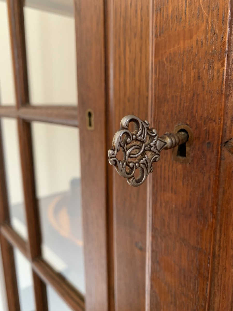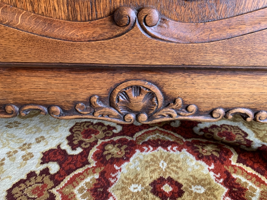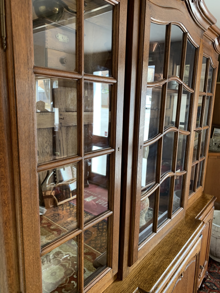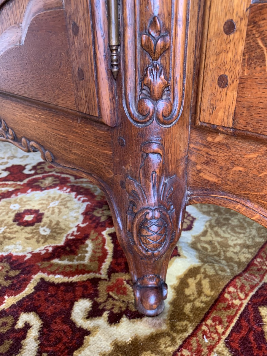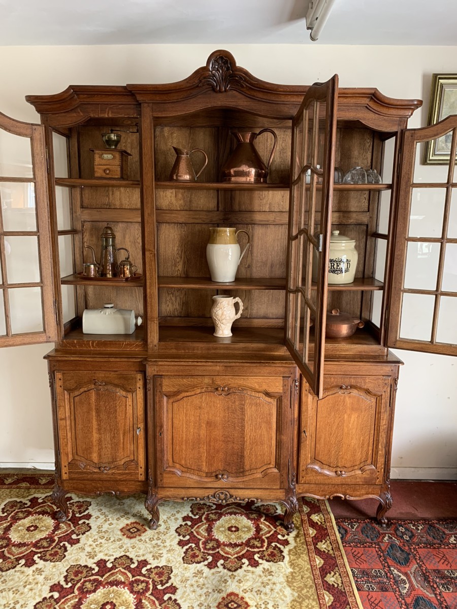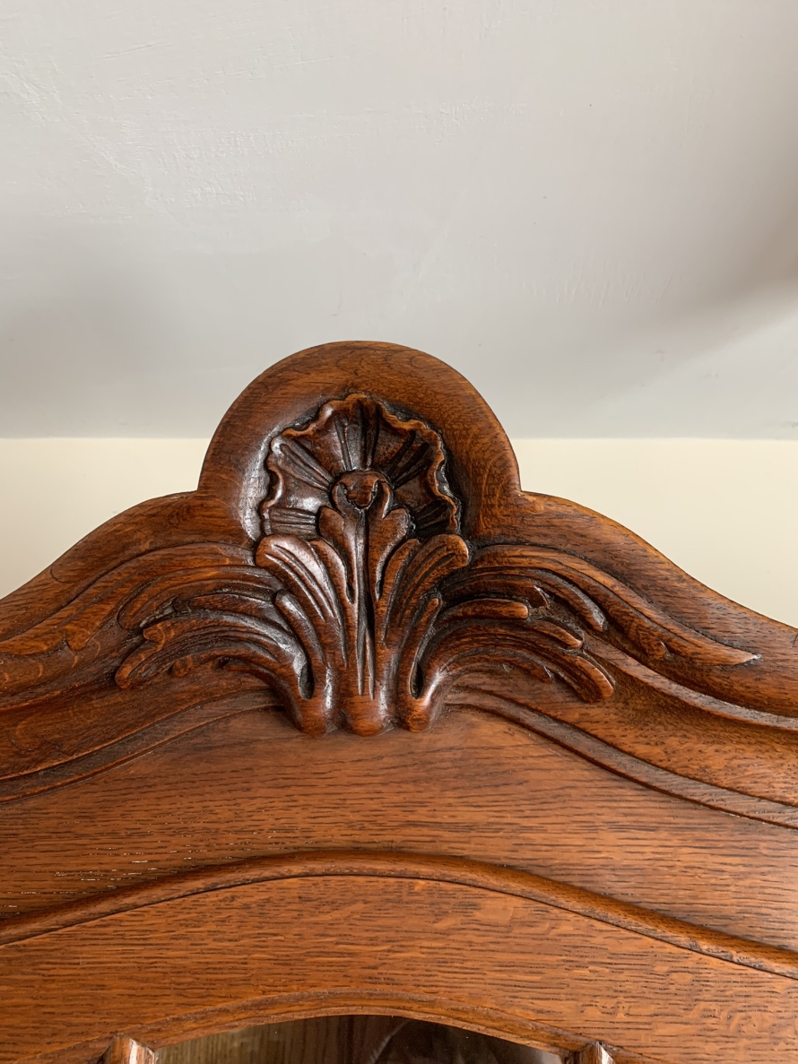 Made in glorious solid oak this cabinet dates circa 1920. The oversailing top rises to a decorative central carving. Three lockable glazed doors, the central door are brakefront the doors open to reveal two removable shelves. The top section is glazed to the sides, below are three lockable shaped recessed panelled doors, the central door is breakefront, the doors open to reveal a removable shelf. Recessed panelled sides, shaped skirt with decorative central carving this stunning French cabinet stands on four carved cabriole legs to the front.